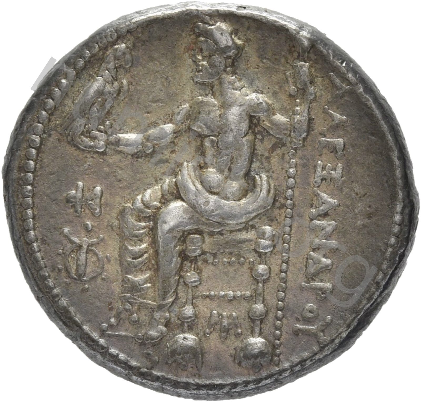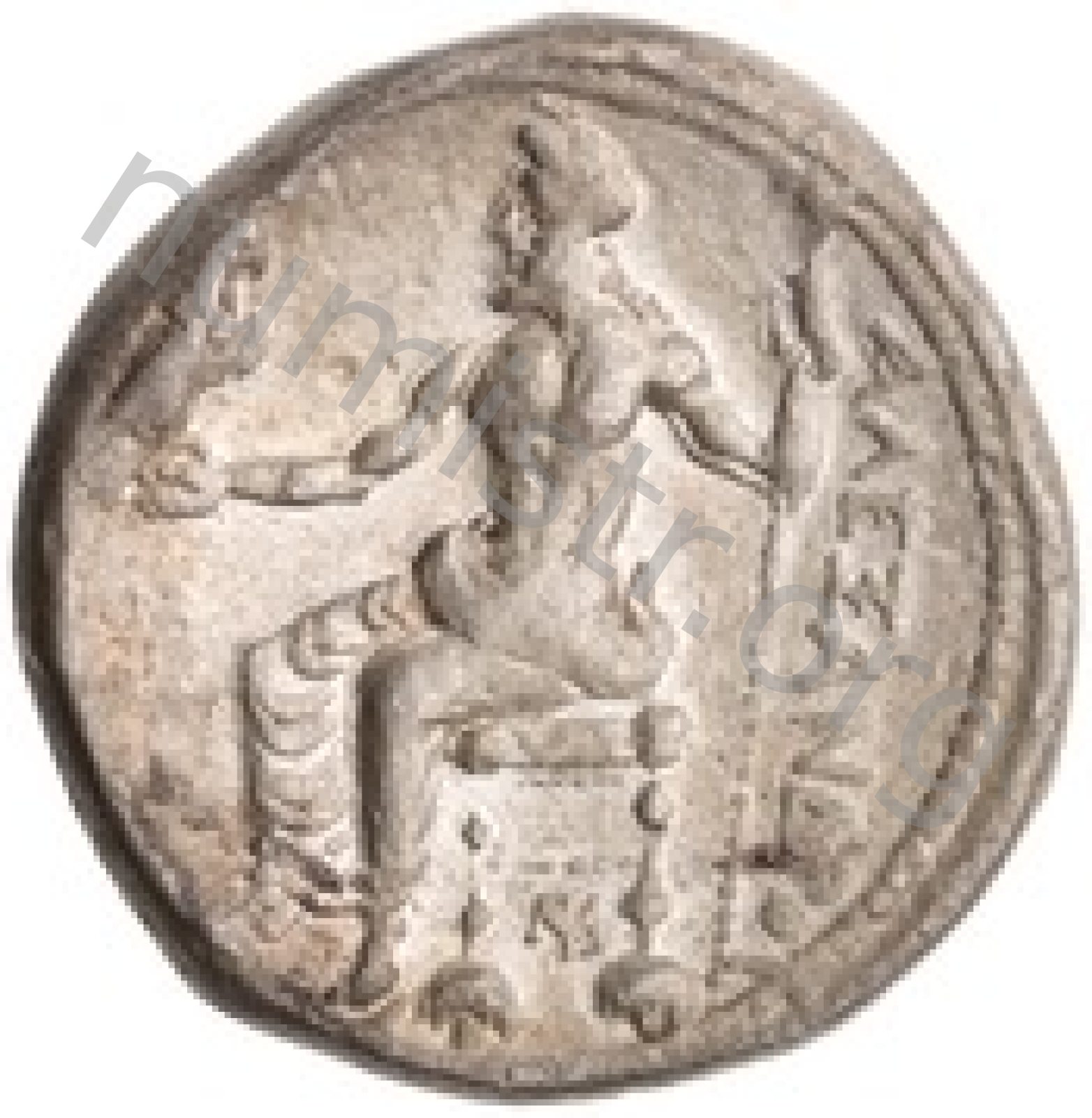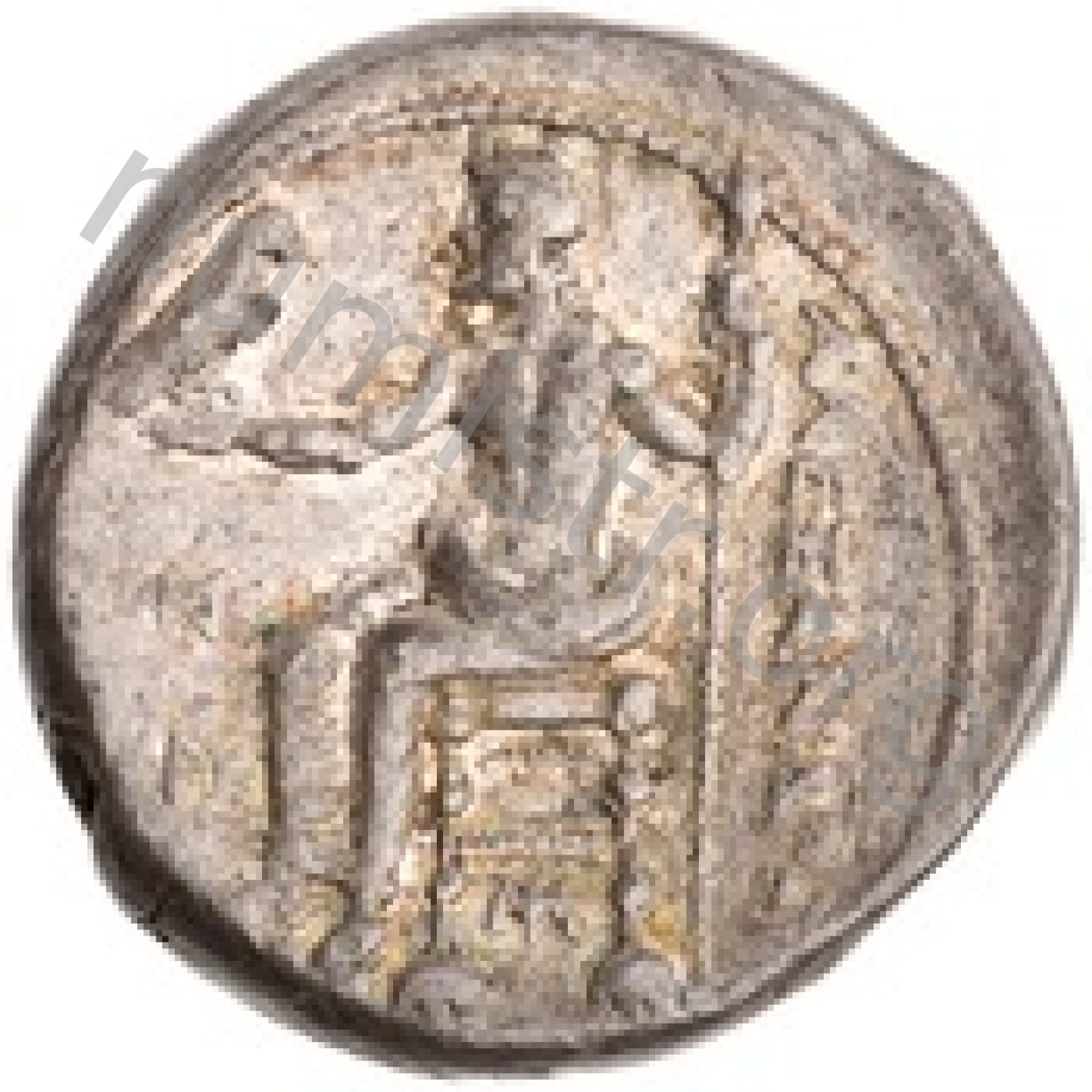 Zeus seated on stool-throne left eagle on outstretched right hand sceptre in left hand -[en]