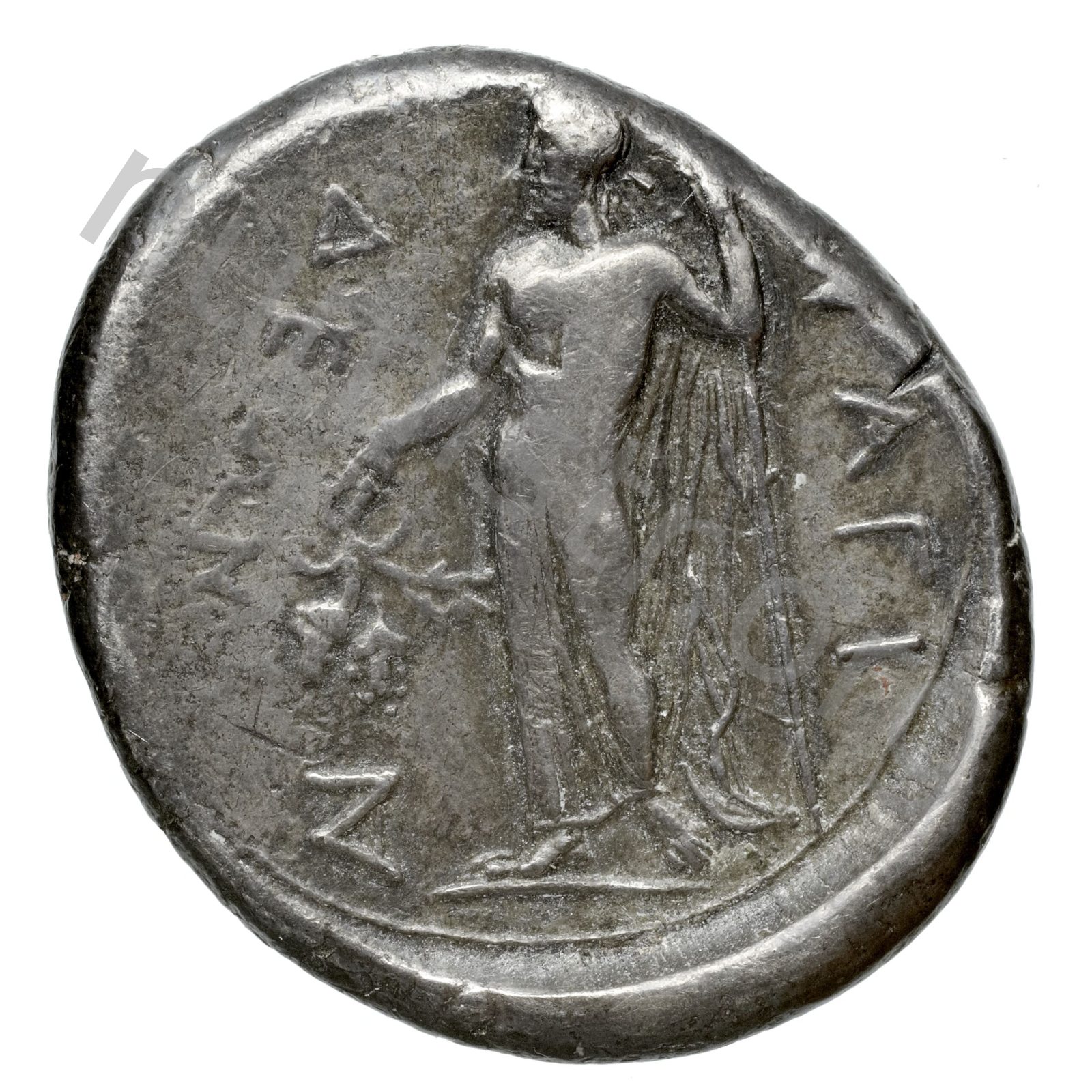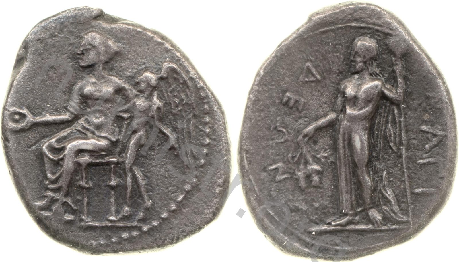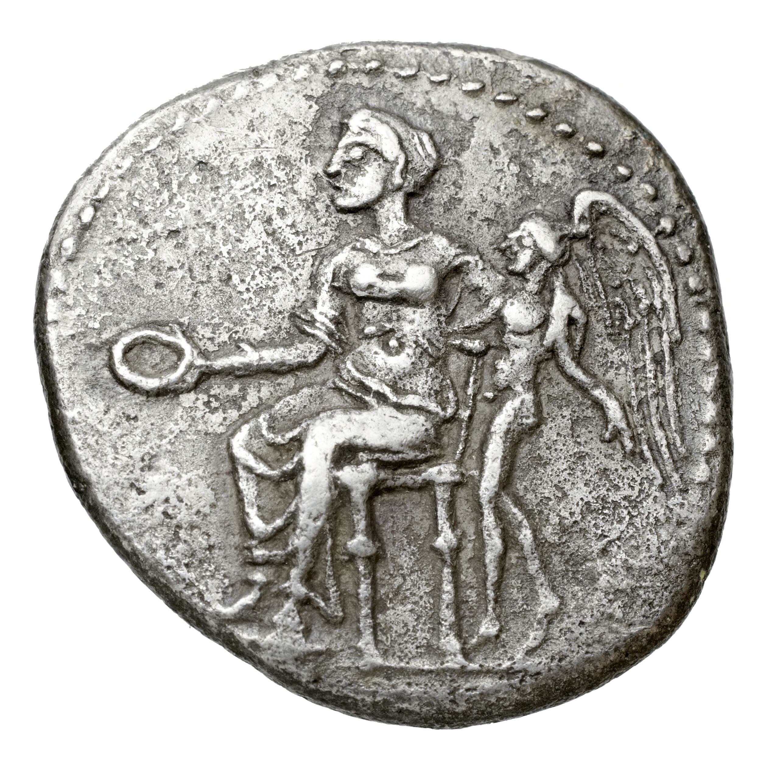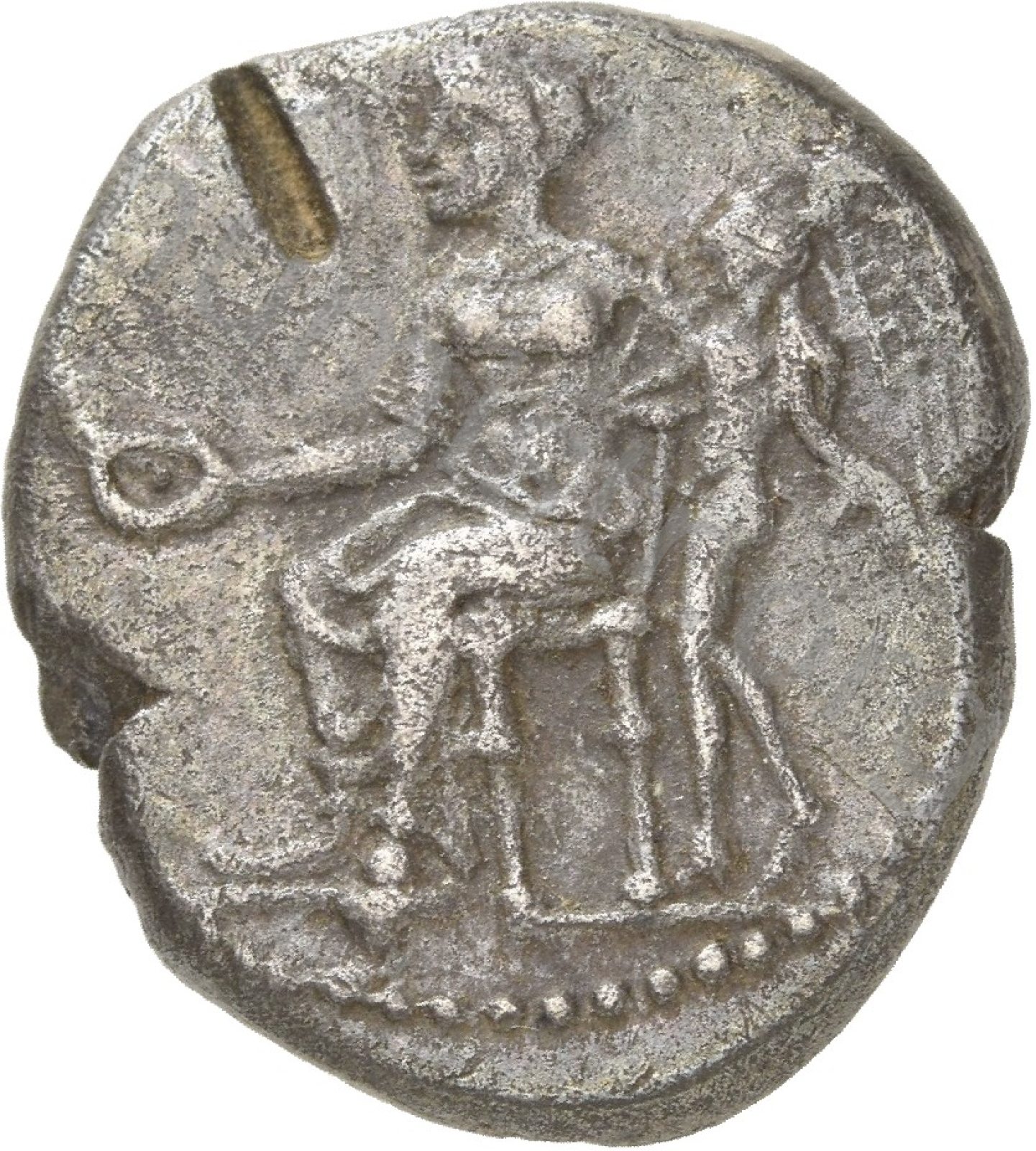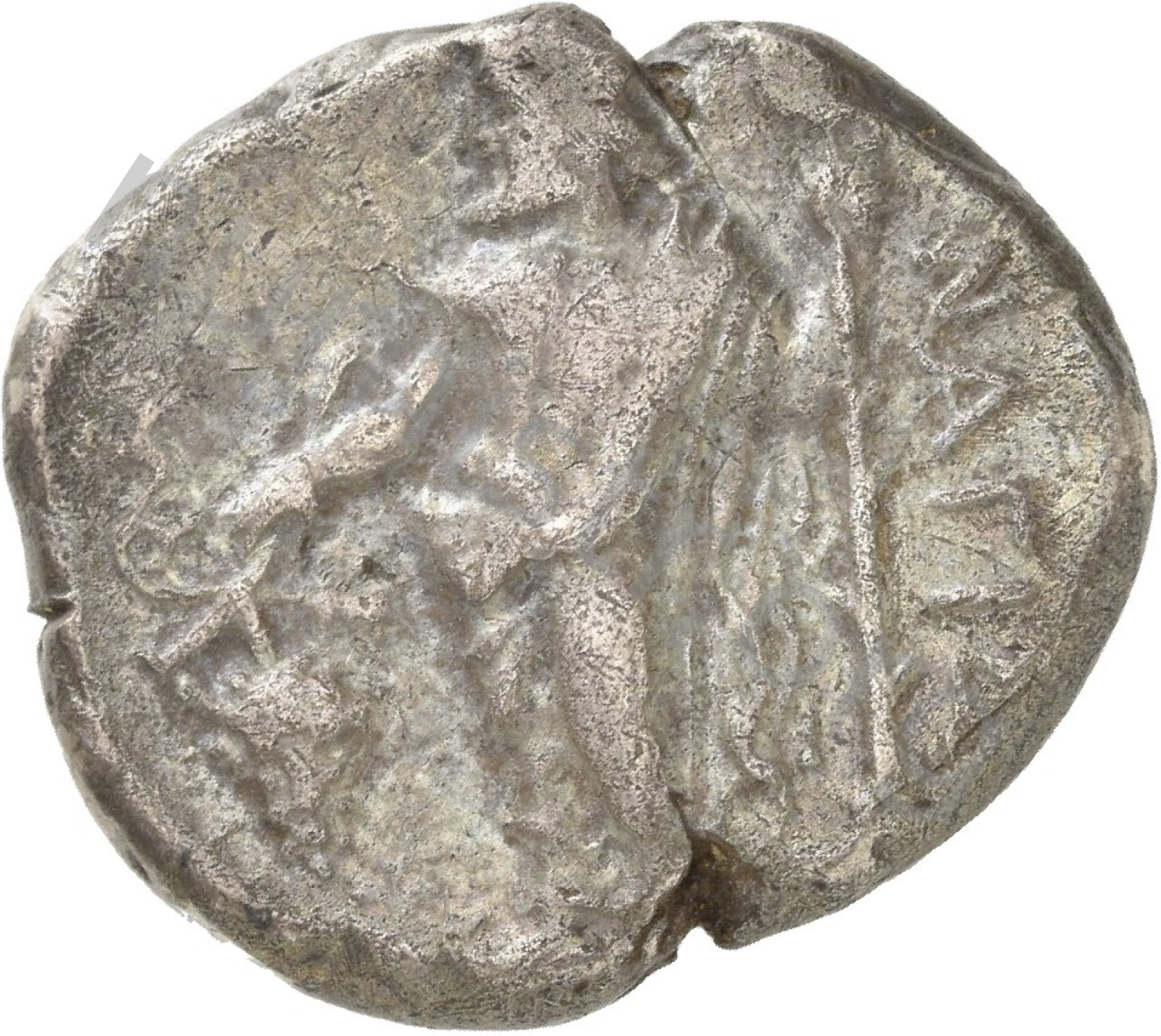 Aphrodite seated on a chair wearing a sphendone (ribbon) draped holding a phiale (ritual bowl); in the right field Eros wings open holding out a wreath towards Aphrodite -[en]