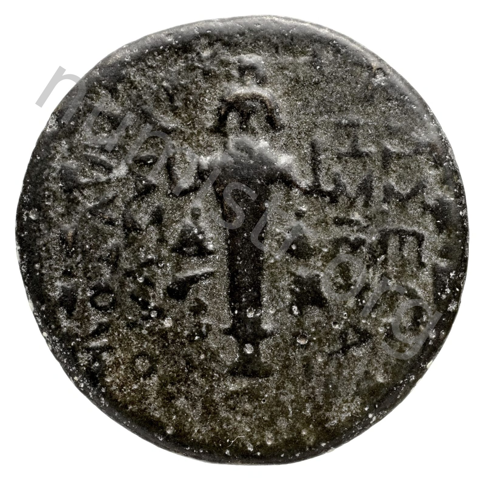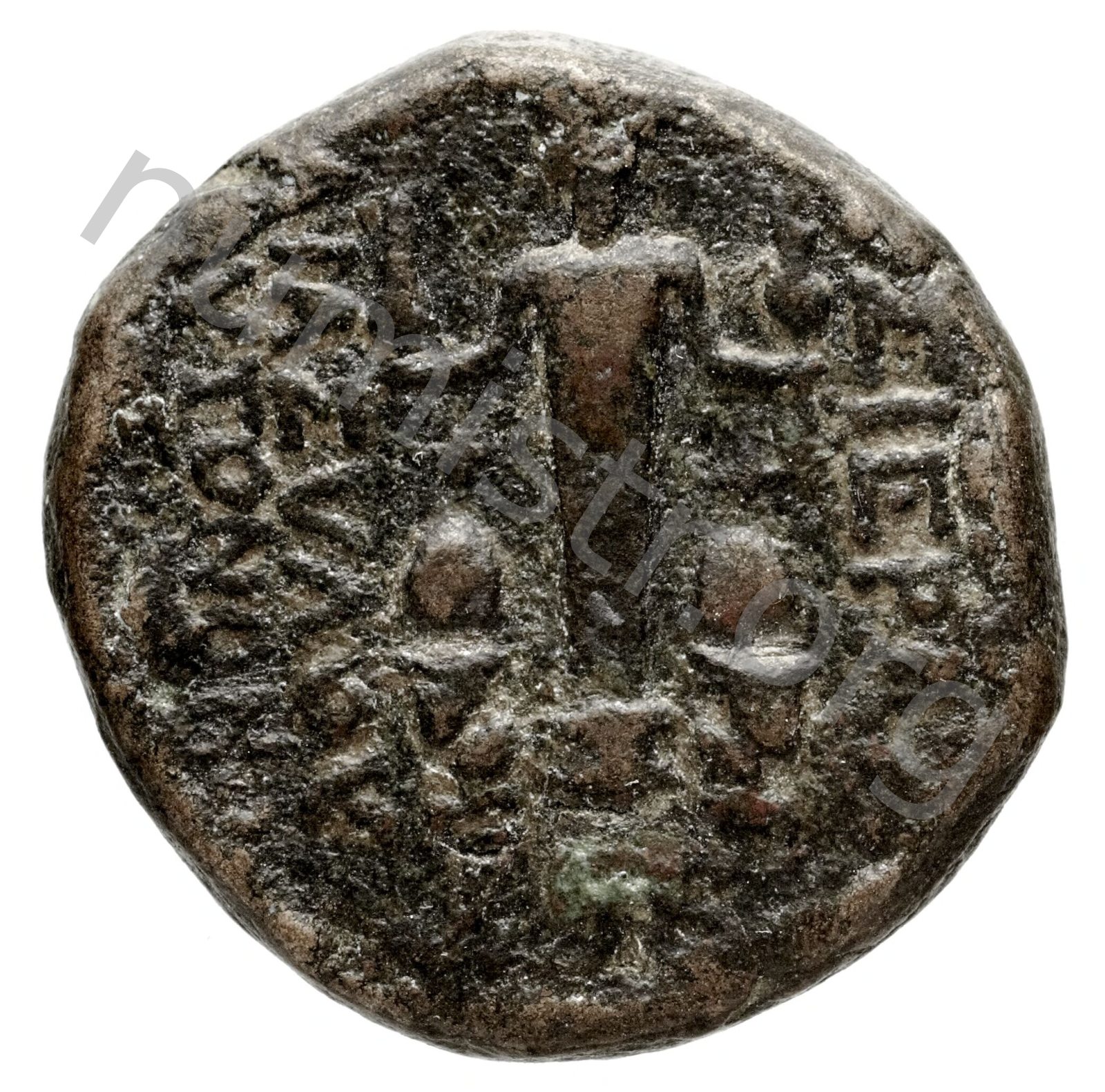 Cult-statue of Baal of Rhosus on a saquare basis between foreparts of two bulls charging -[en]