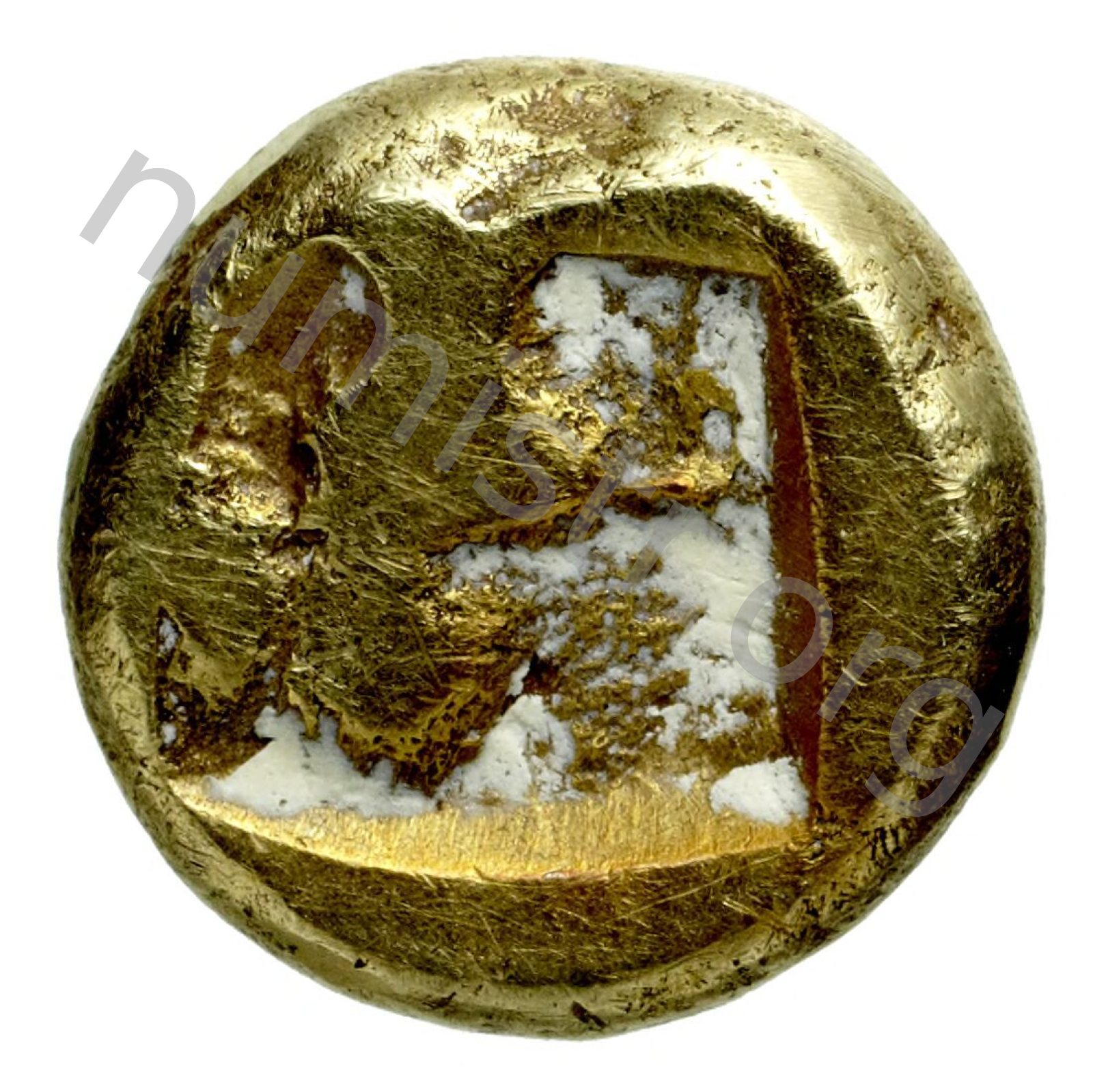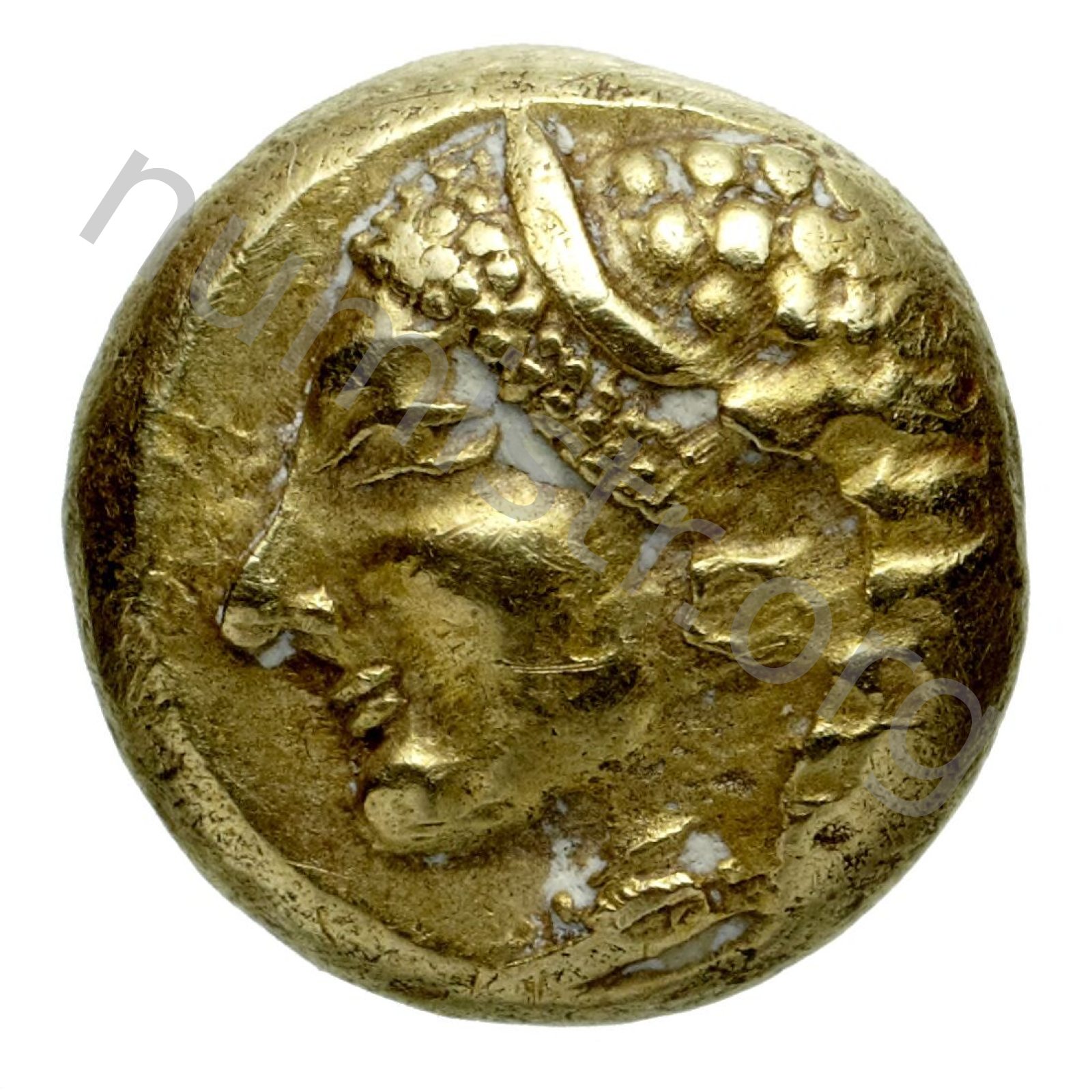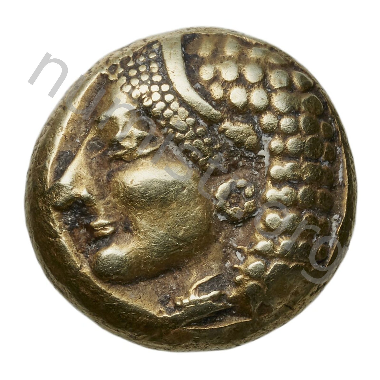Archaic female head wearing a pearl tiara braided hair adorned with earrings; seal -[en]