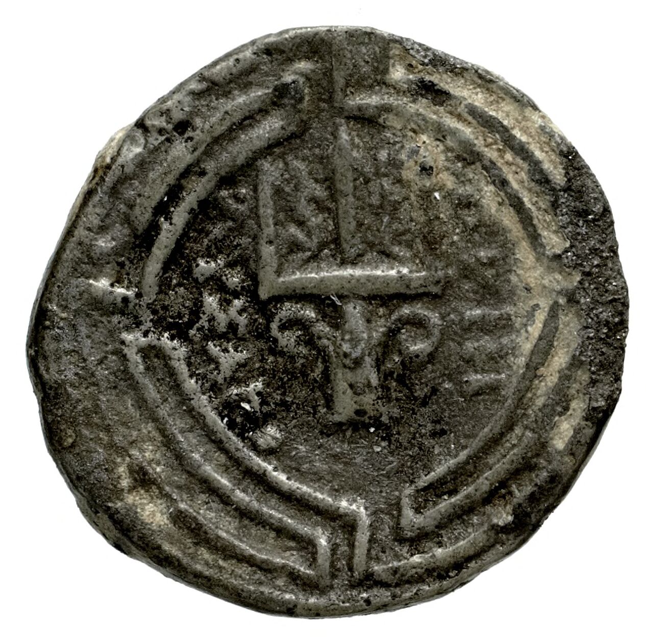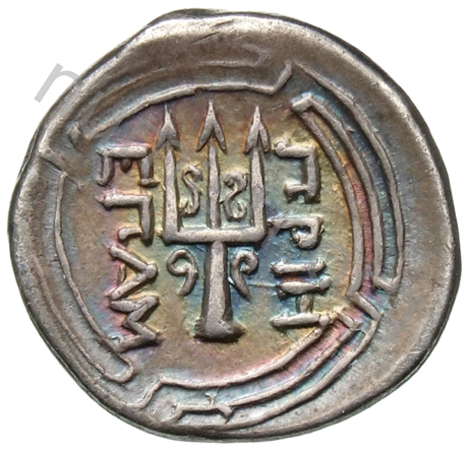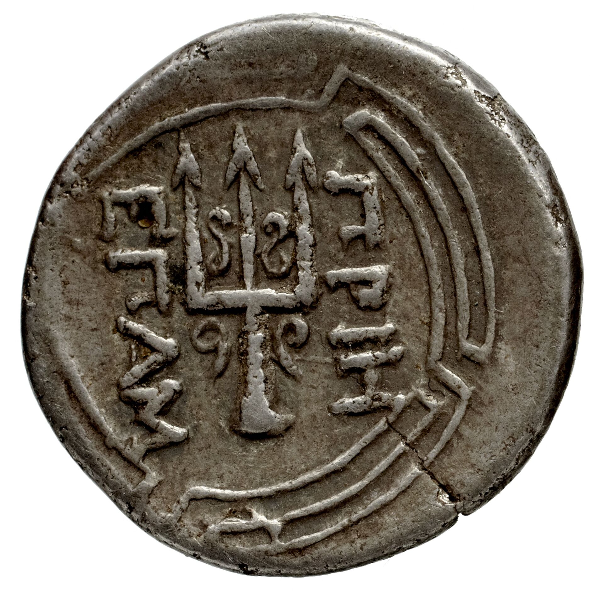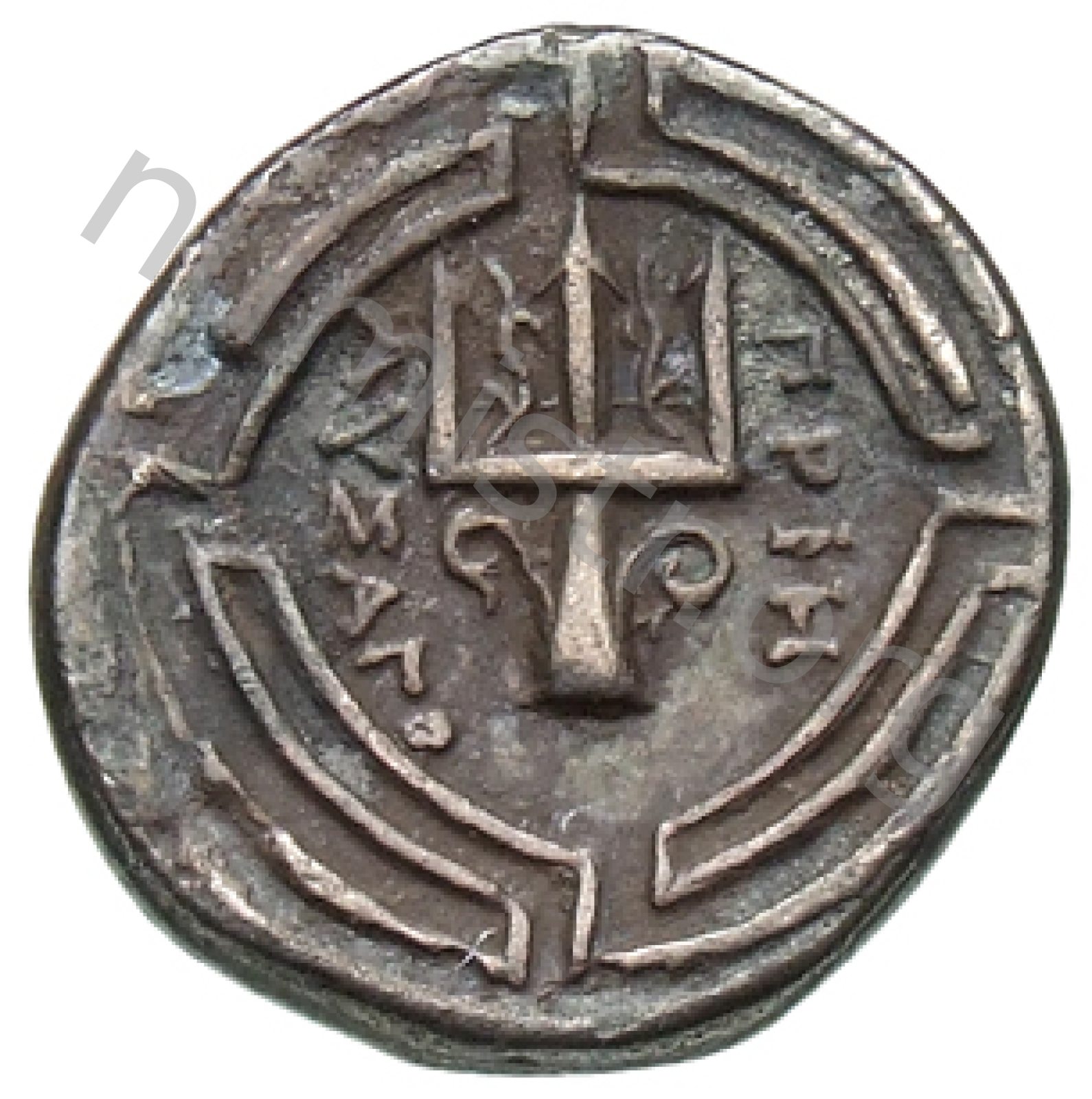 Dairesel bir kıvrım deseni içinde üç dişli ve efsane