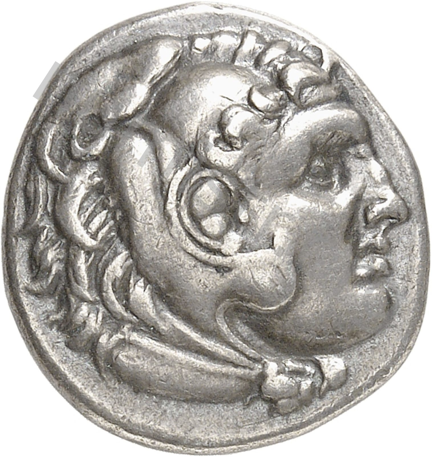Head of beardless Heracles right wearing lion skin headdress -[en]