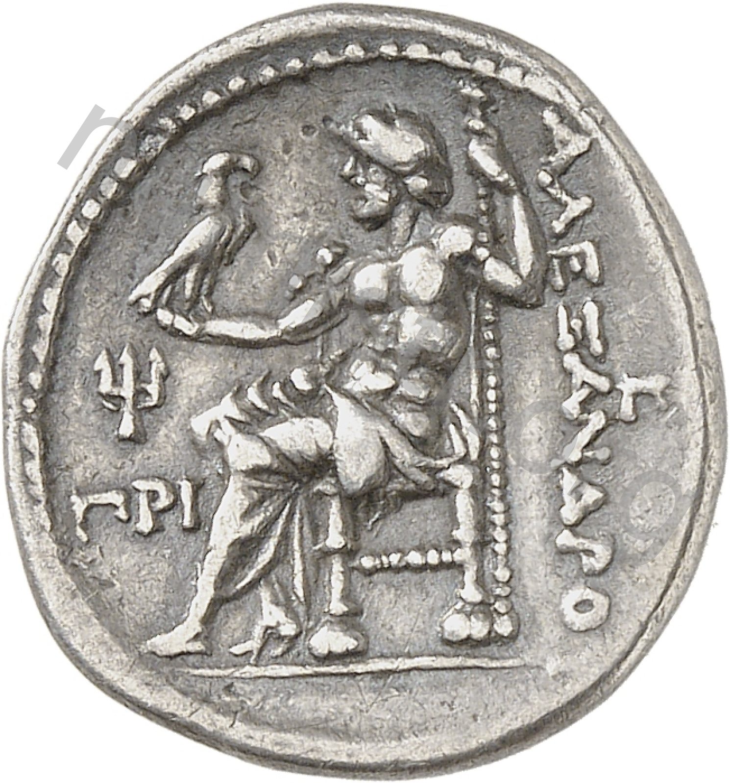 Zeus seated on stool-throne left eagle on outstretched right hand sceptre in left hand -[en]