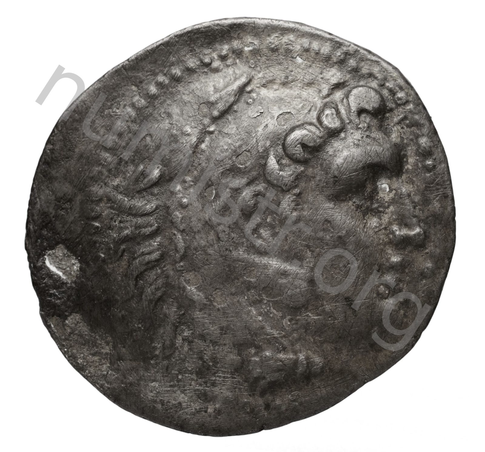 Head of beardless Heracles right wearing lion skin headdress -[en]