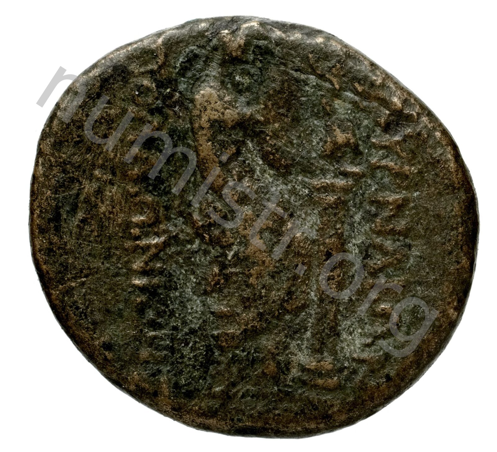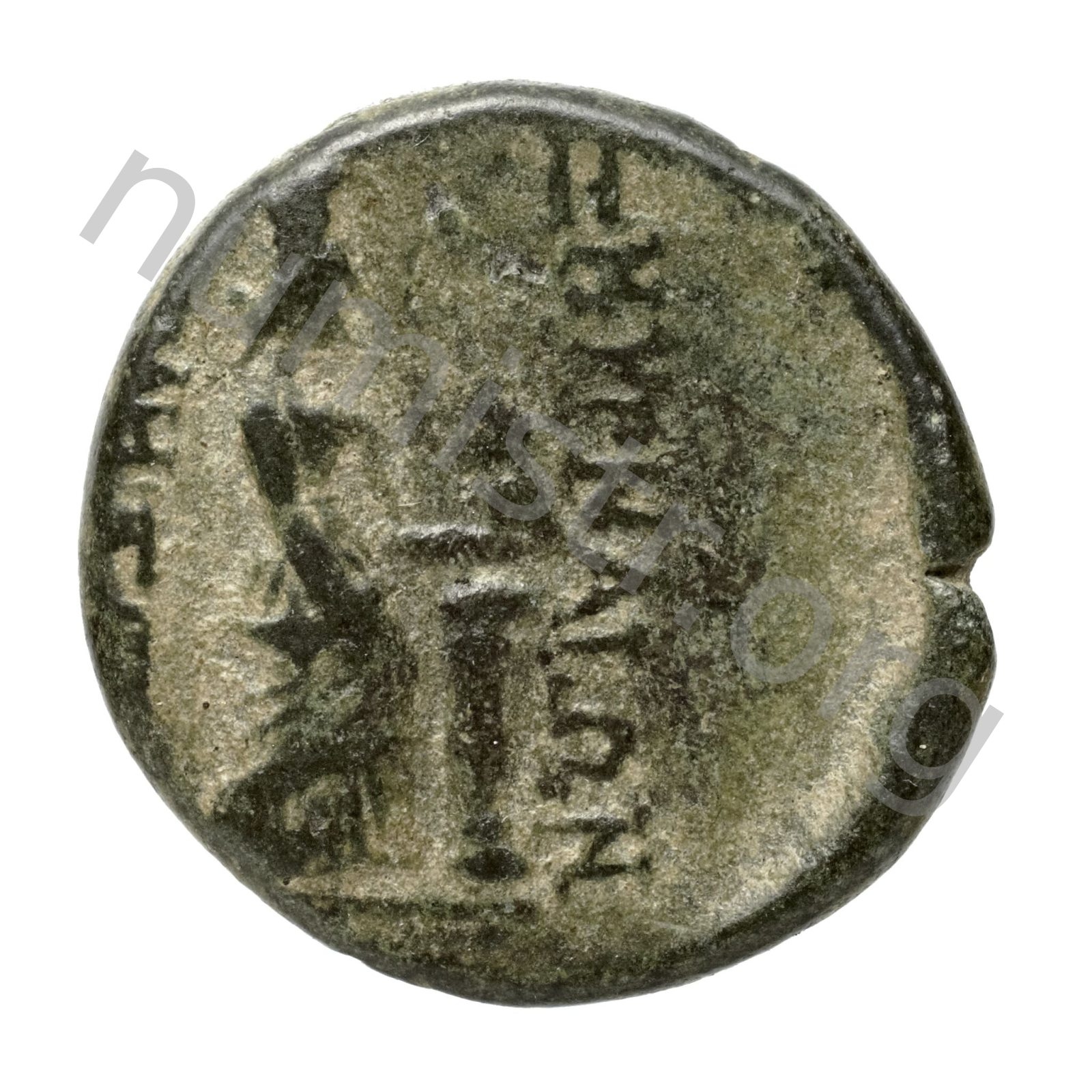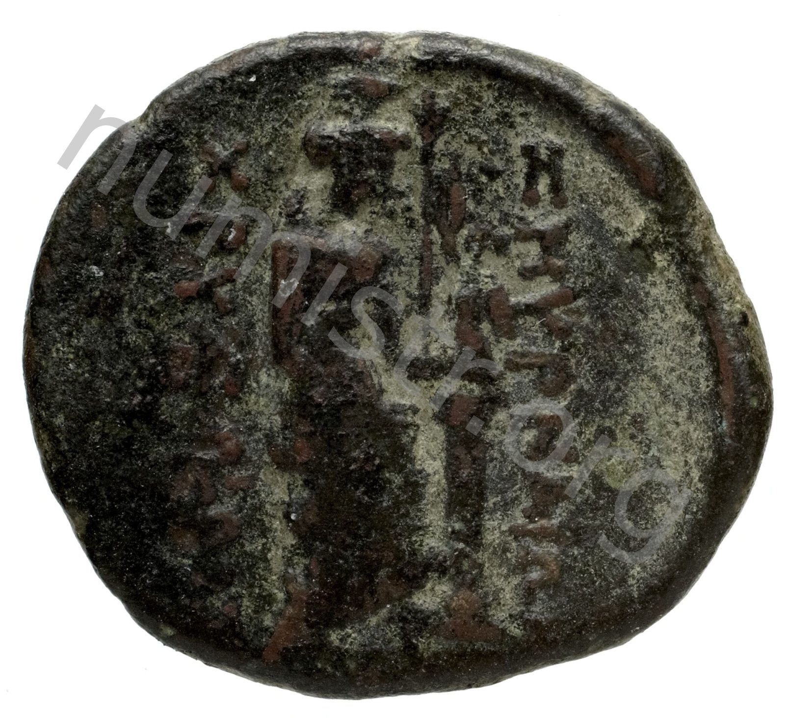 Aphrodite Stratonikis wearing a bun and a long peplos facing; over a column a victory holding a crown -[en]