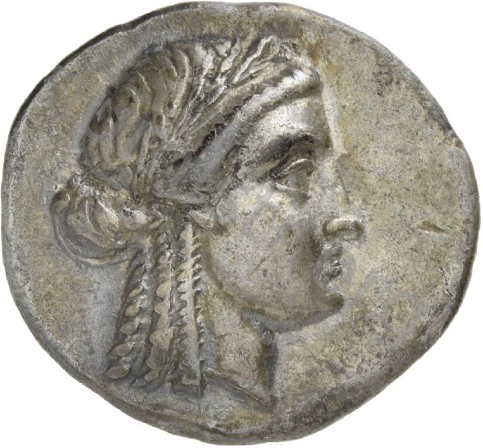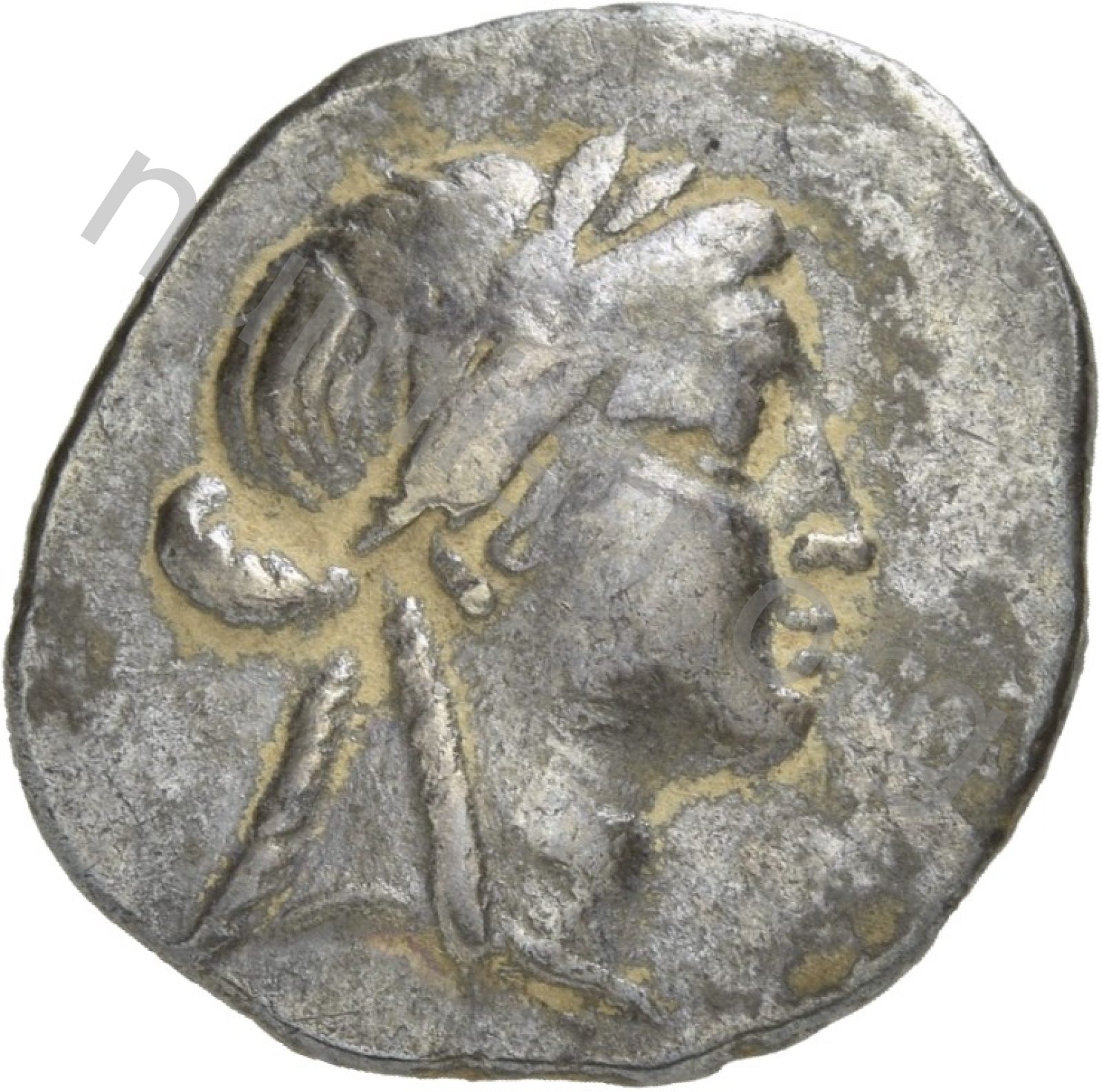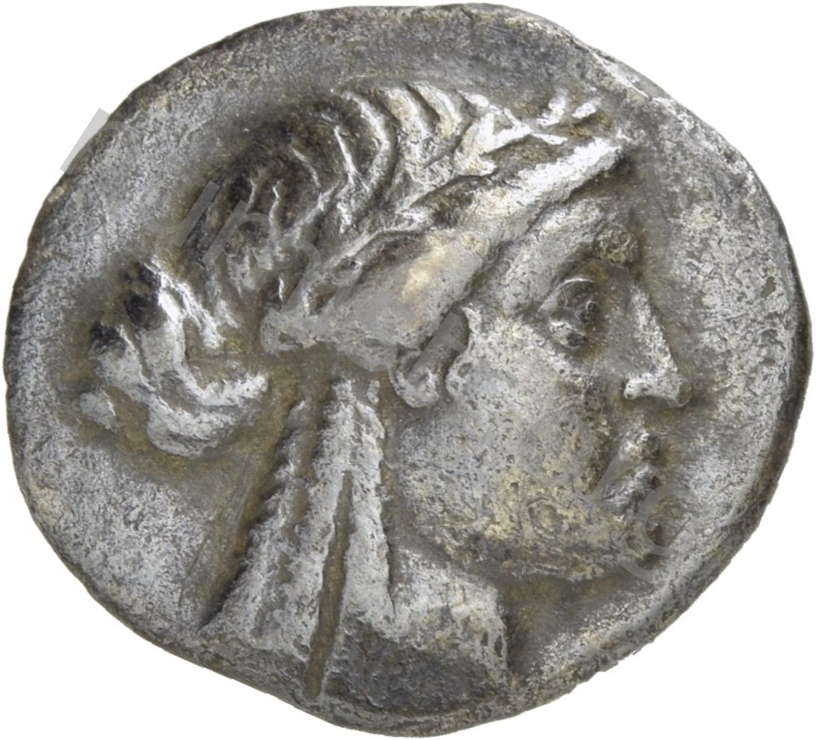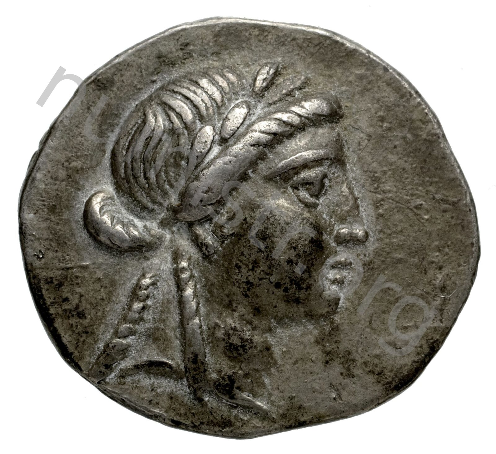 Defne çelengi ve ensesinde topuz bulunan Apollon başı
