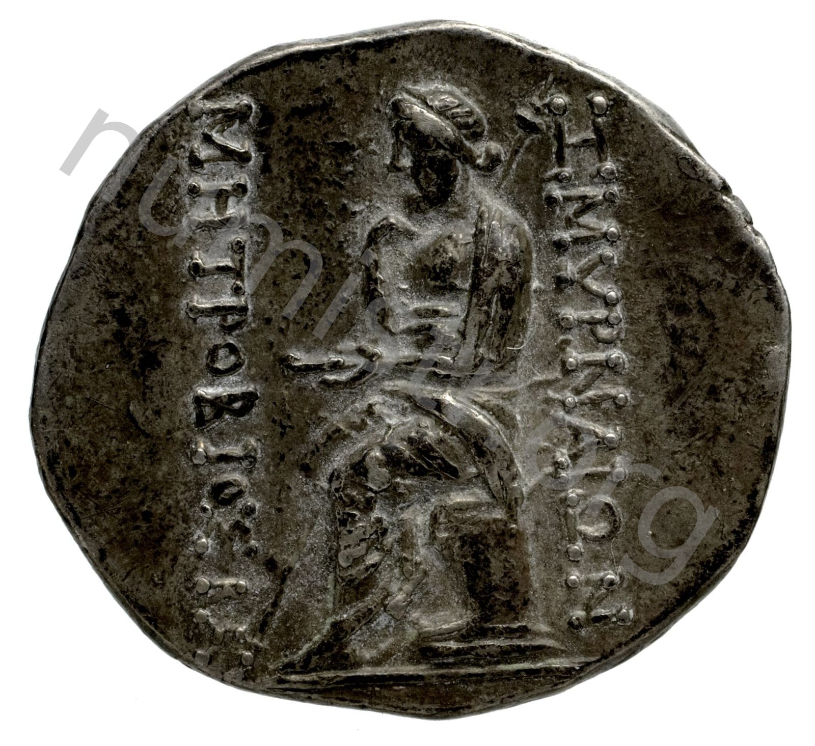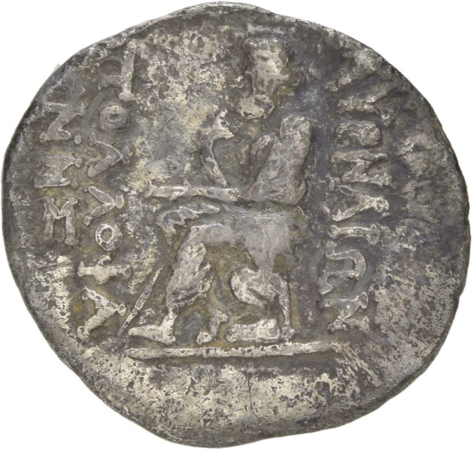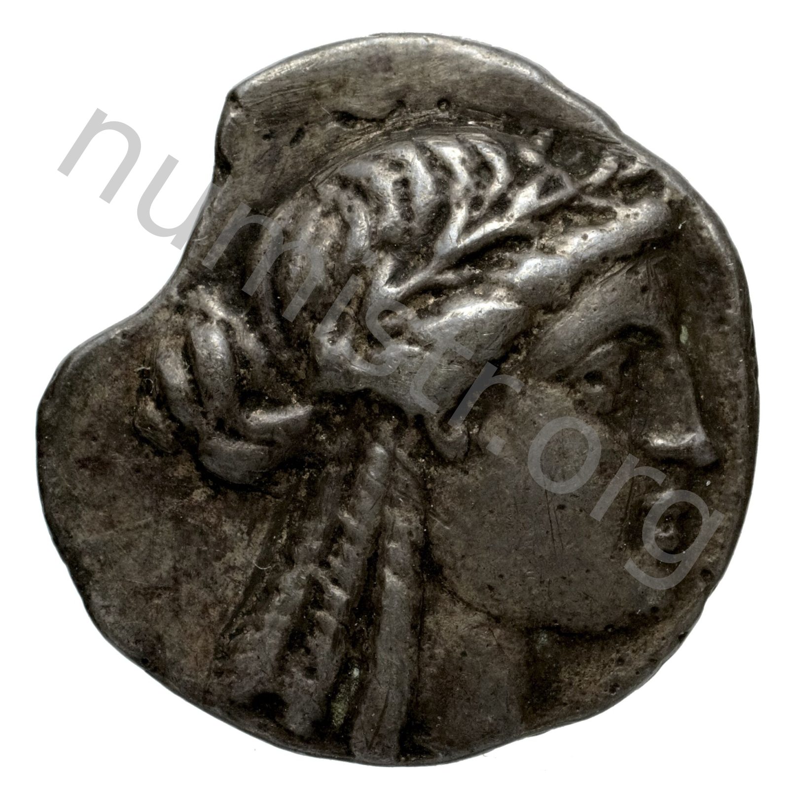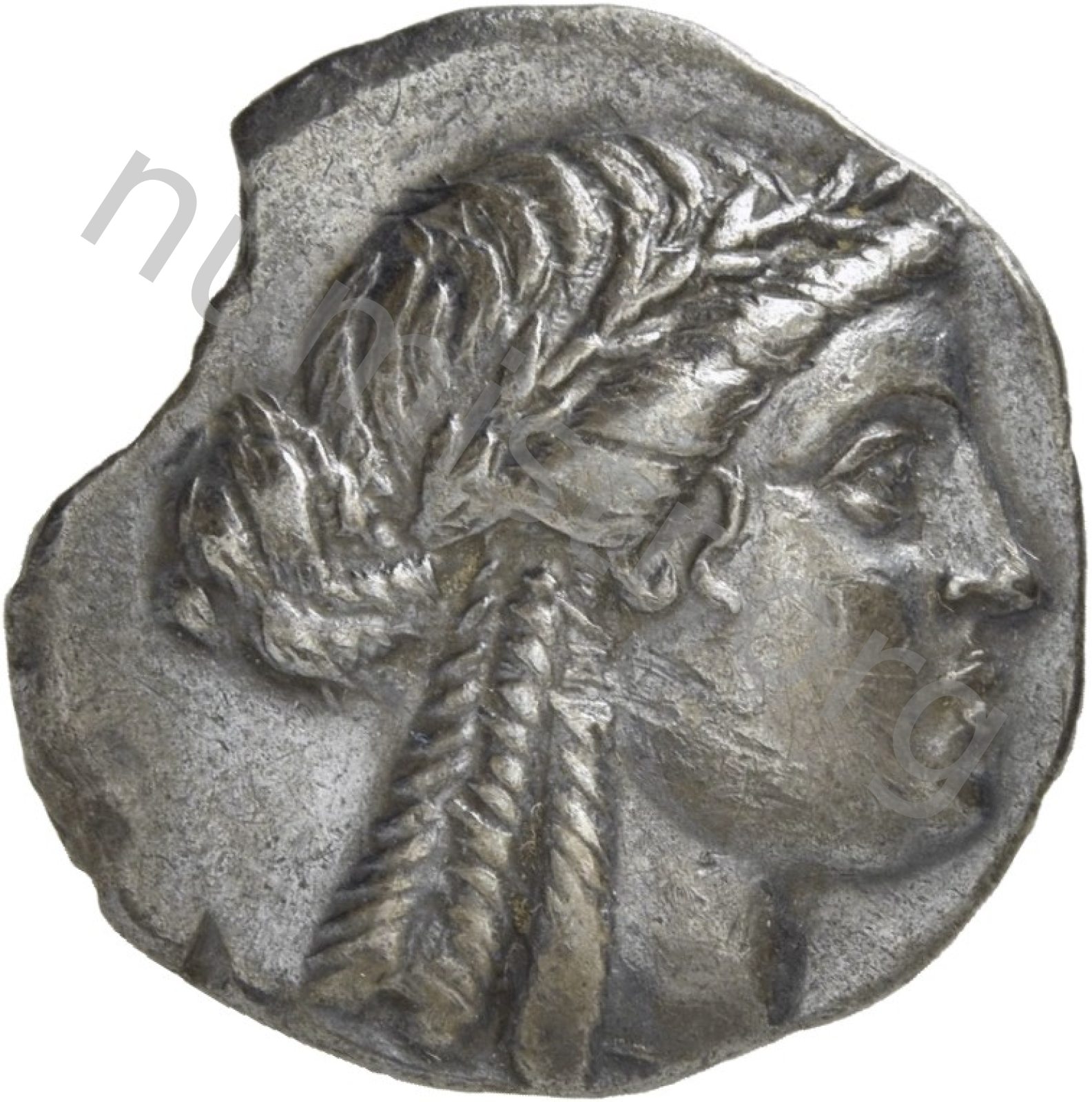 Defne çelengi ve ensesinde topuz bulunan Apollon başı