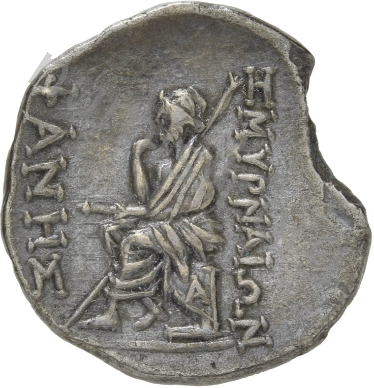 Homer seated on a diphros (movable seat) dressed in a himation (cloak) and holding a scroll -[en]
