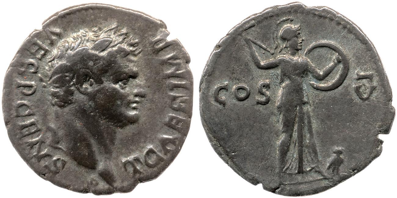 Minerva pruvanın sağında duruyor mızrak ve kalkan tutuyor; baykuş sağda