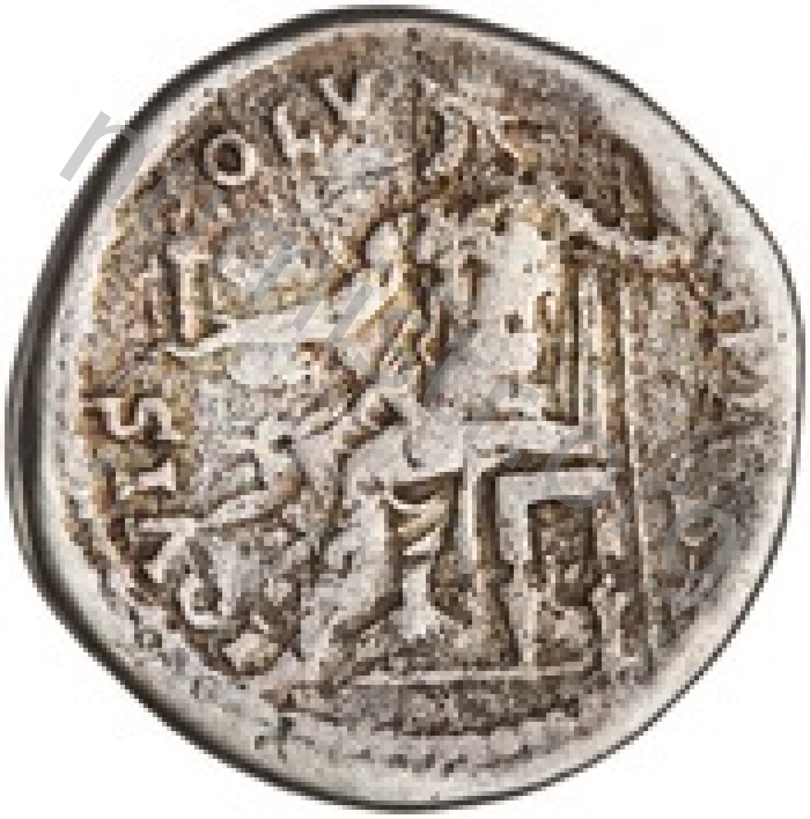 Jupiter seated left on throne holding vertical sceptre up in left hand and small cult image of Ephesian Diana in extended right -[en]