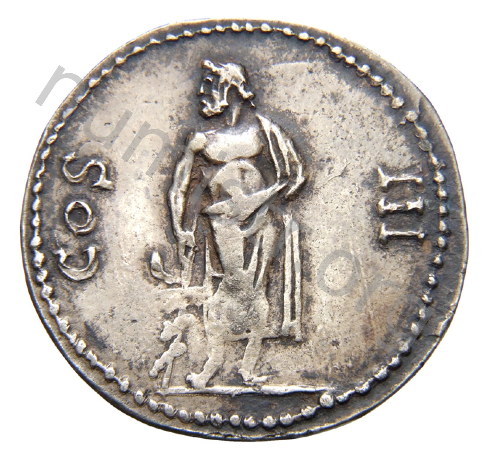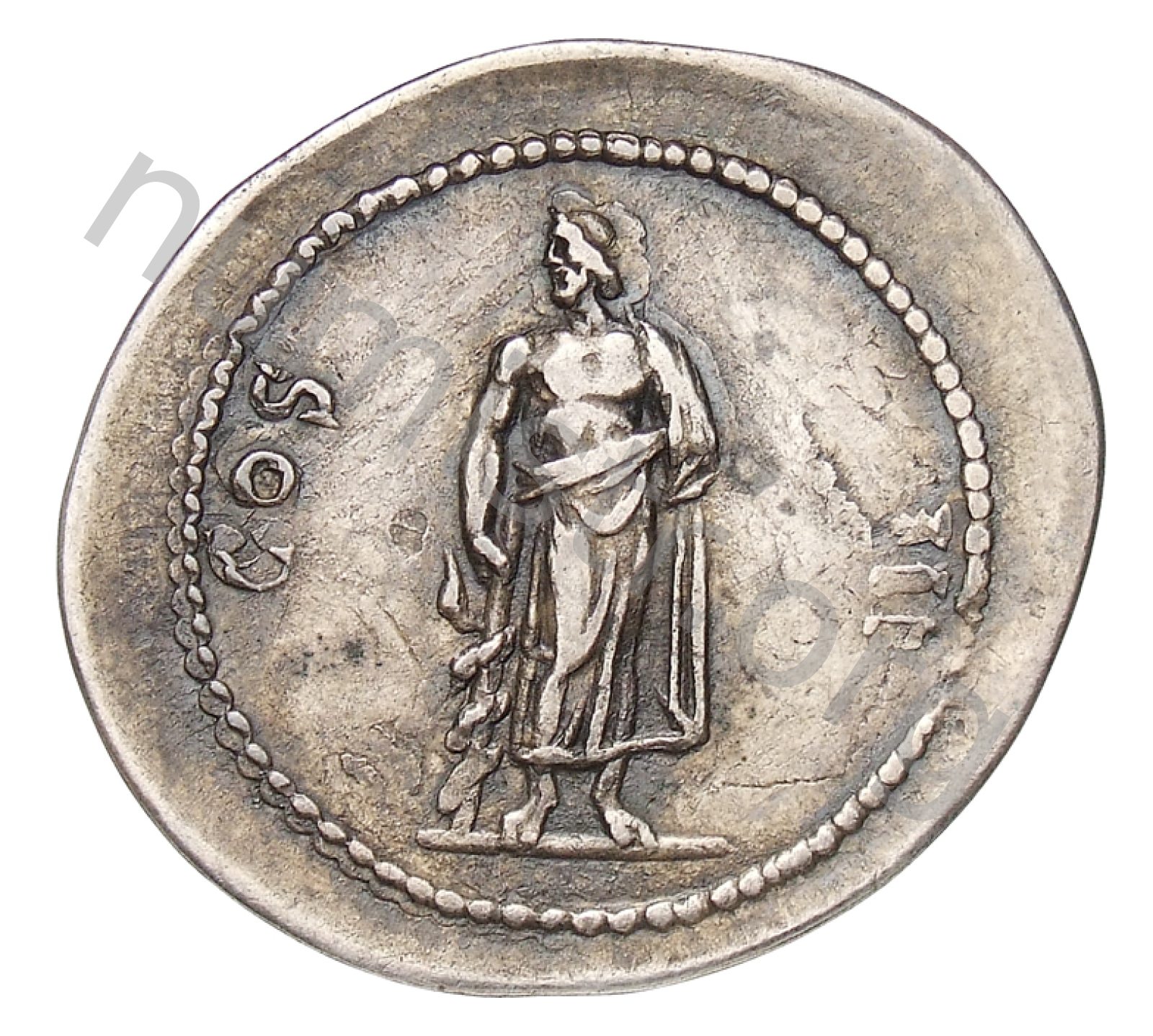 Asklepios ayakta duran önden sola bakan sağ elinde yerde yılanlarla çevrili bir asa ve yanında sol kolu tutan bir giysi giymiş