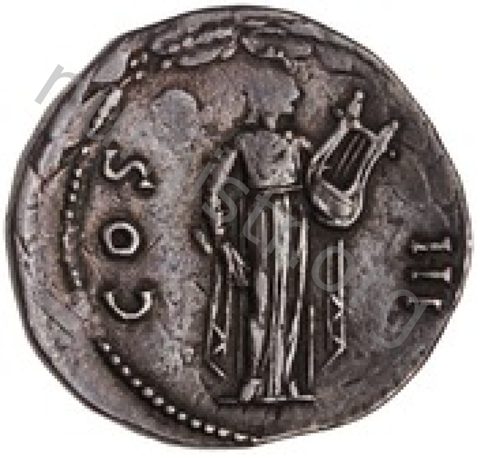 Apollo laureate wearing the robe of a citharoedus standing front holding plectrum in right hand and lyre in left -[en]
