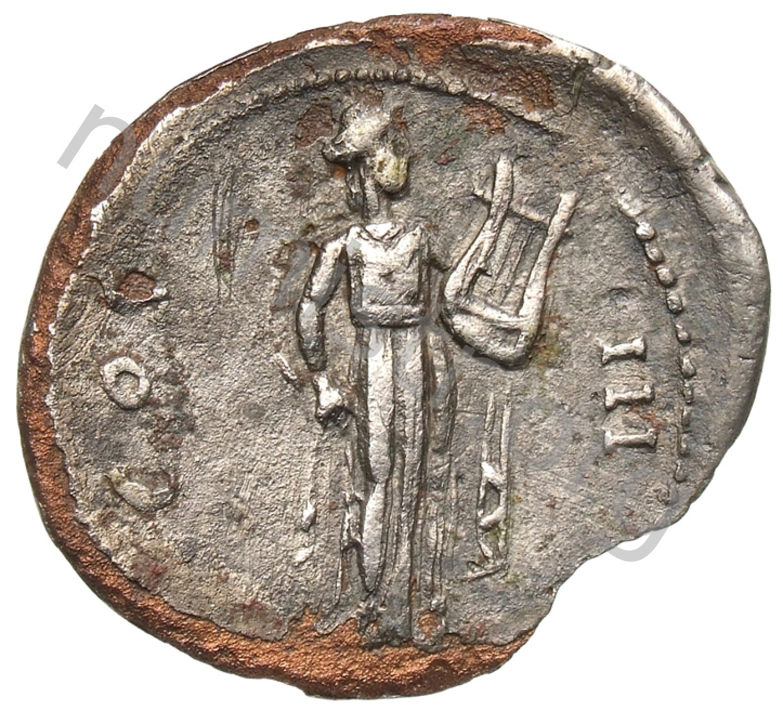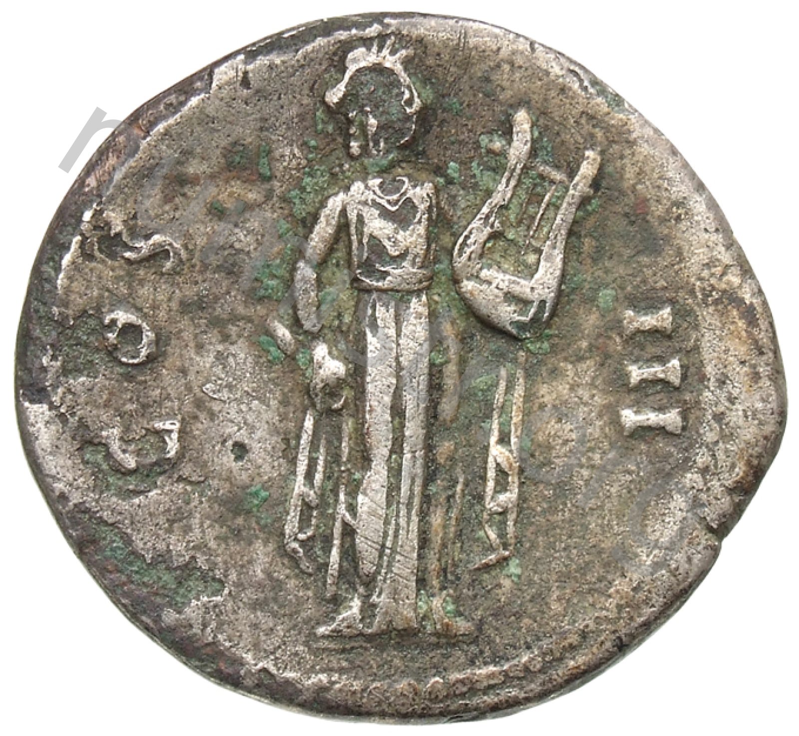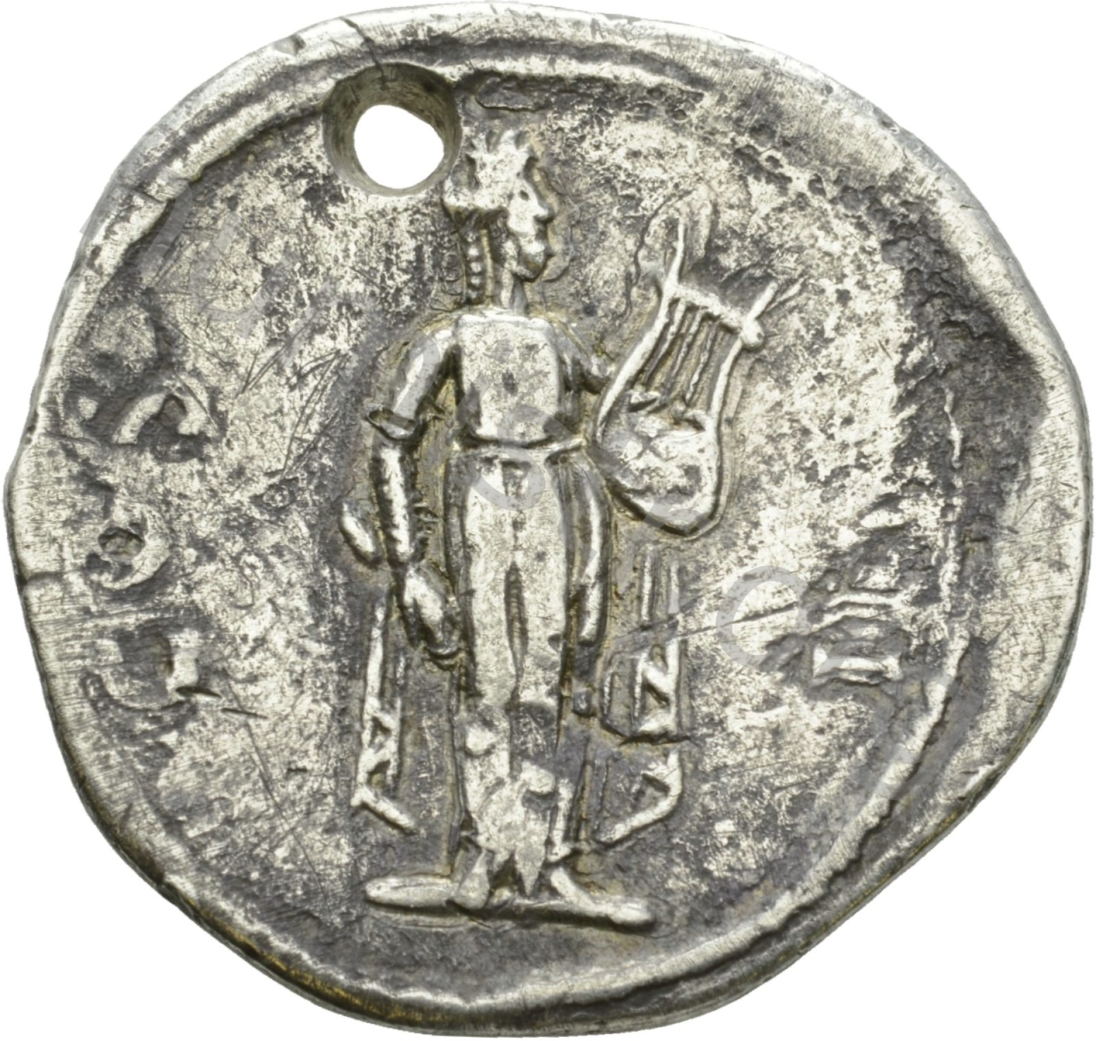 Citharoedus cübbesi giymiş Apollon ödüllü sağ elinde mızrap sol elinde lir tutarak ayakta duruyor