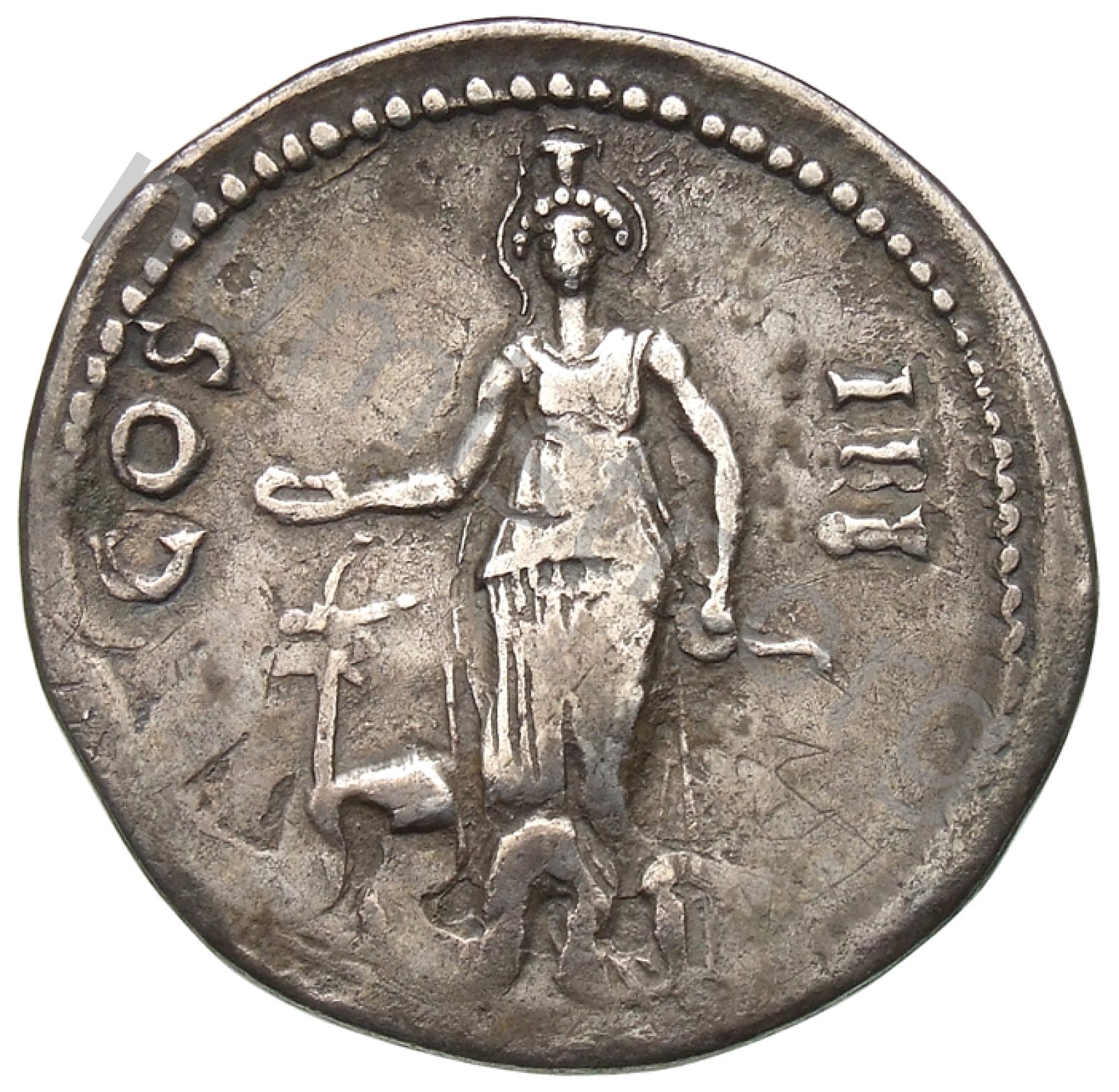 Diana sağ elinde patera sol elinde yay tutarak sola doğru açılı duruyor; sol elinde geyik