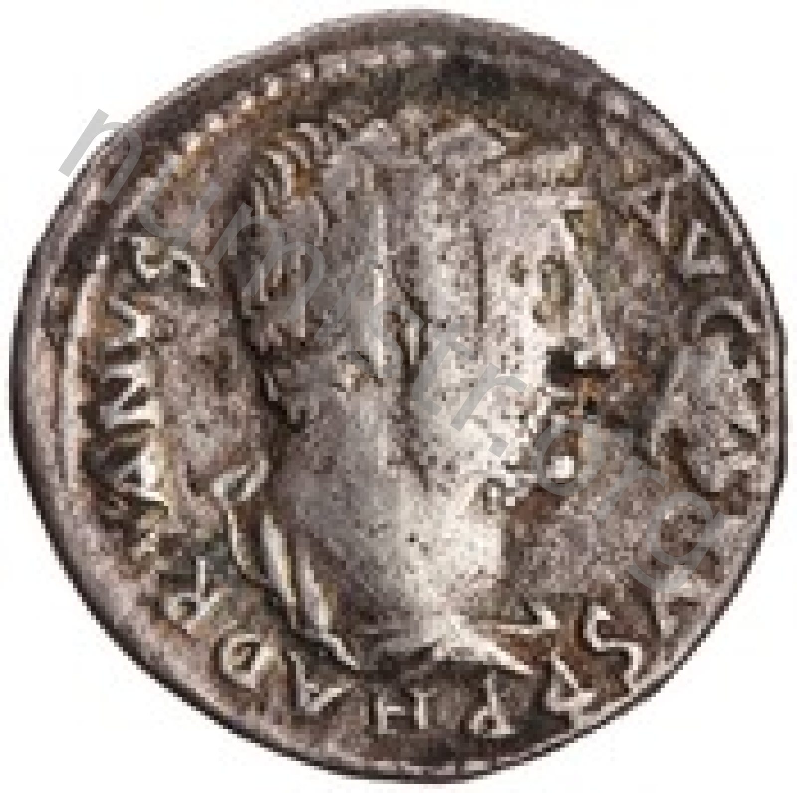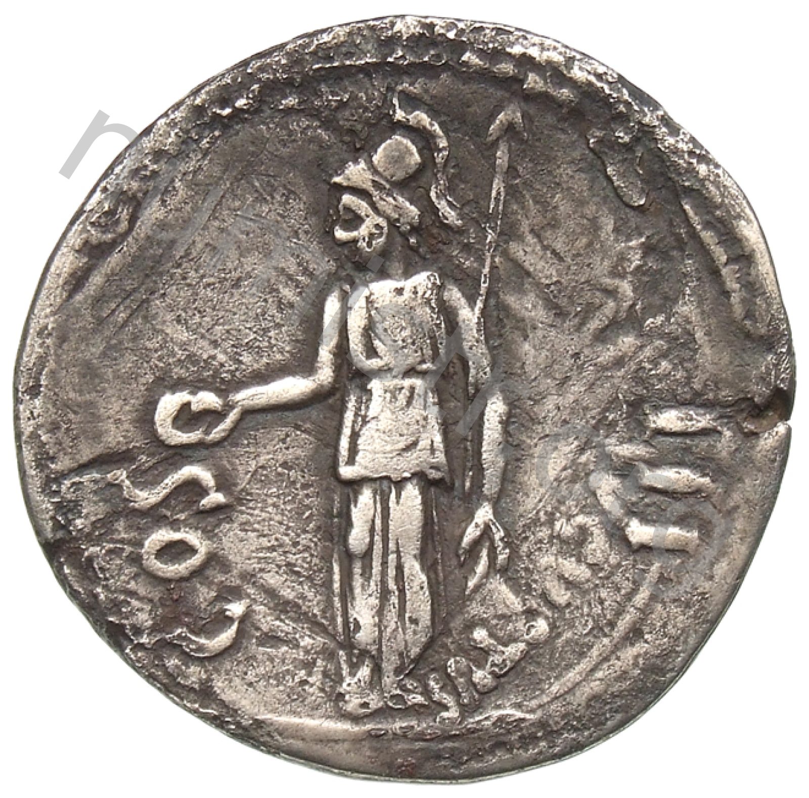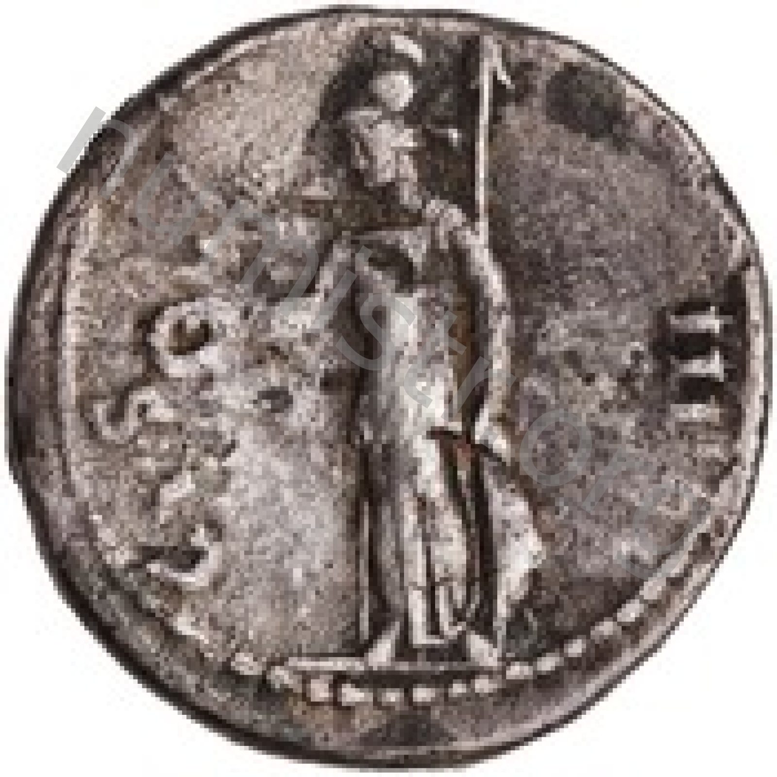 Miğferli Minerva ayakta öne doğru sola bakıyor sağ elinde patera tutuyor ve yere yerleştirilmiş kalkanın üzerinde sola yaslanıyor; mızrak sol koluna dikey olarak dayanıyor