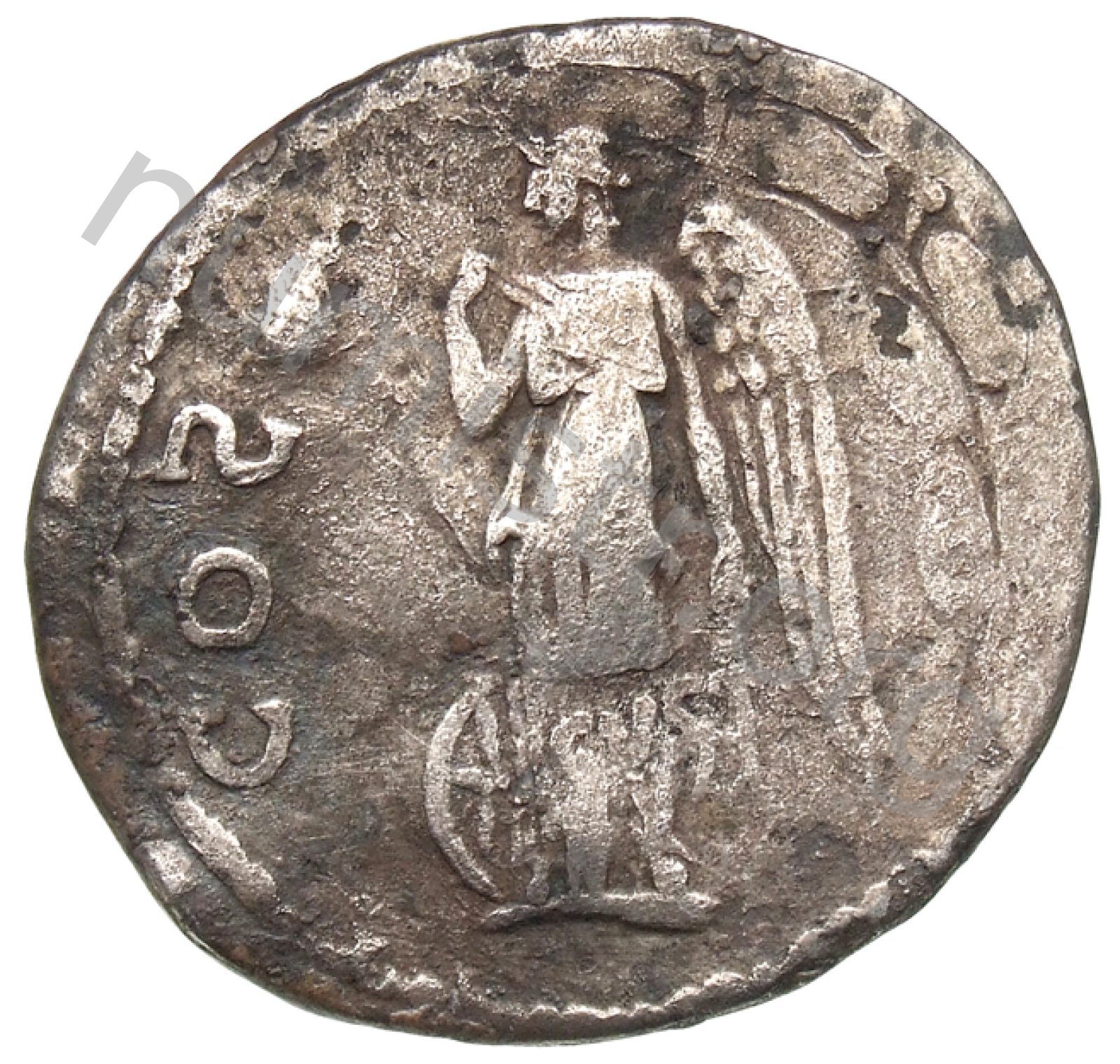 Nemesis kanatlı bir şekilde ayakta duruyor sağ eliyle bir parça örtü tutuyor sol elinde çanta var; tekerlek ayaklarının dibinde