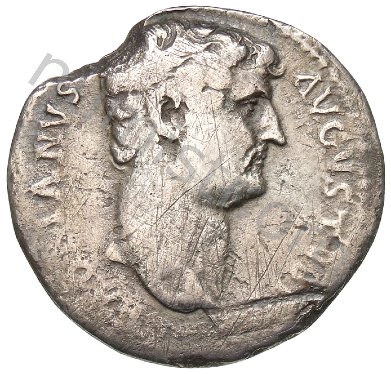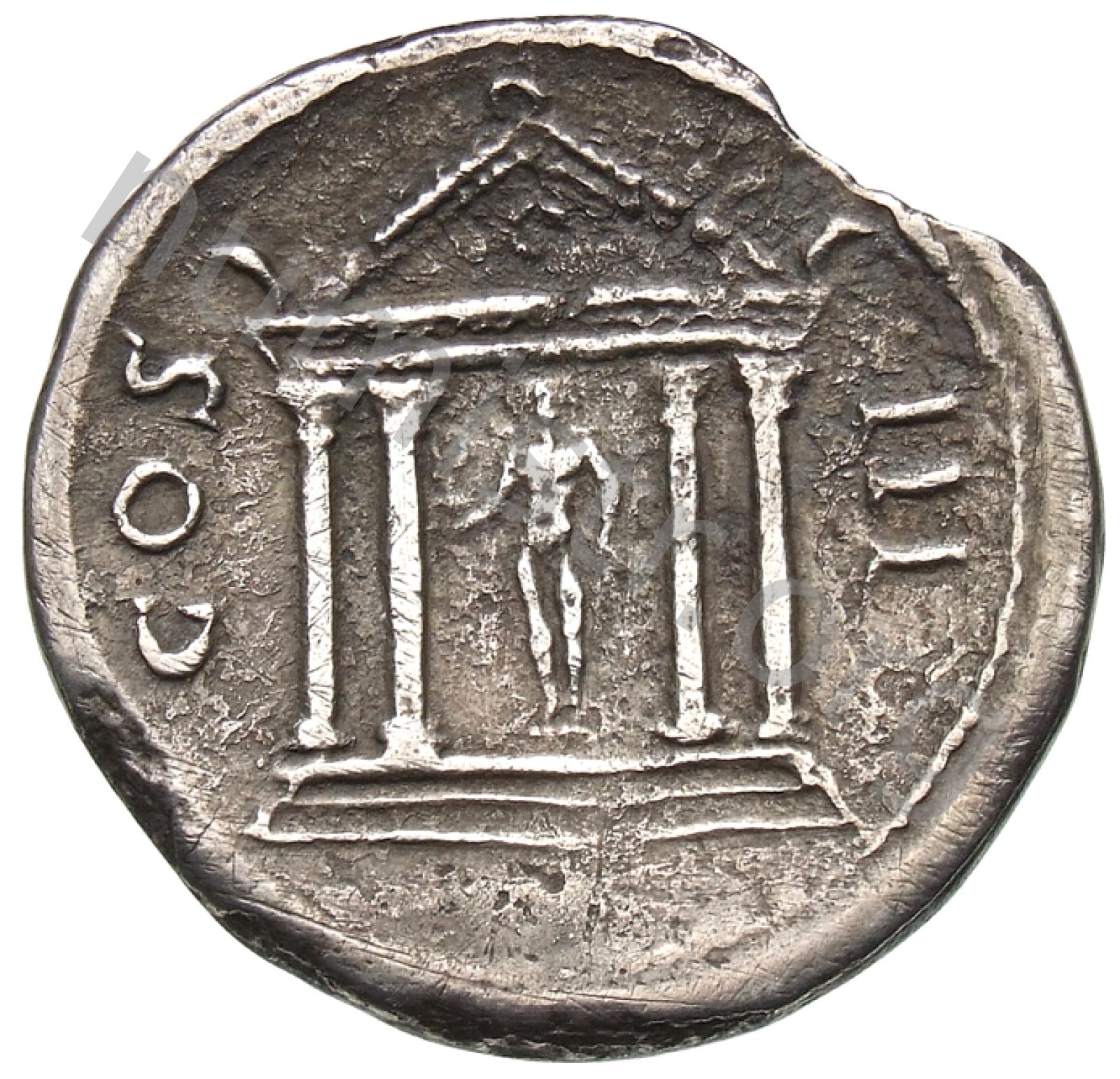 Apollo standing front holding stag and bow within tetrastyle temple -[en]