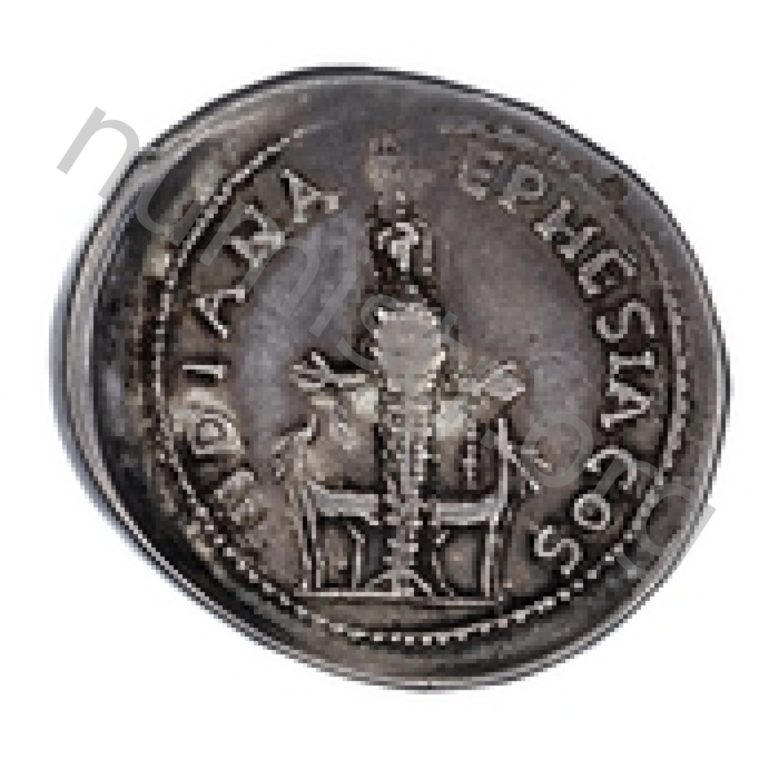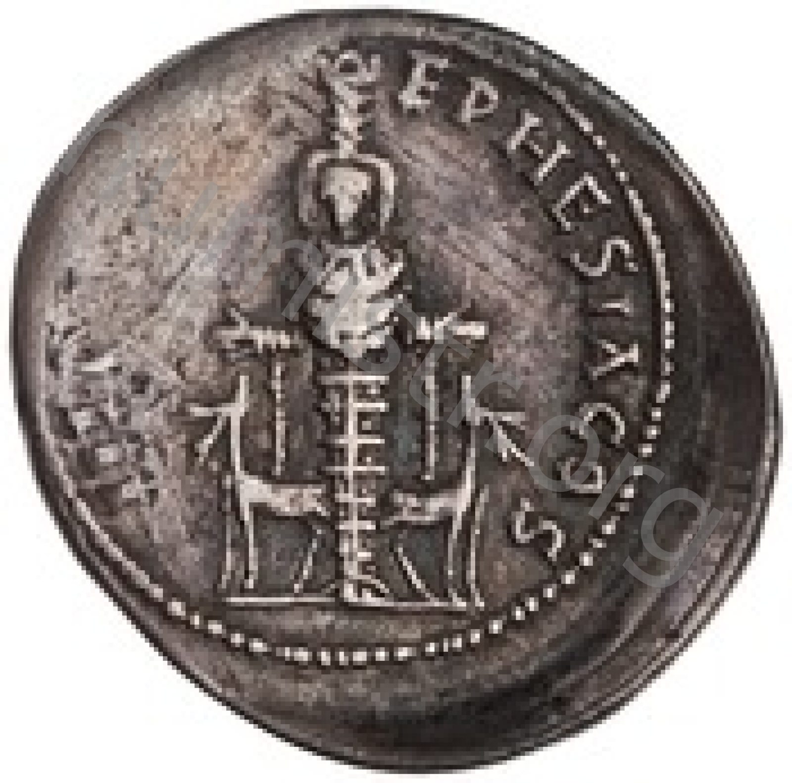 Diana Ephesia'nın yüksek başlığı peçesi ve bileklerinde fileleri olan ön kollarını sağa ve sola doğru uzatmış geyiklerin kendisine baktığı kült görüntüsü