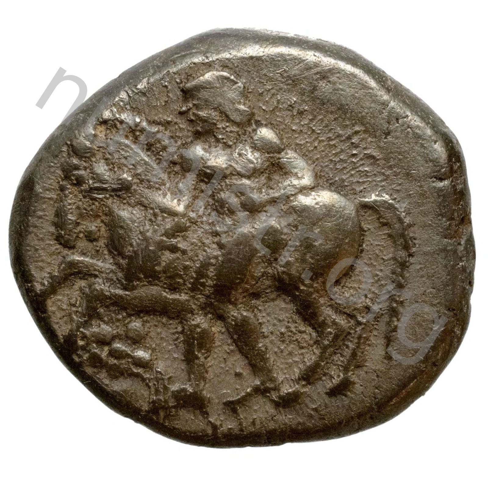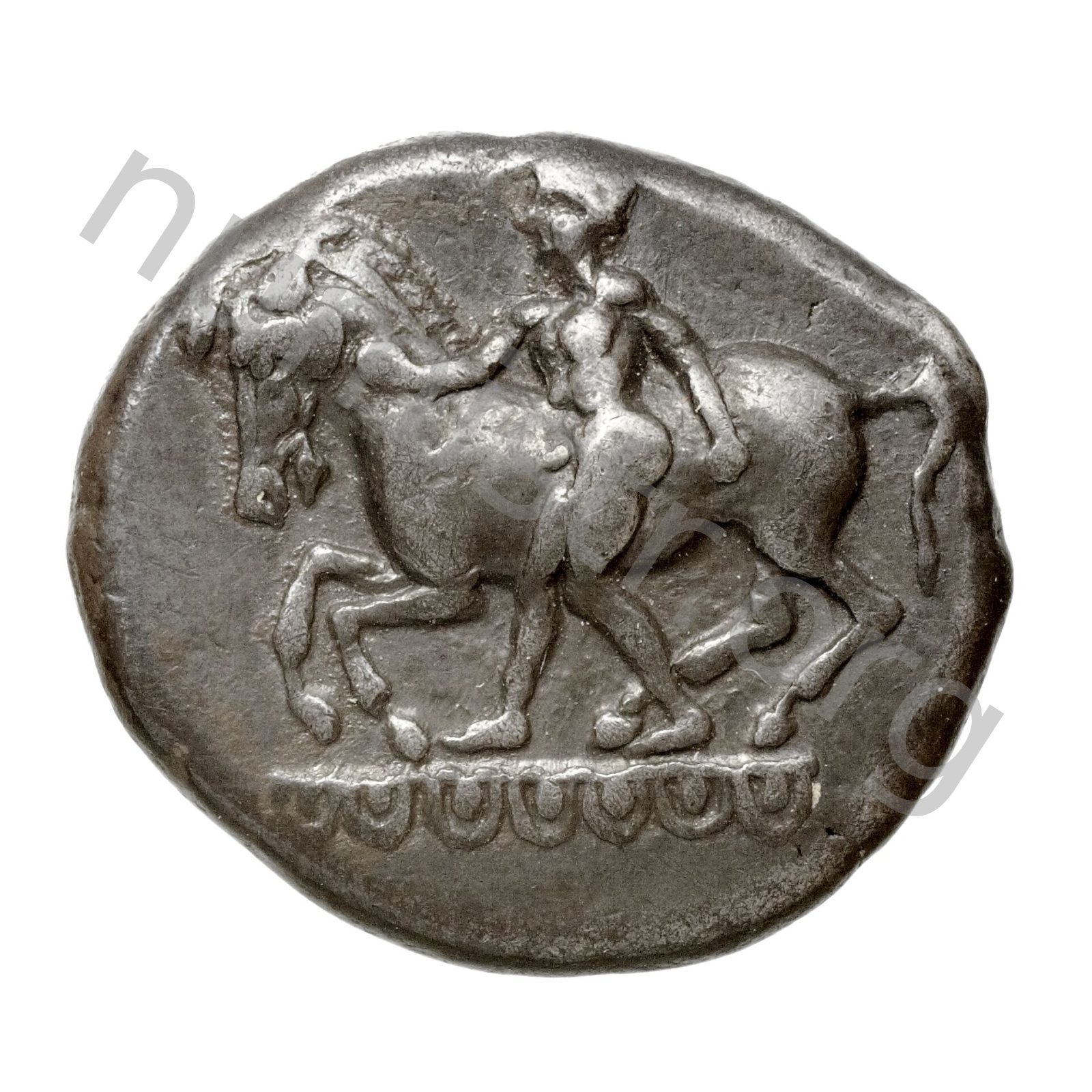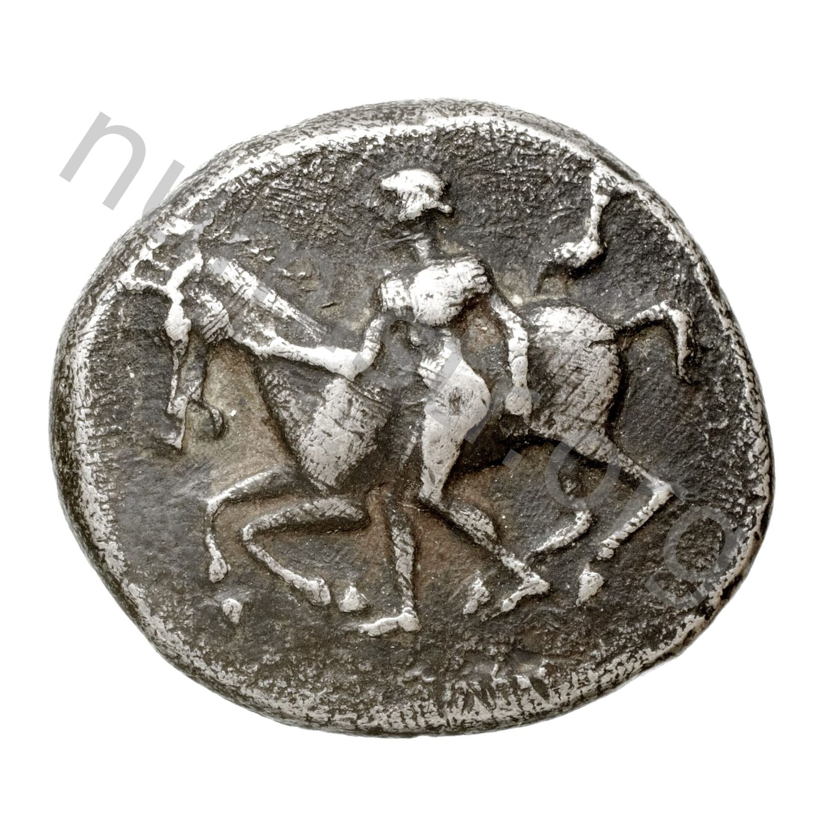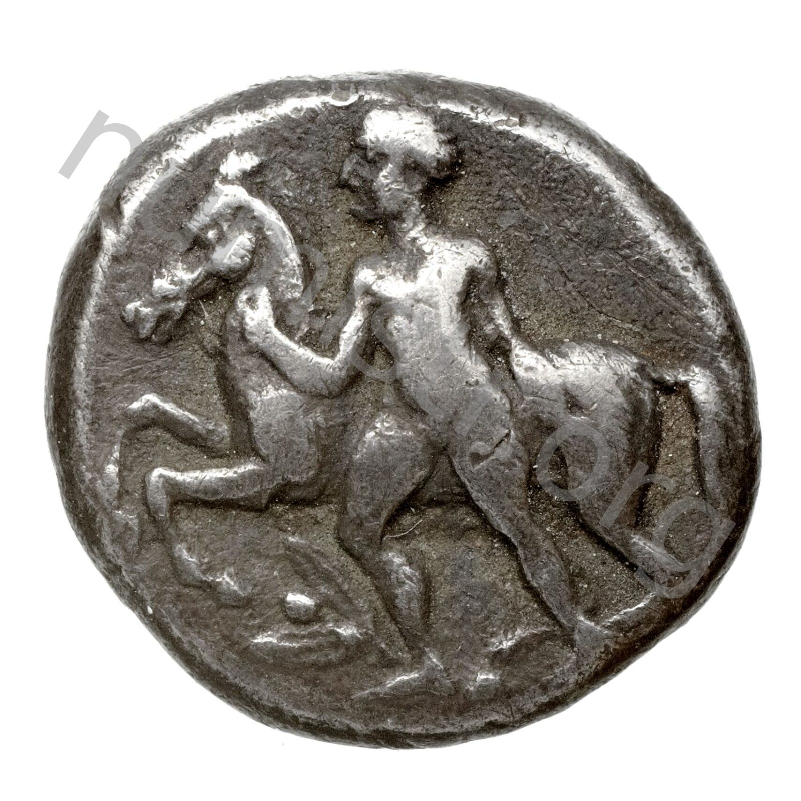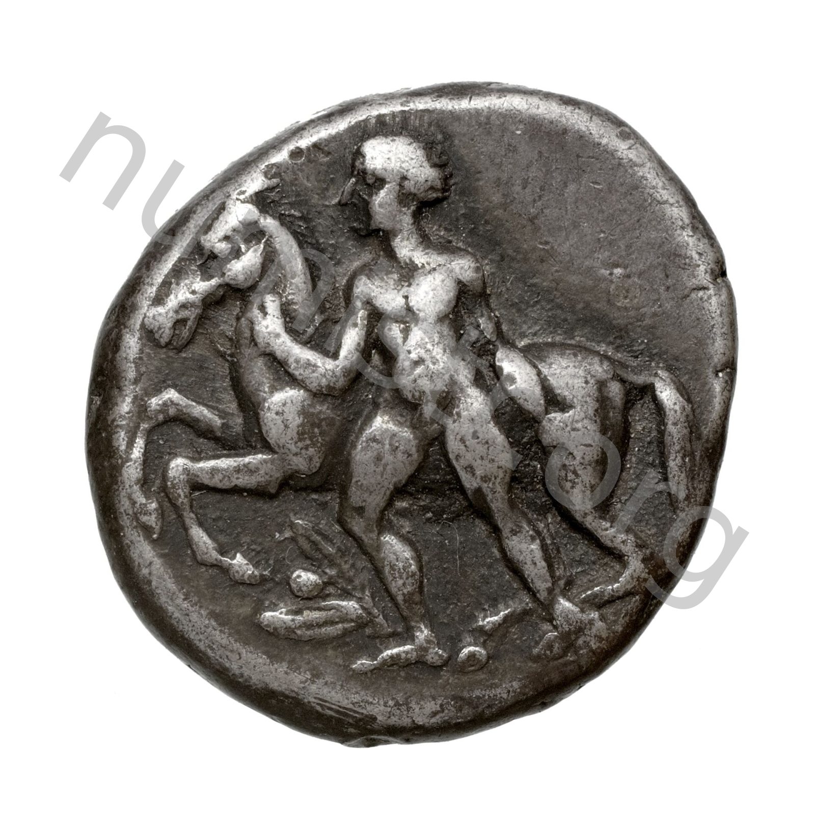 The hero Erythros naked running beside a galloping horse holding the horse by the bridle in his right hand; in the upper right field helmet -[en]