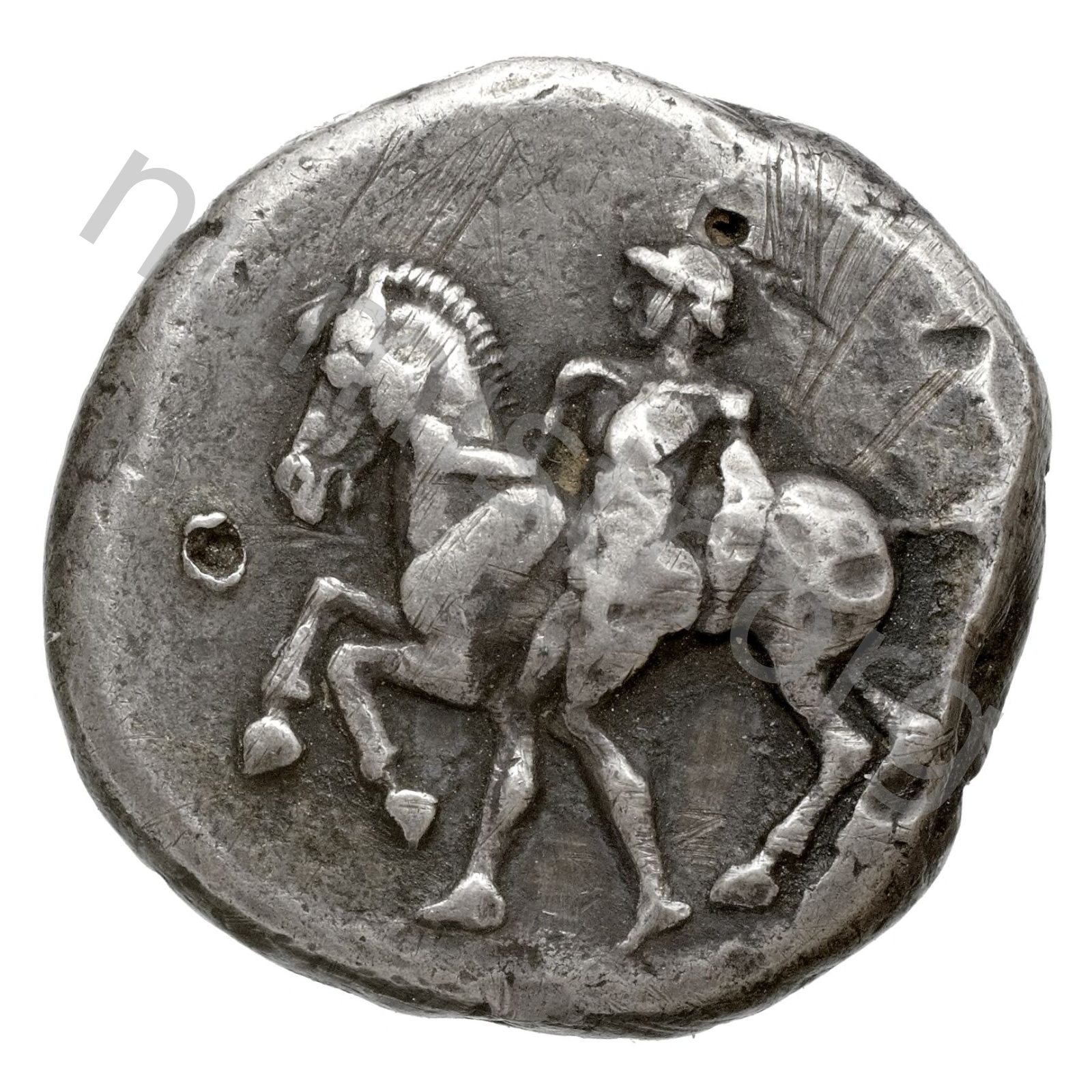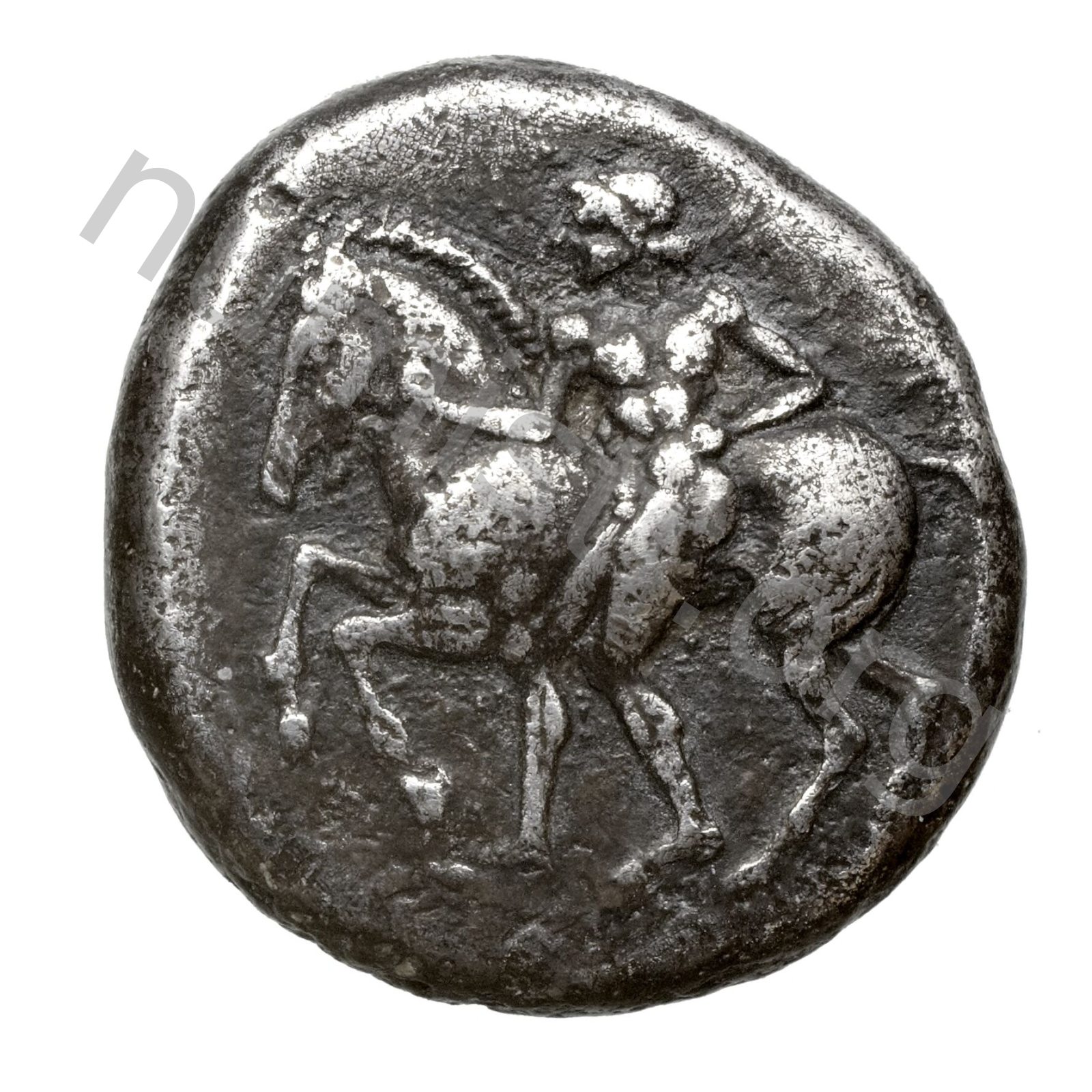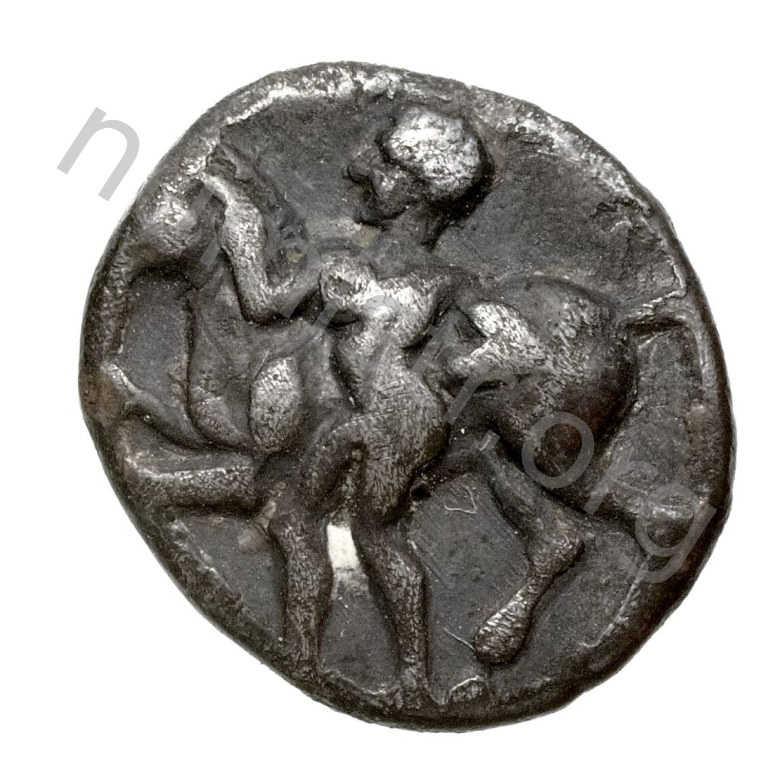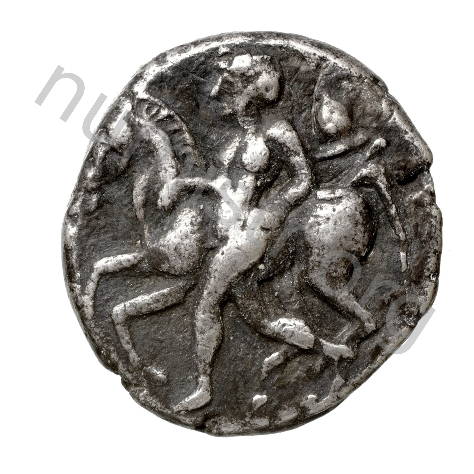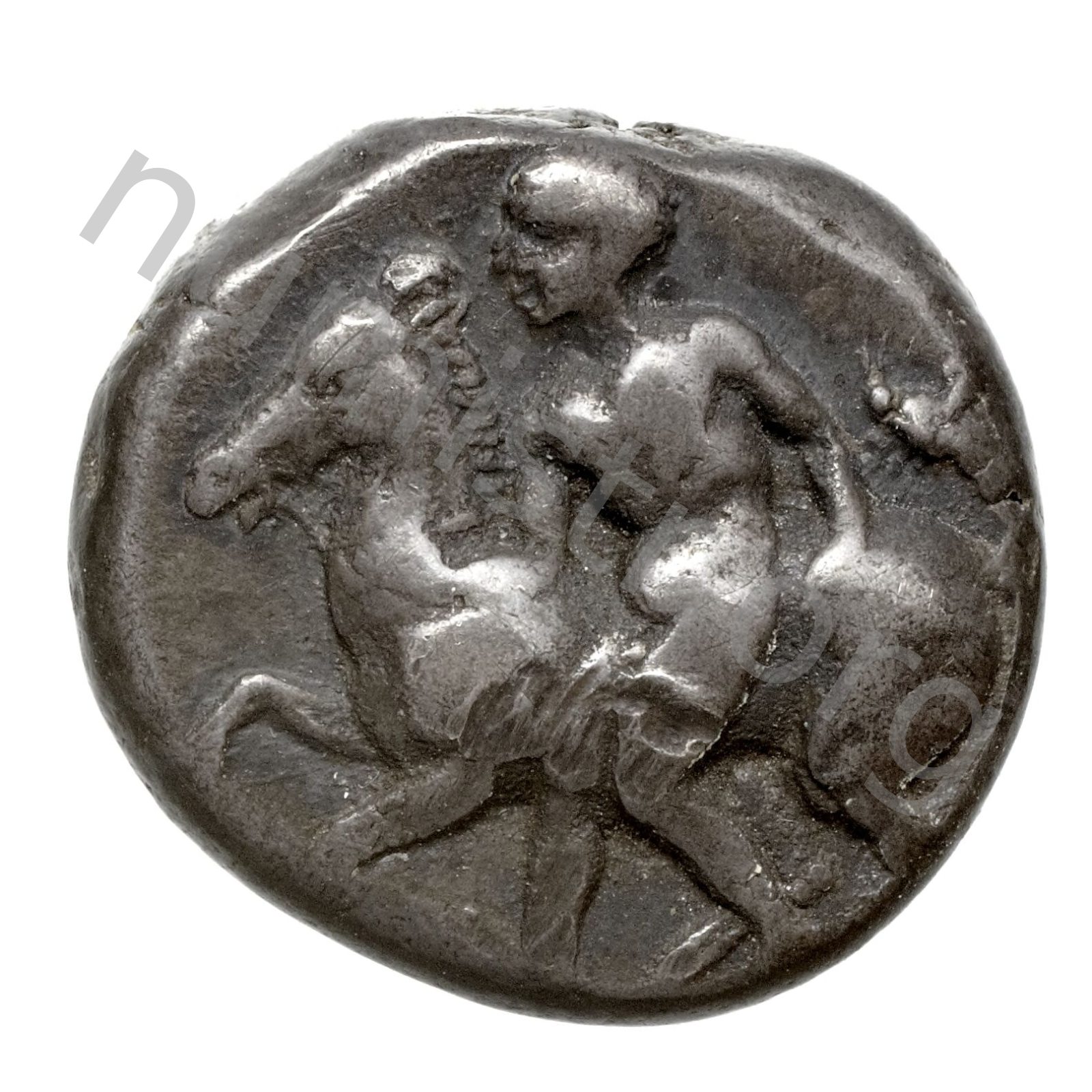 The hero Erythros naked running beside a galloping horse holding the horse by the bridle in his right hand; in the upper right field helmet -[en]