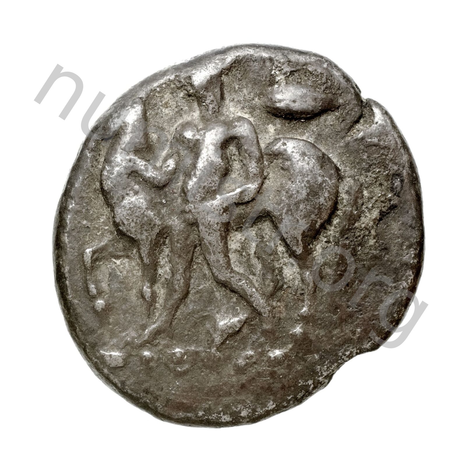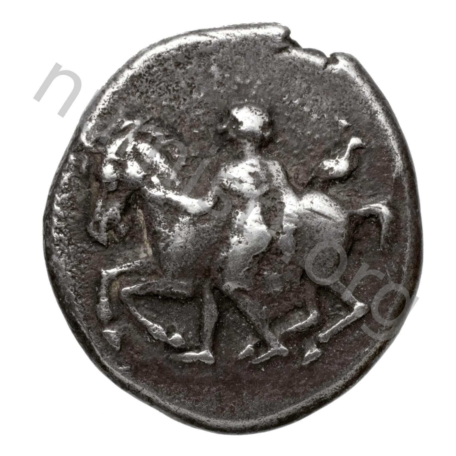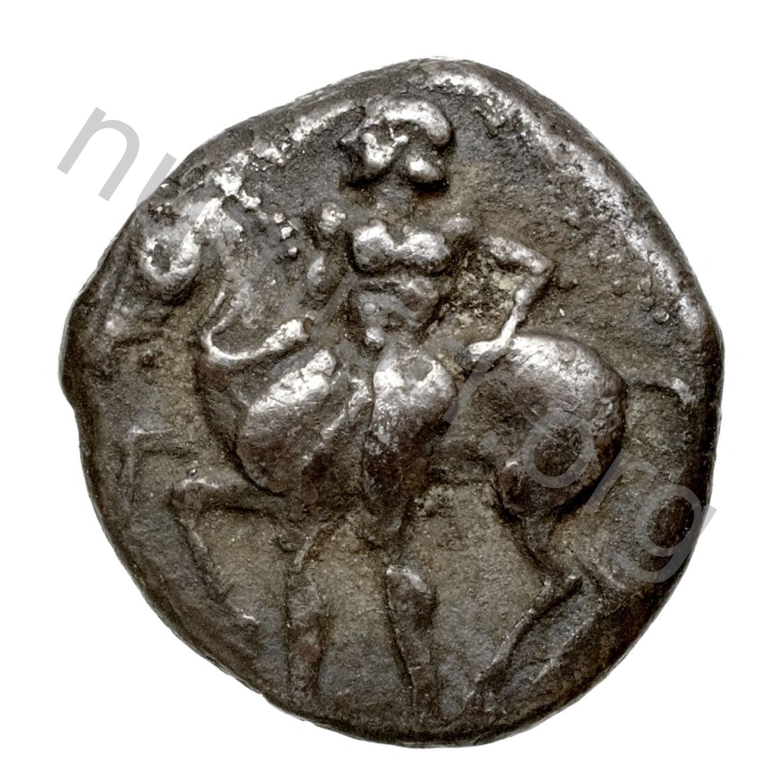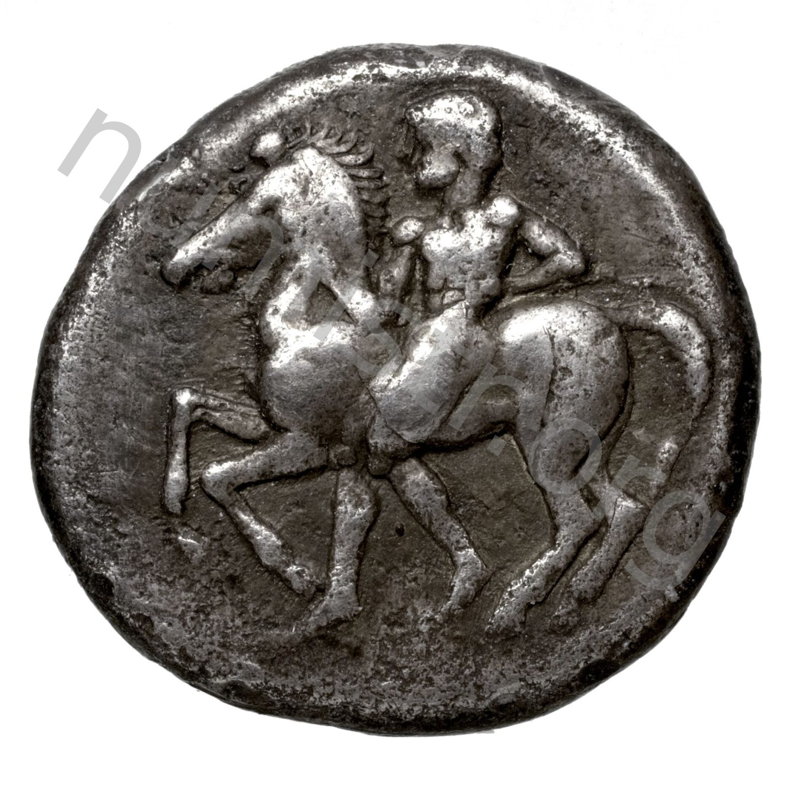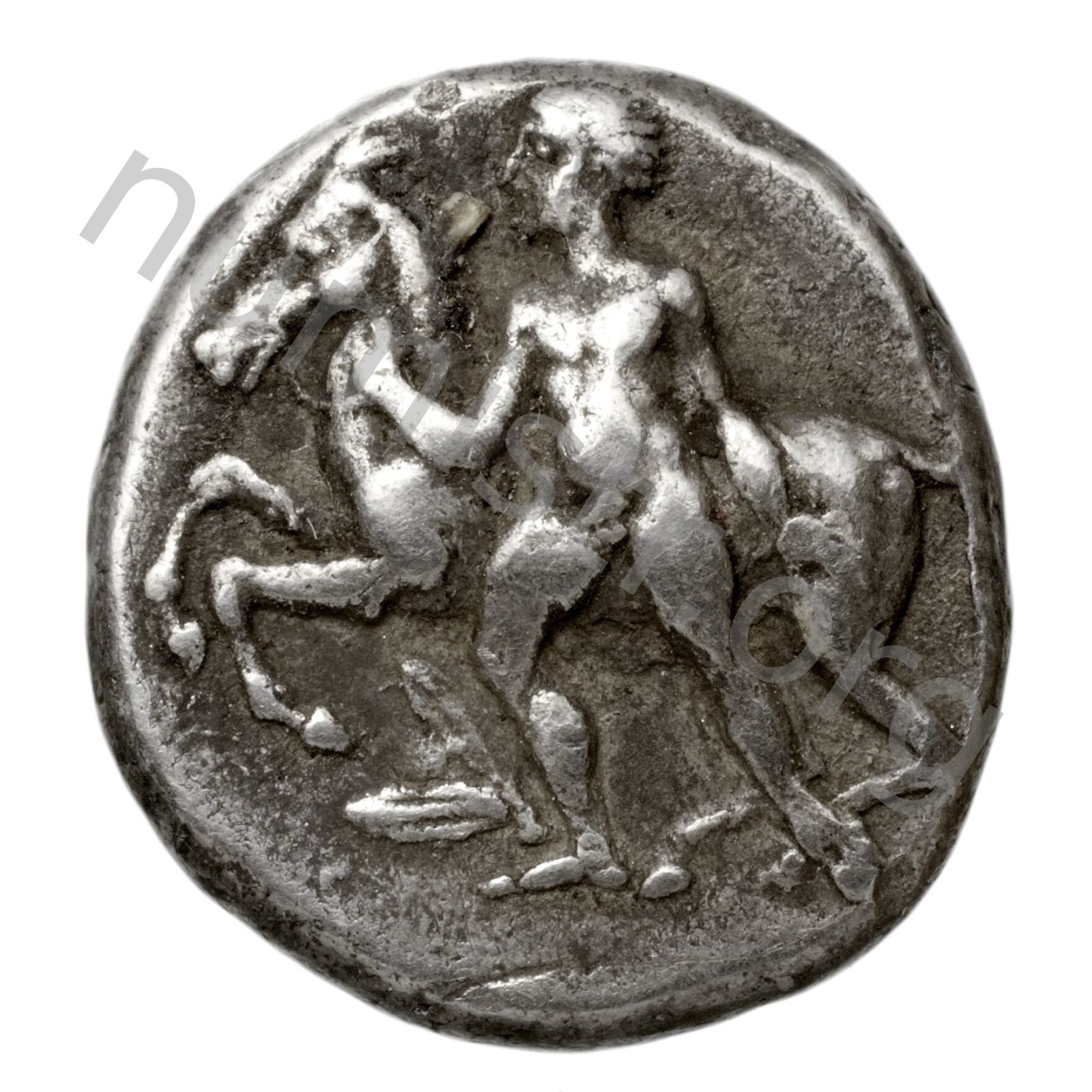 The hero Erythros naked running beside a galloping horse holding the horse by the bridle in his right hand; in the upper right field helmet -[en]