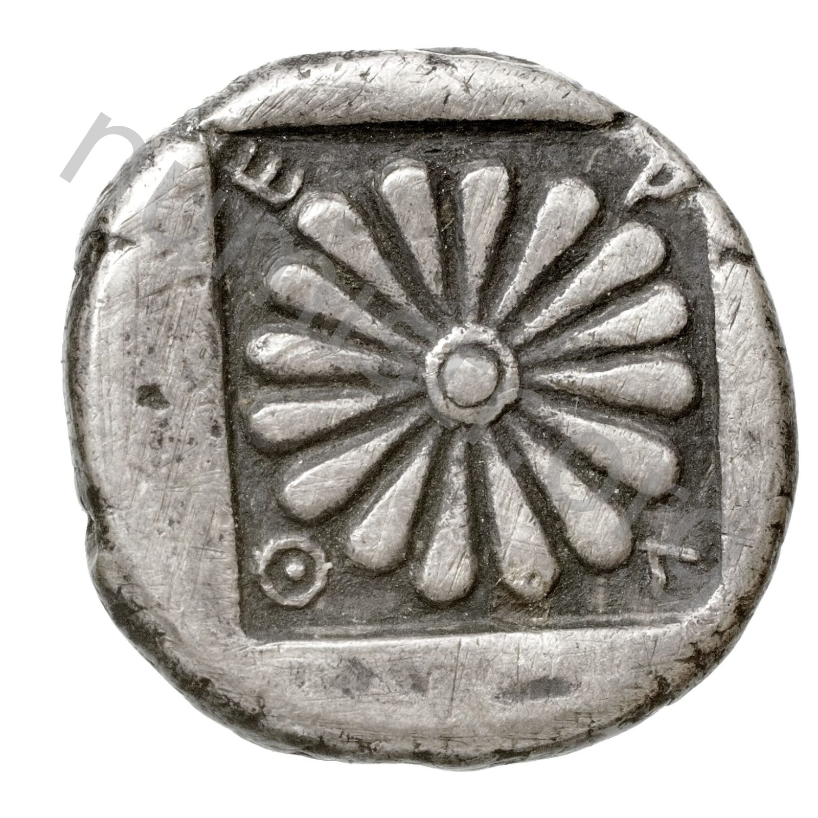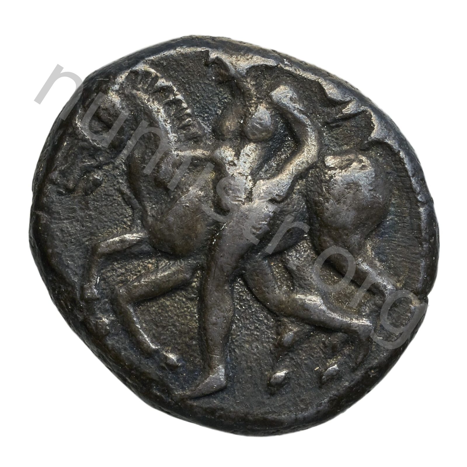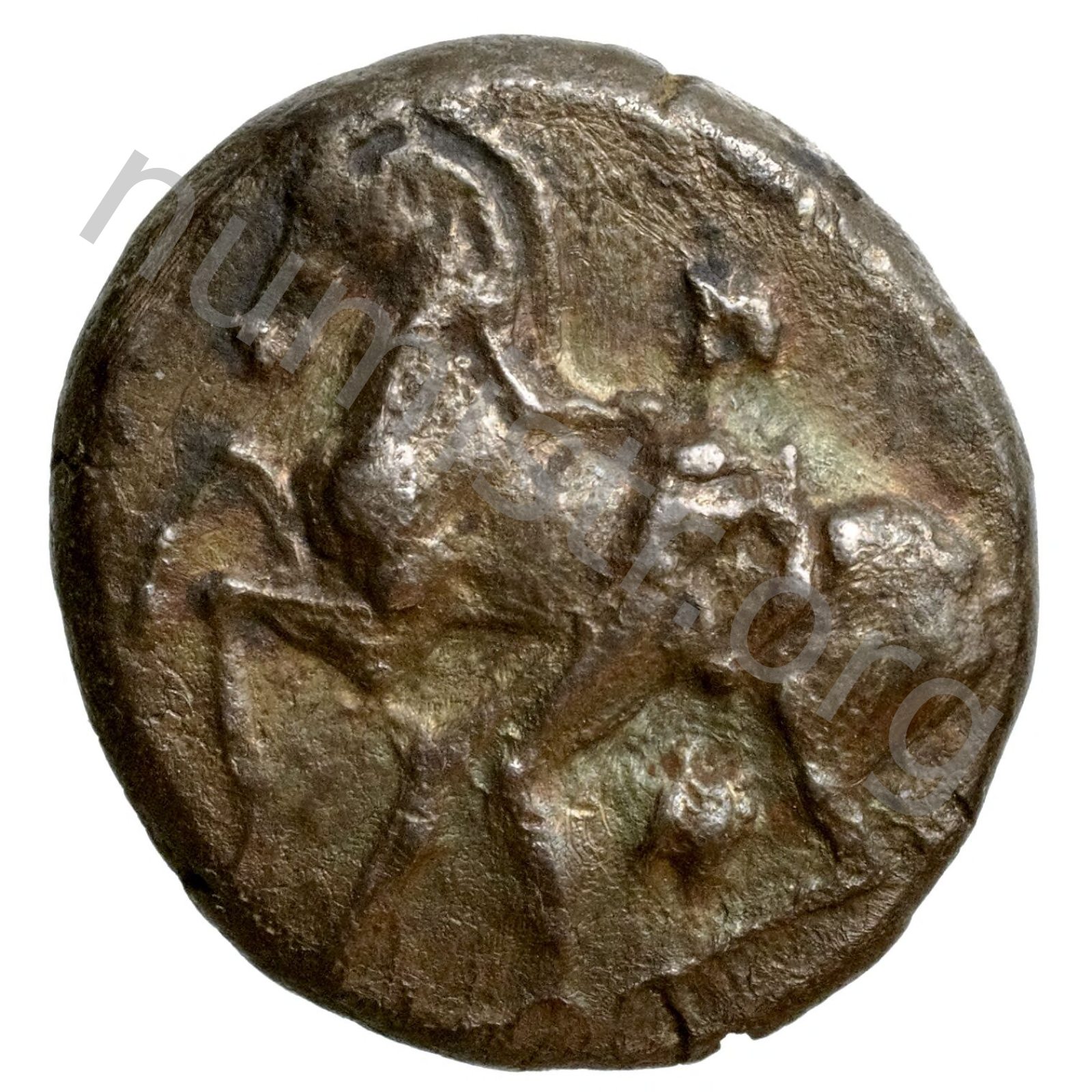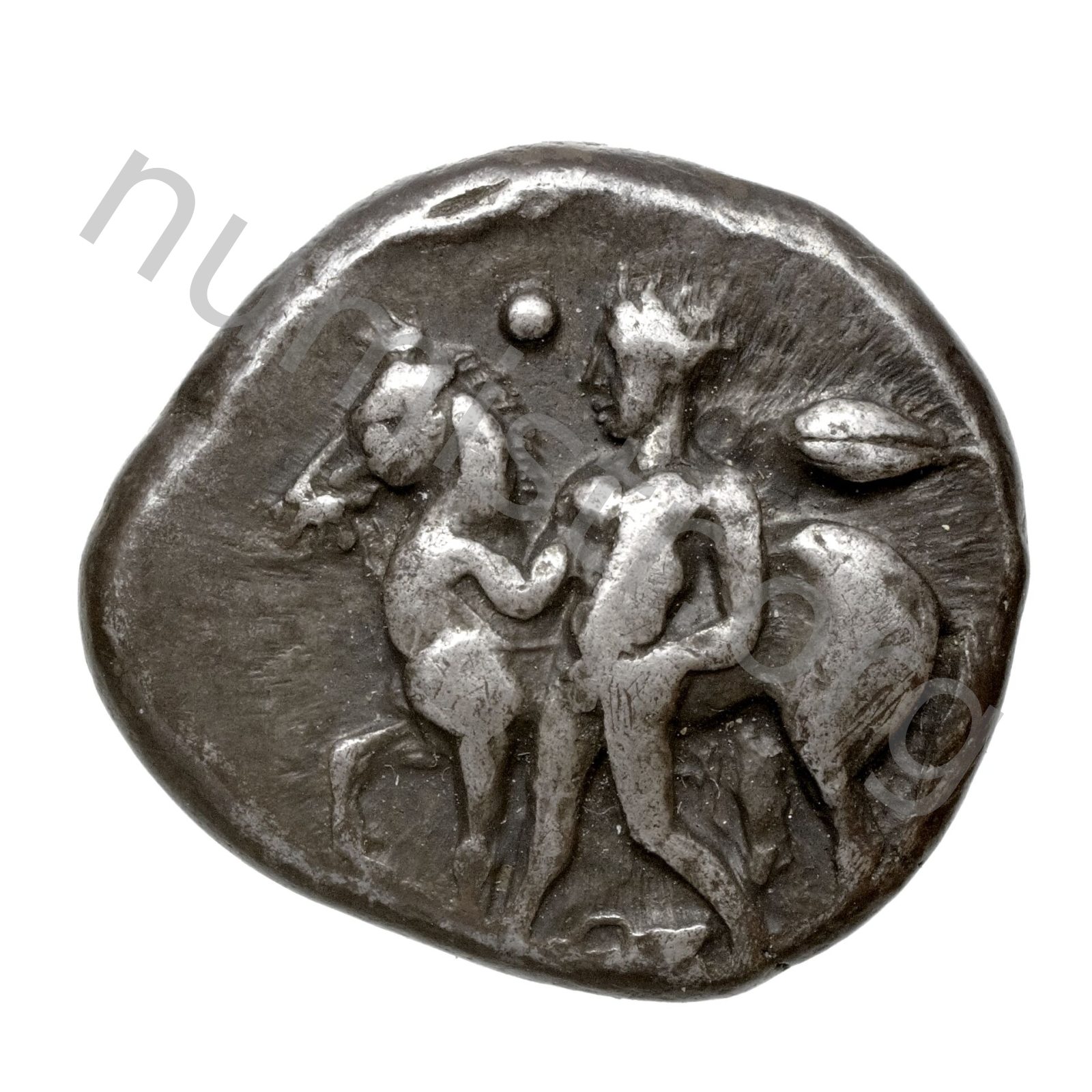 The hero Erythros naked running beside a galloping horse holding the horse by the bridle in his right hand; in the upper right field helmet -[en]