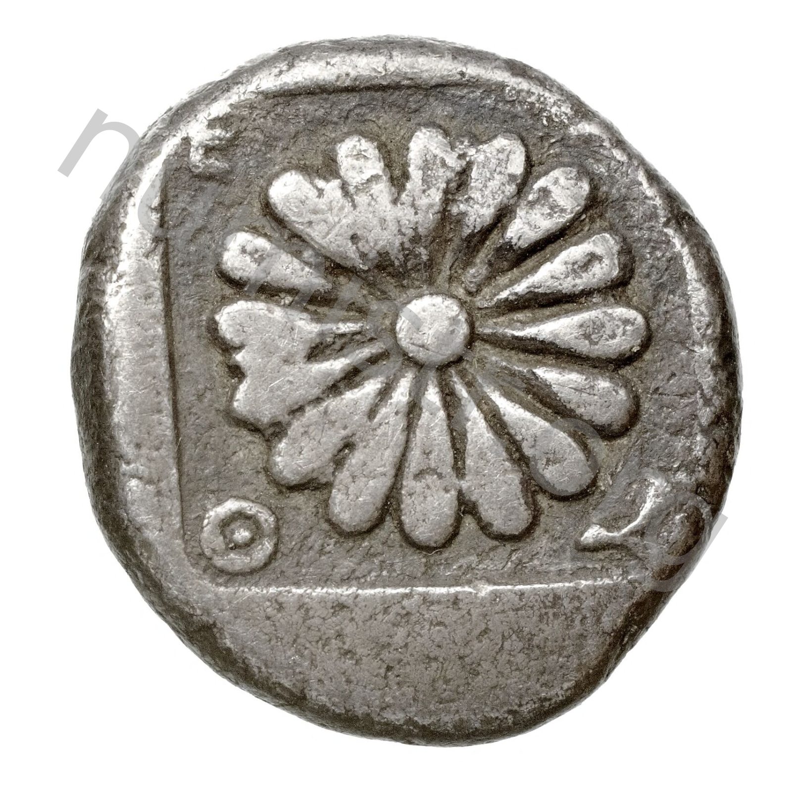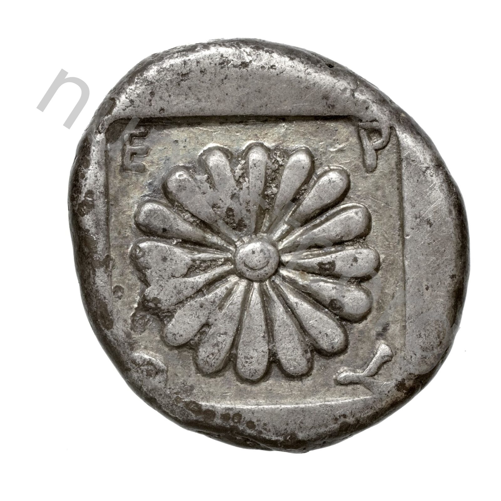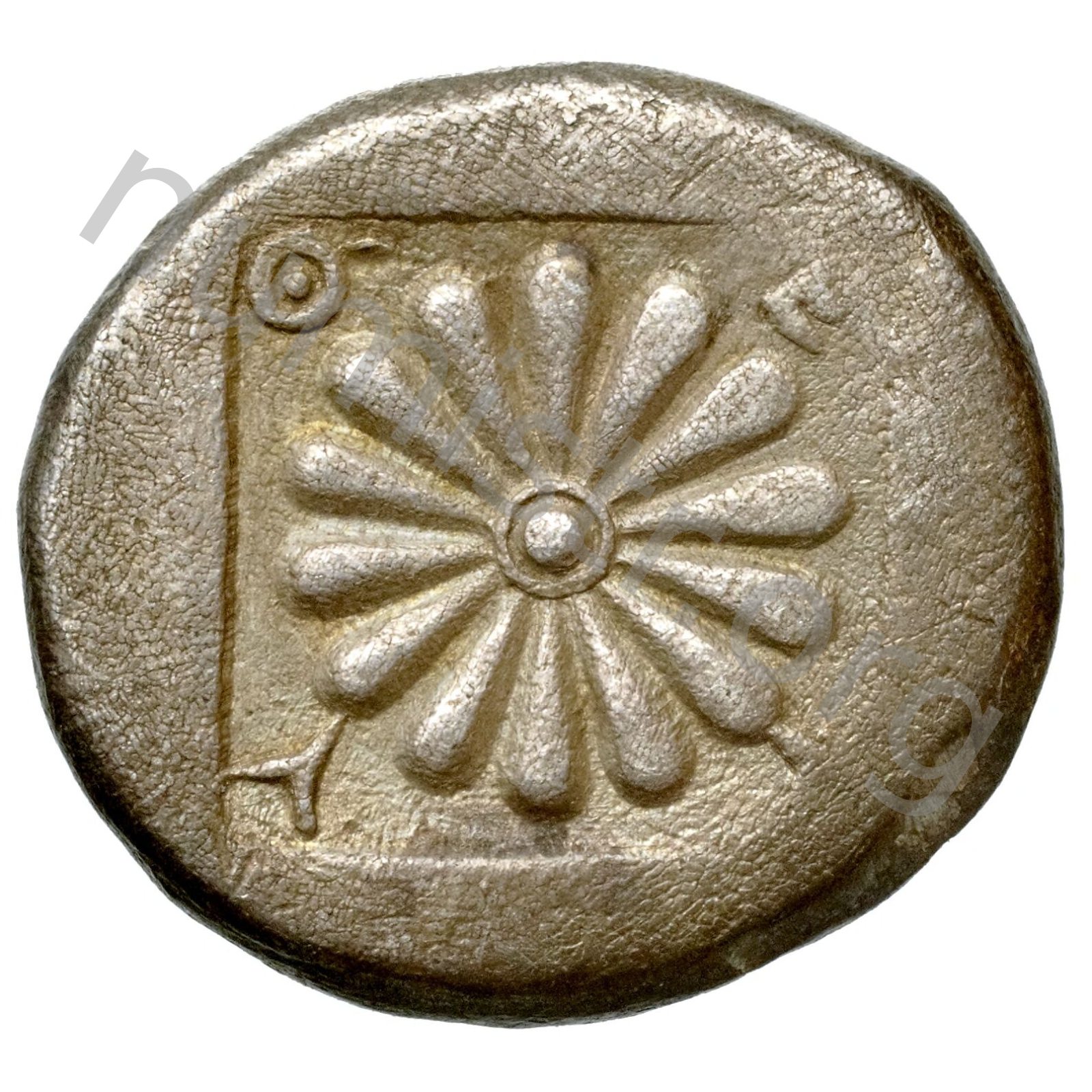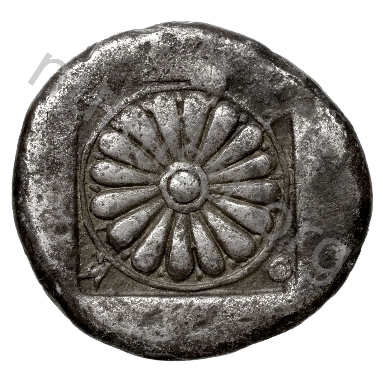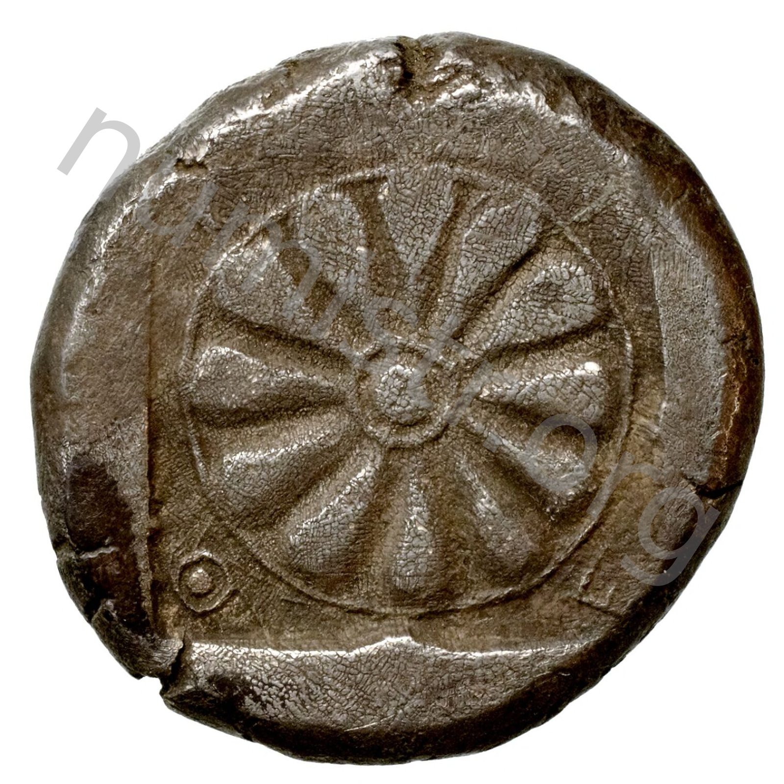 The hero Erythros naked running beside a galloping horse holding the horse by the bridle in his right hand; in the upper right field helmet -[en]