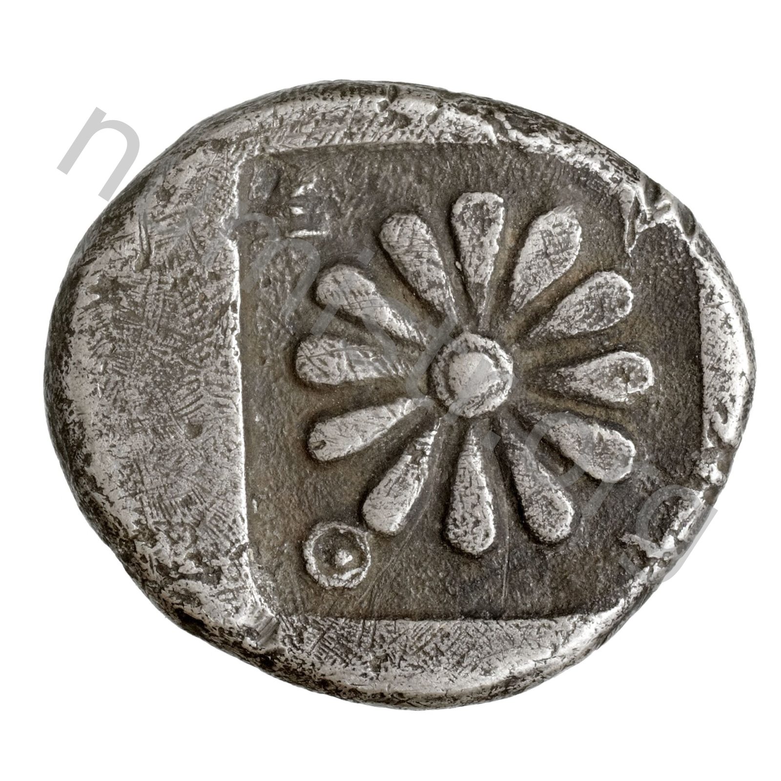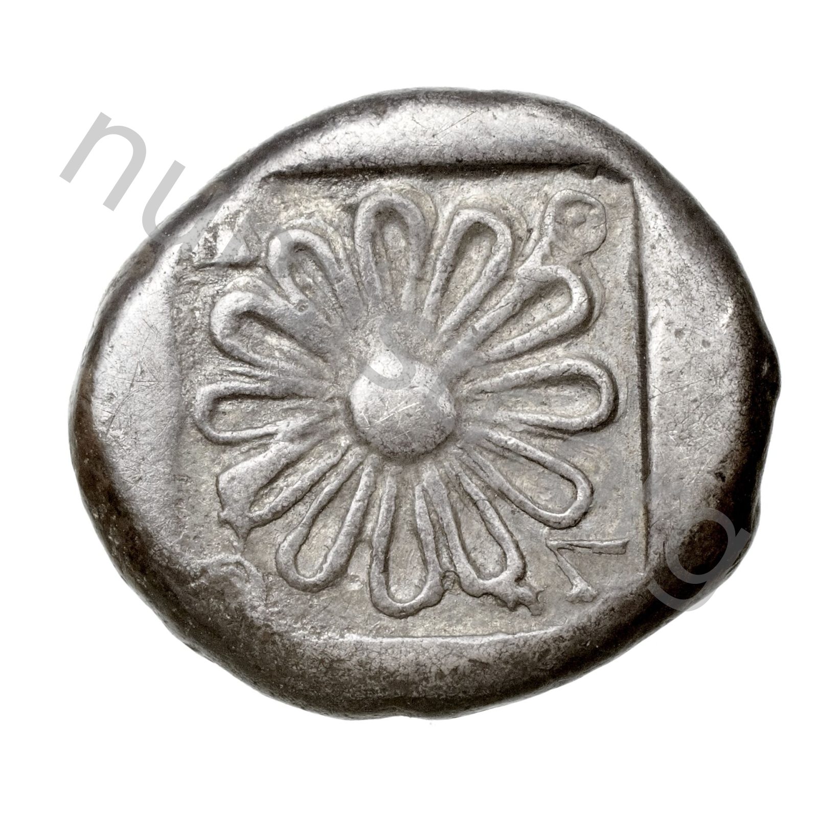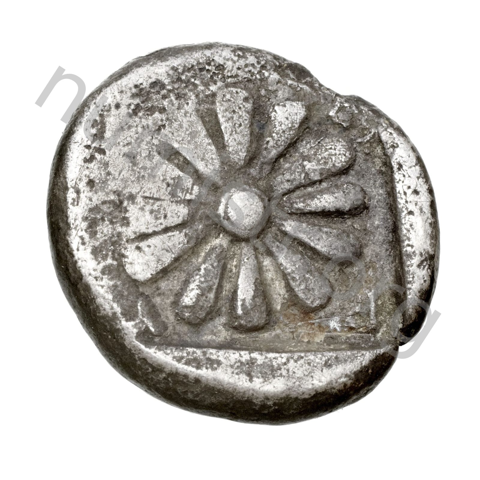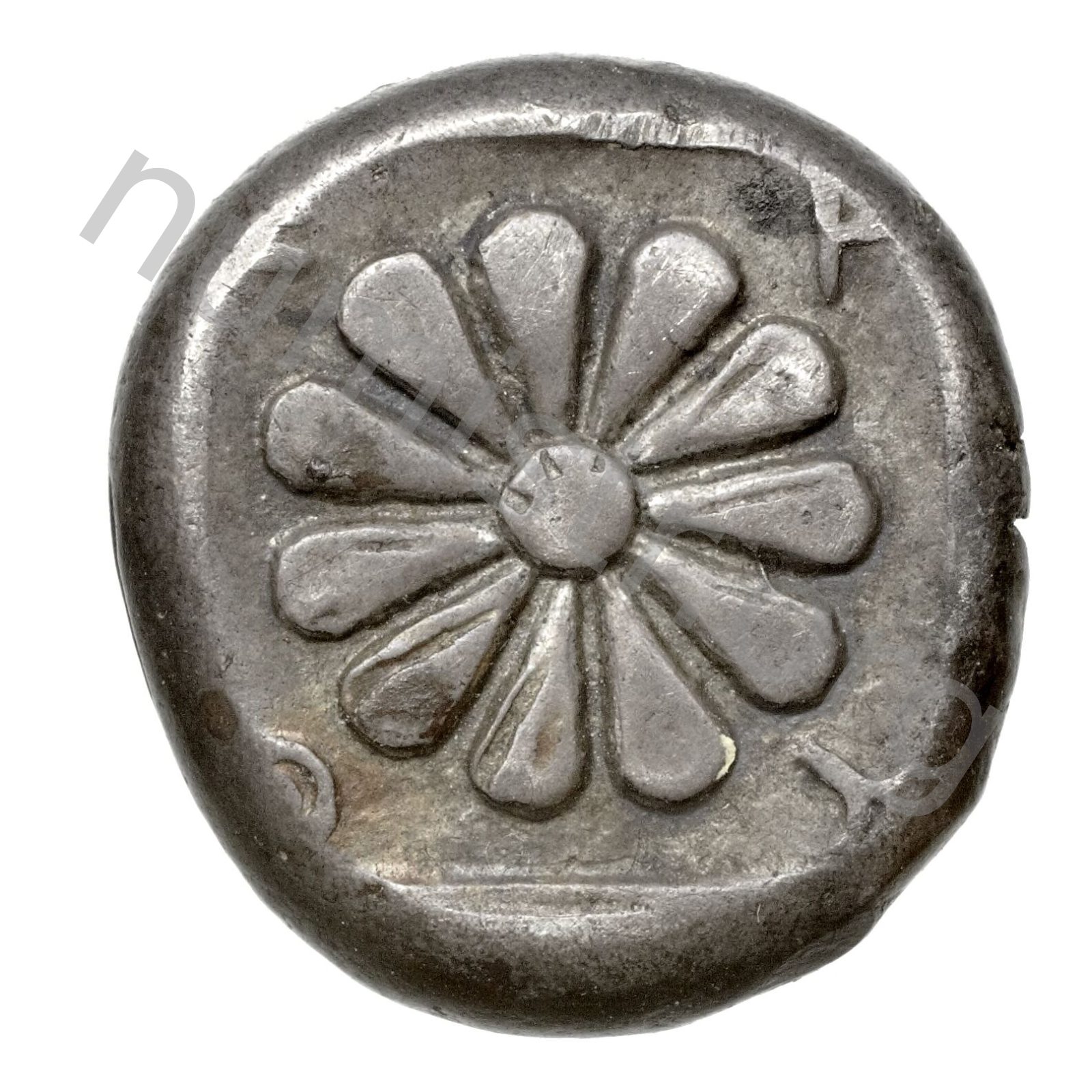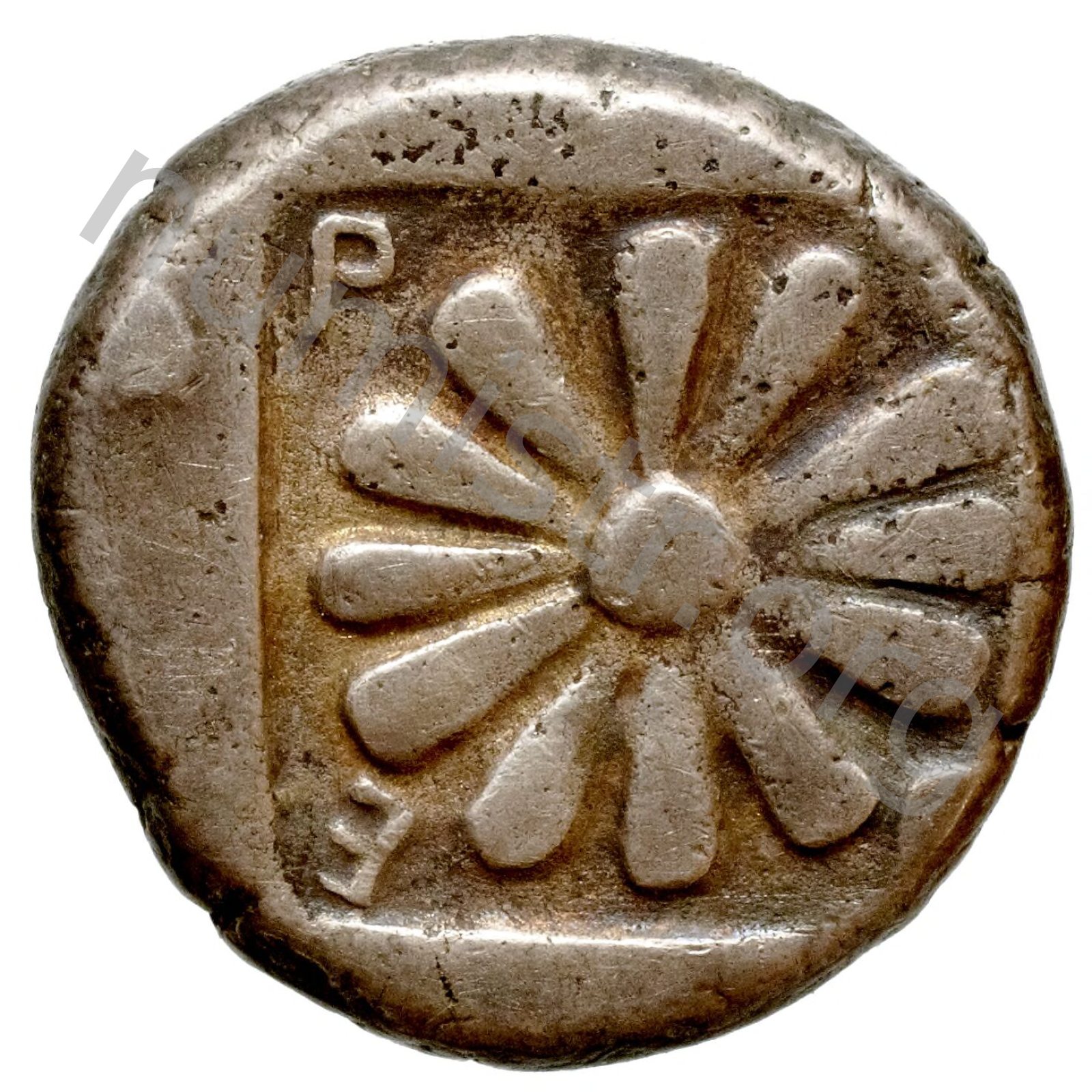 The hero Erythros naked running beside a galloping horse holding the horse by the bridle in his right hand; in the upper right field helmet -[en]