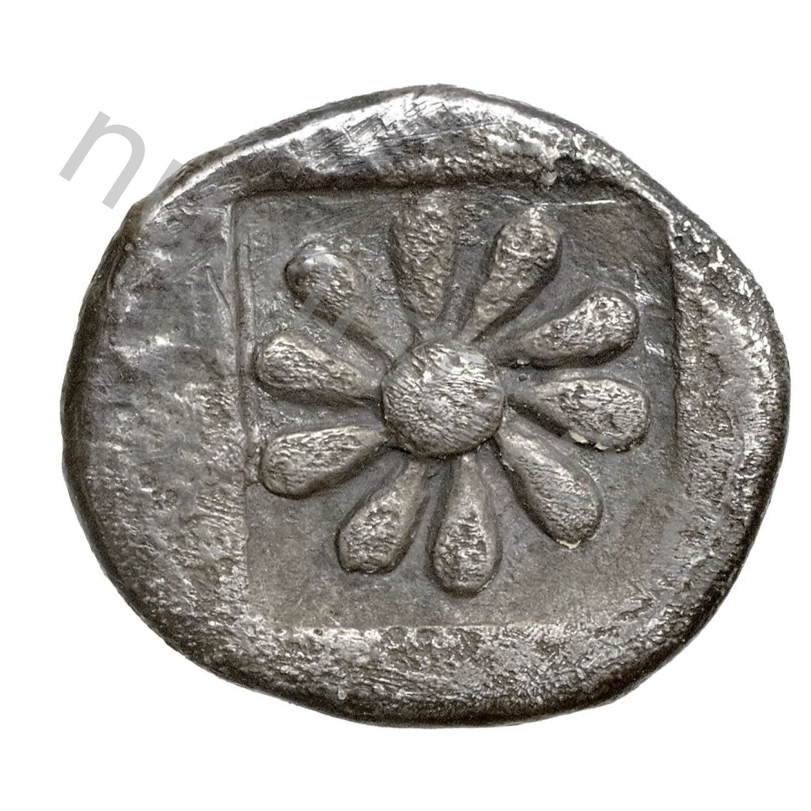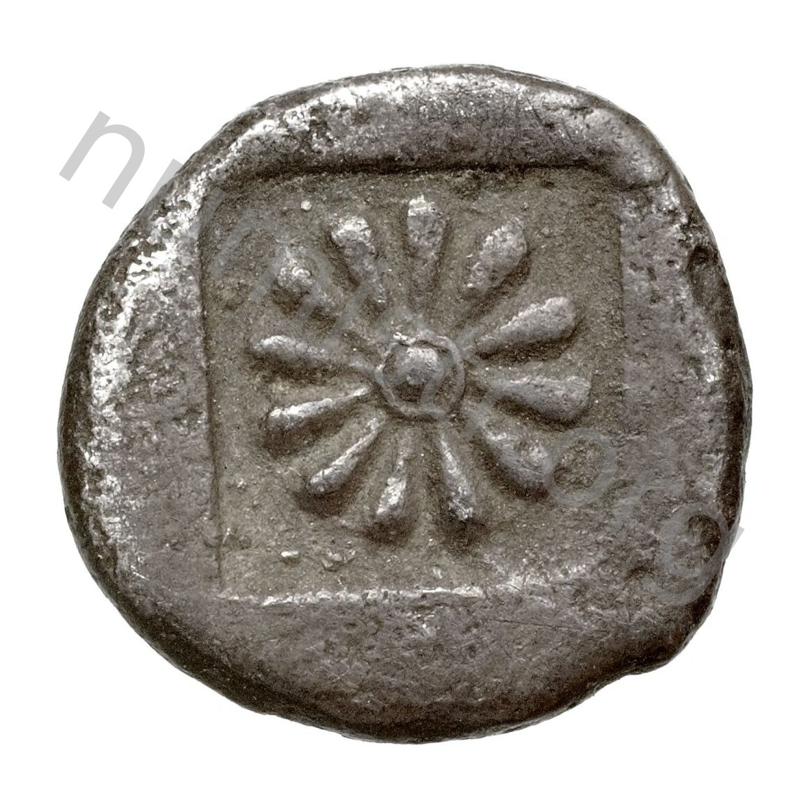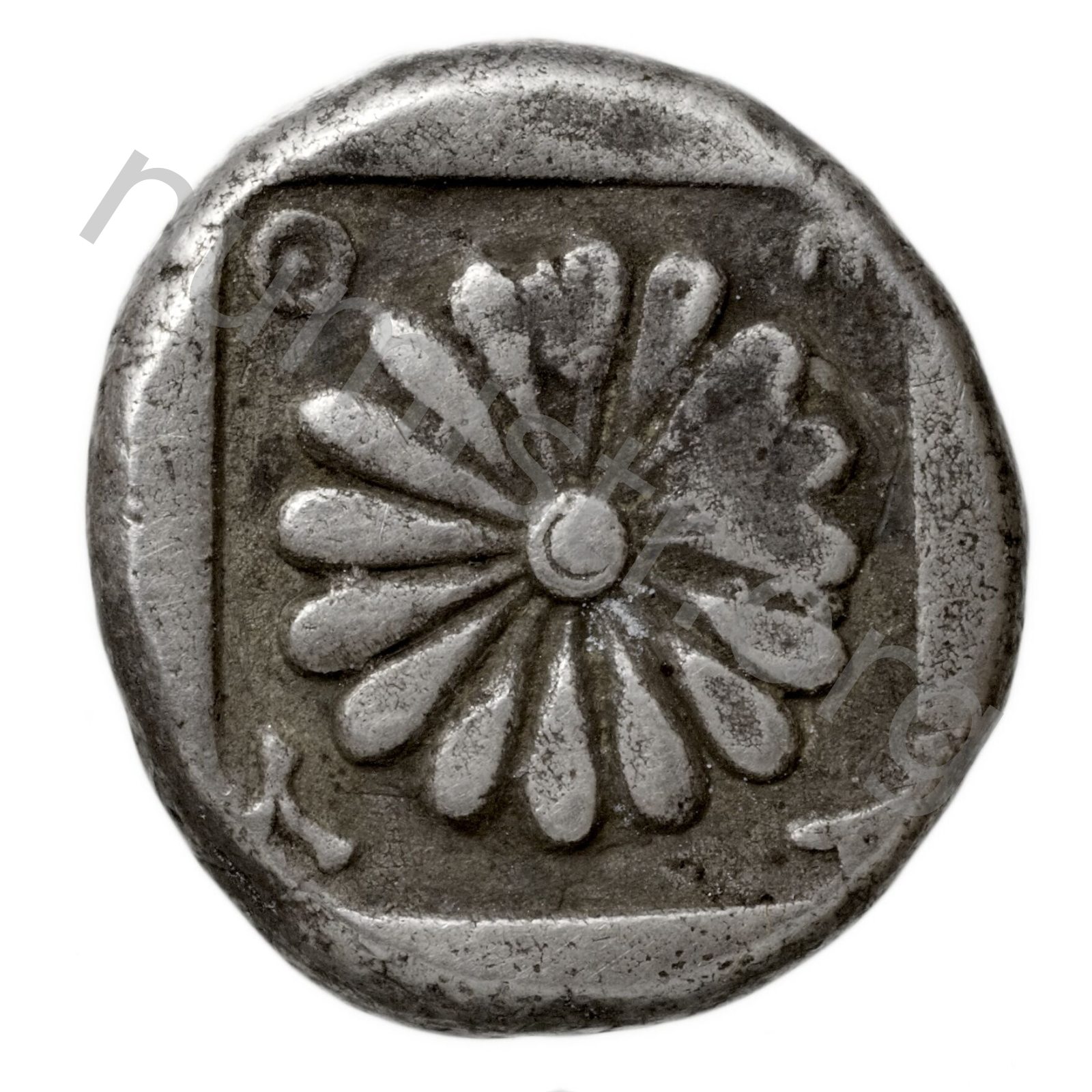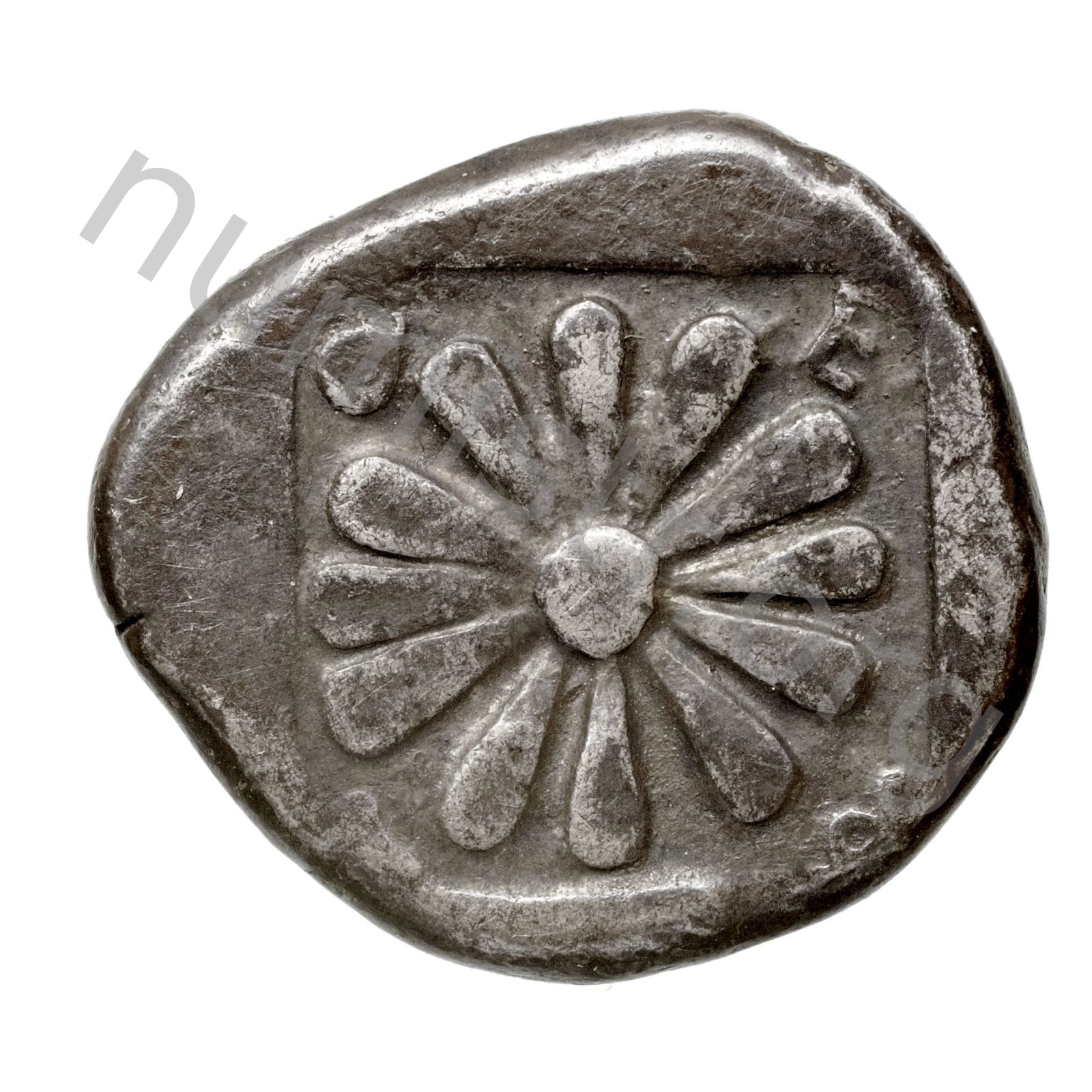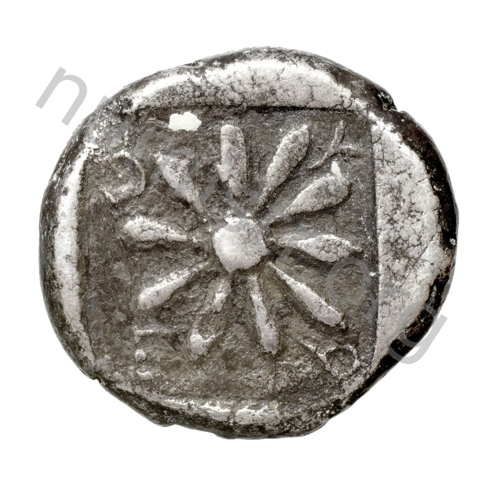 The hero Erythros naked running beside a galloping horse holding the horse by the bridle in his right hand; in the upper right field helmet -[en]