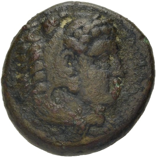 Sağda aslan postu giymiş sakalsız Herakles başı