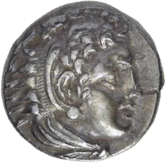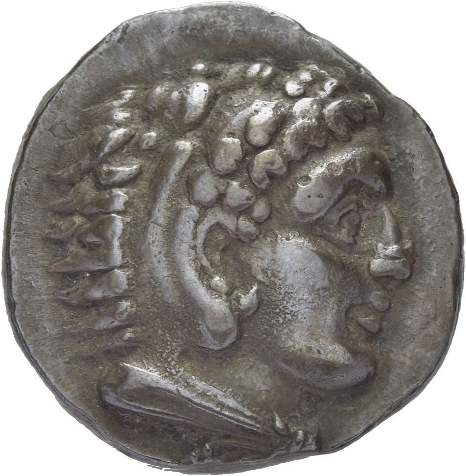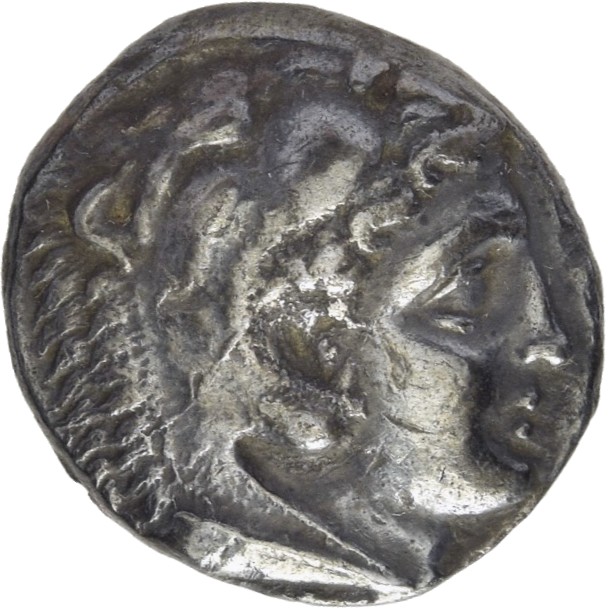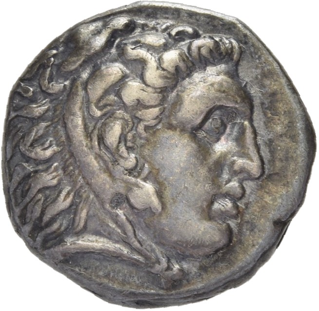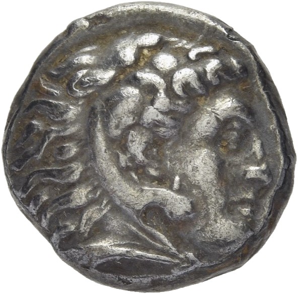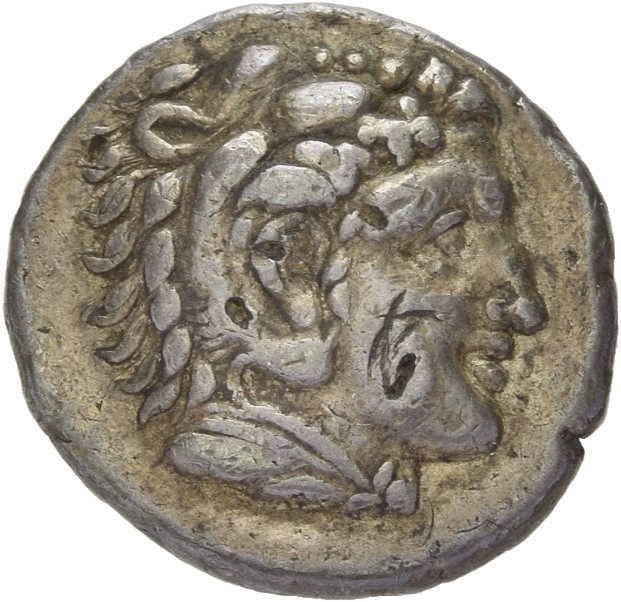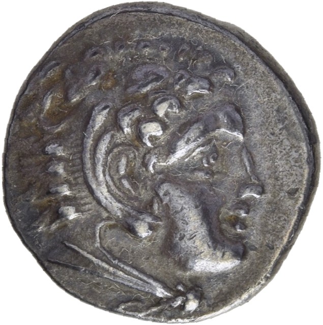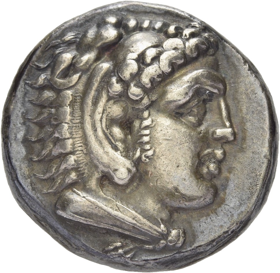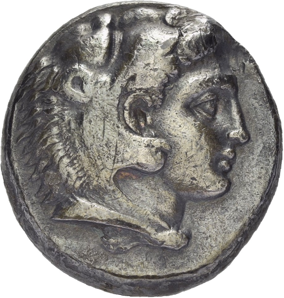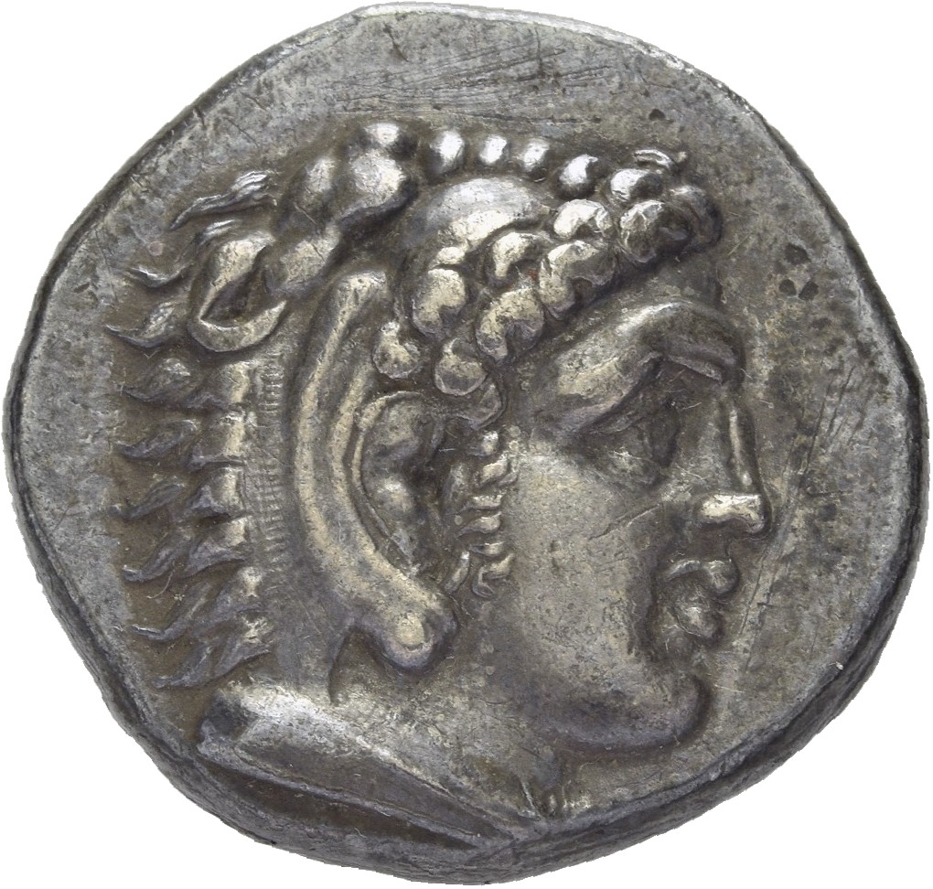 Sağda aslan postu giymiş sakalsız Herakles başı