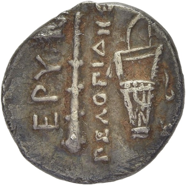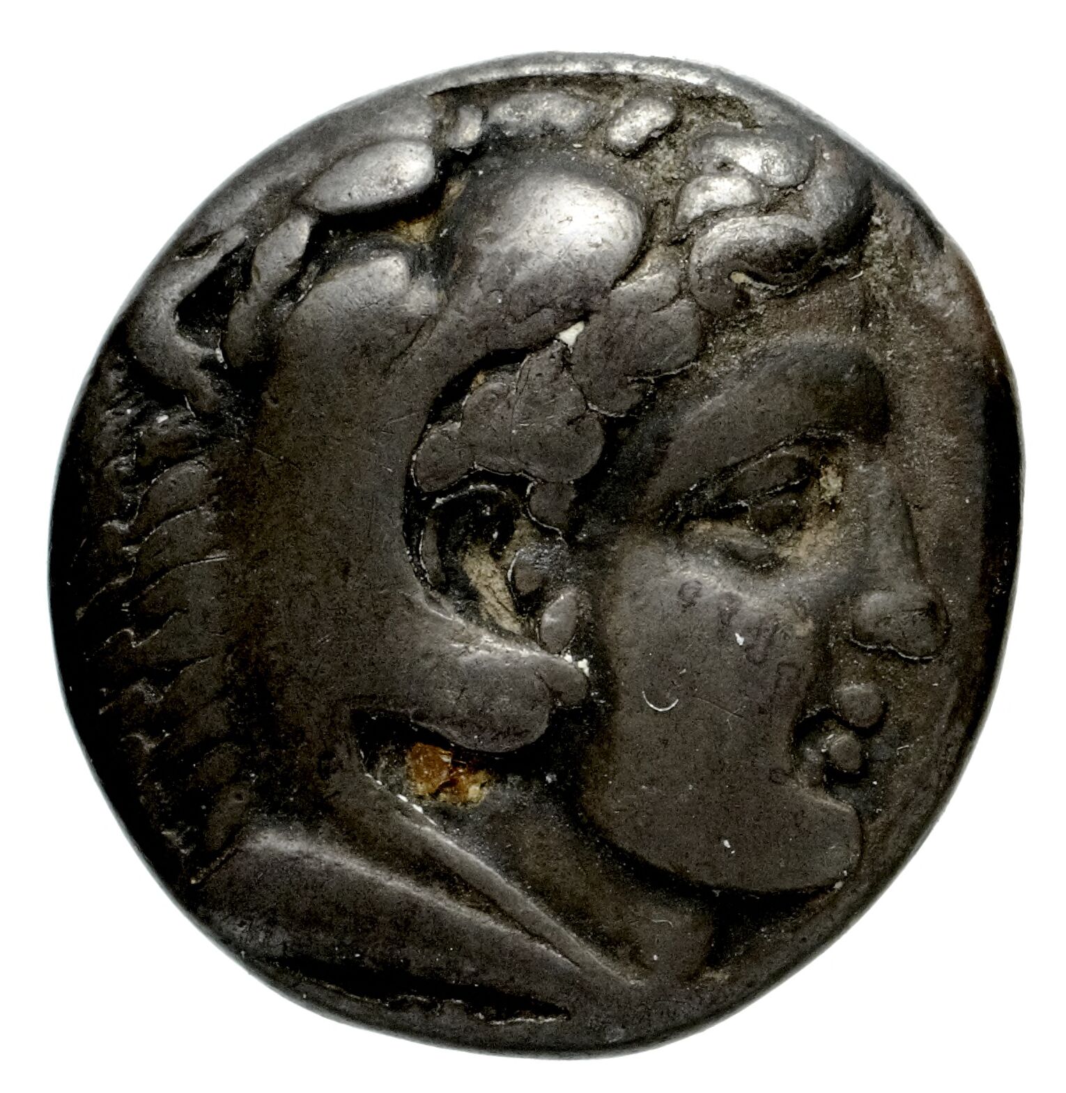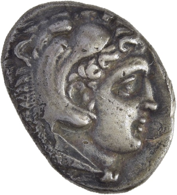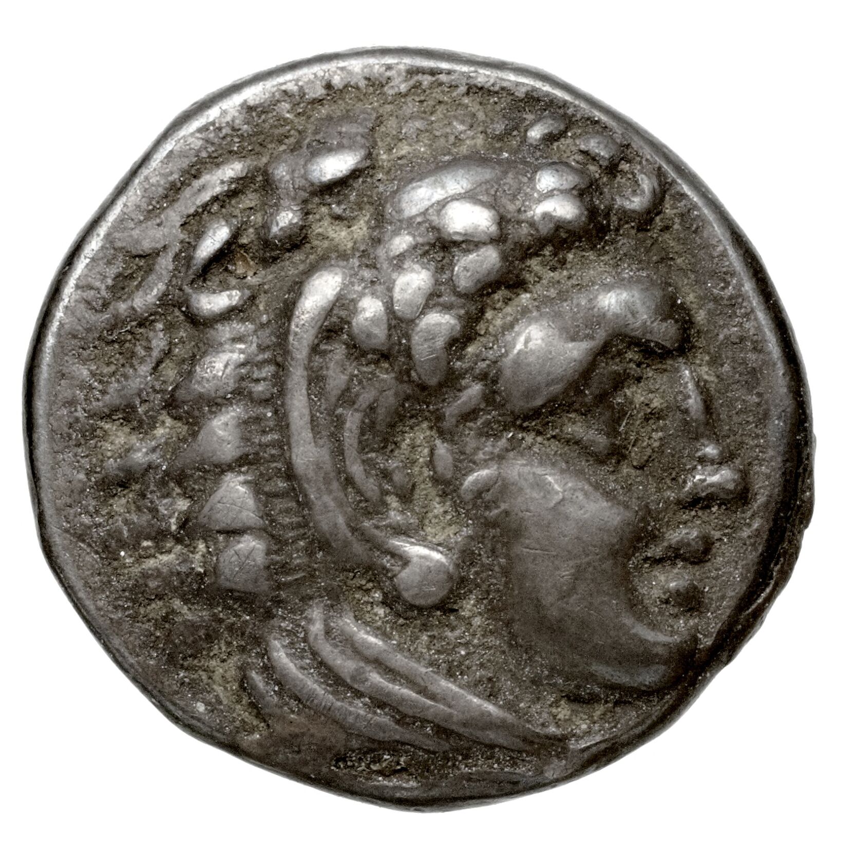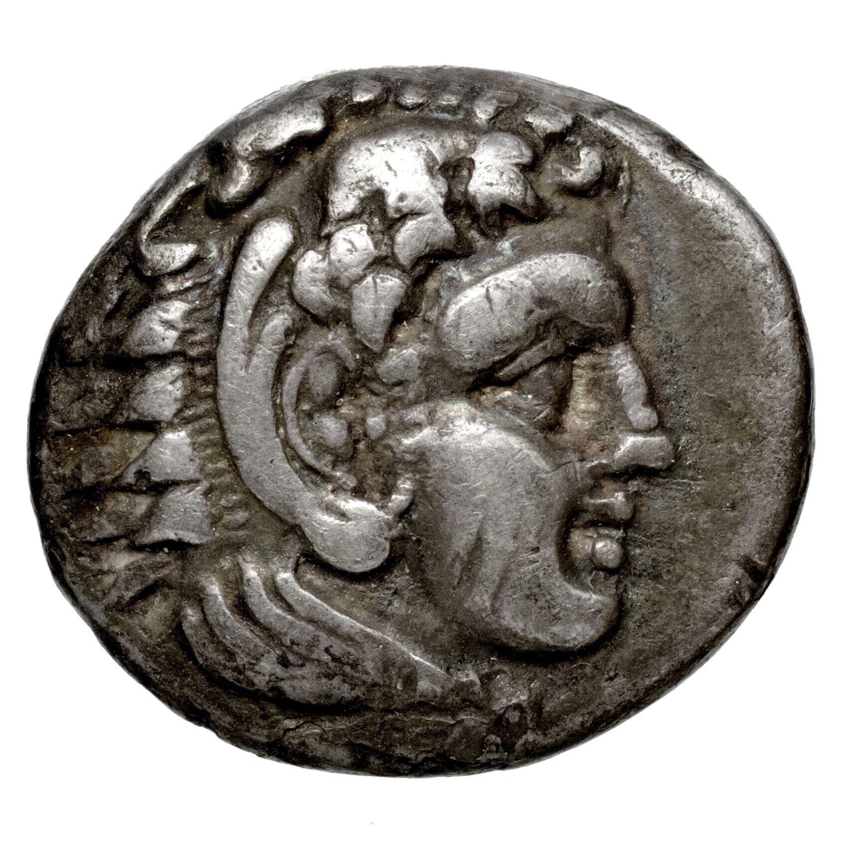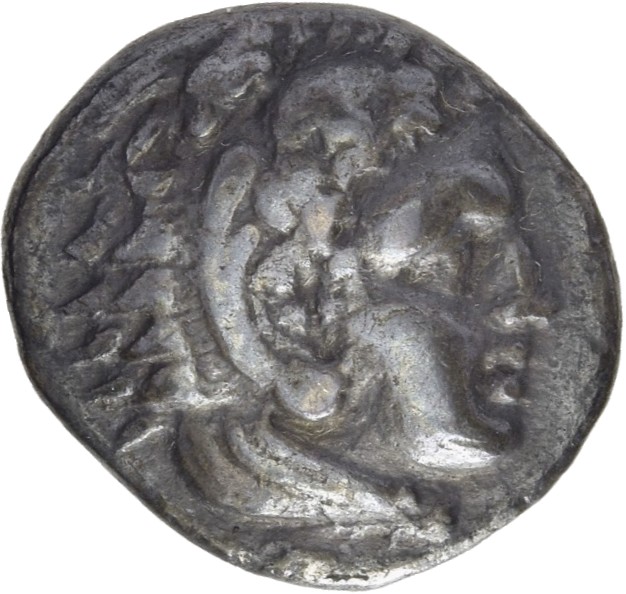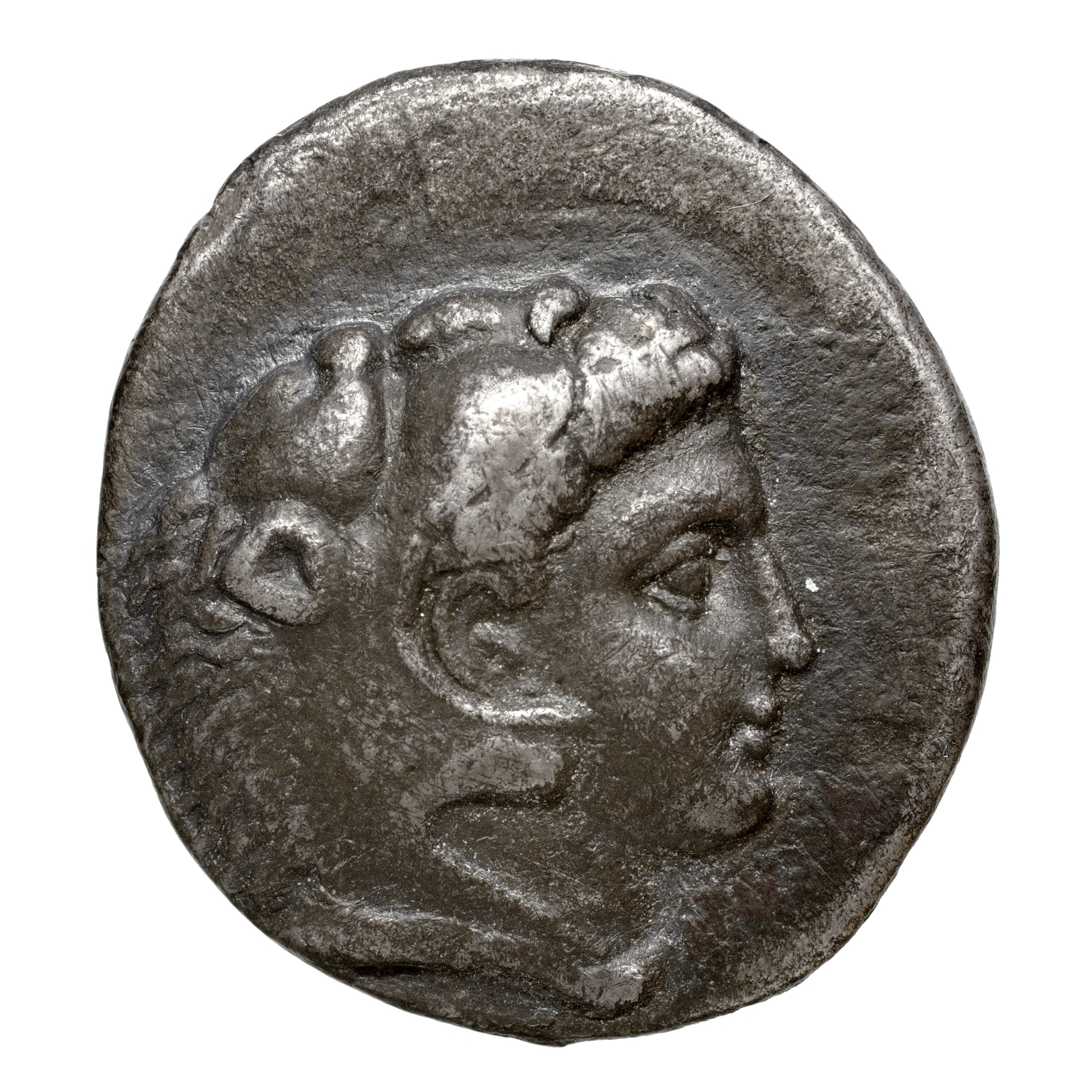 Sağda aslan postu giymiş sakalsız Herakles başı