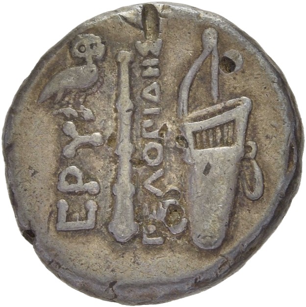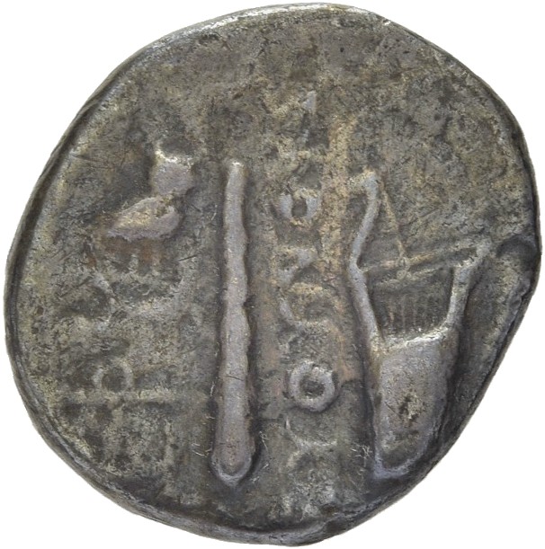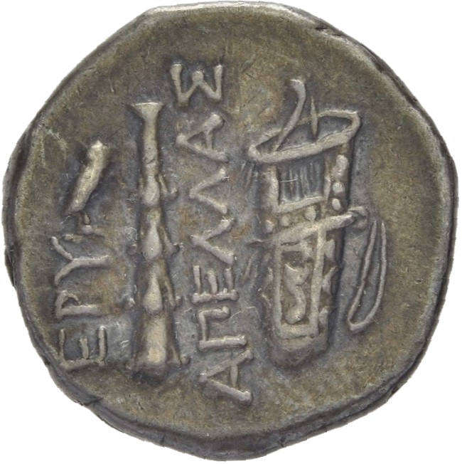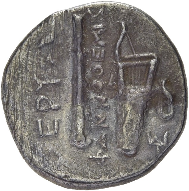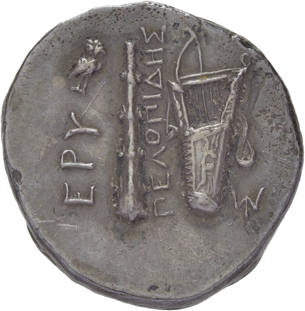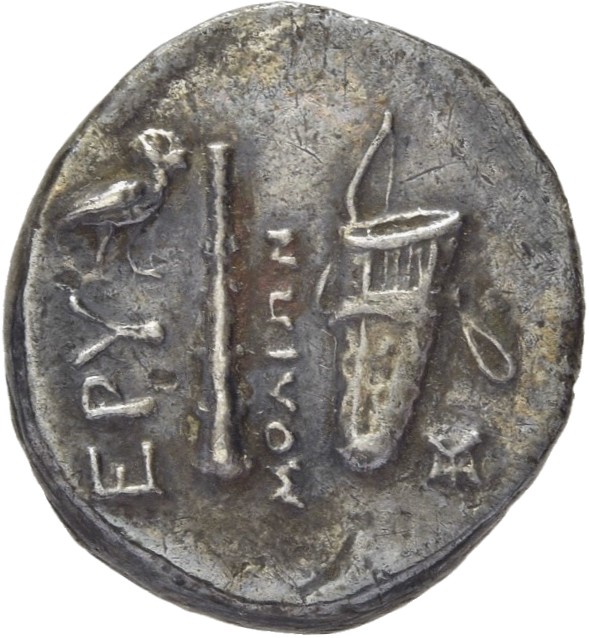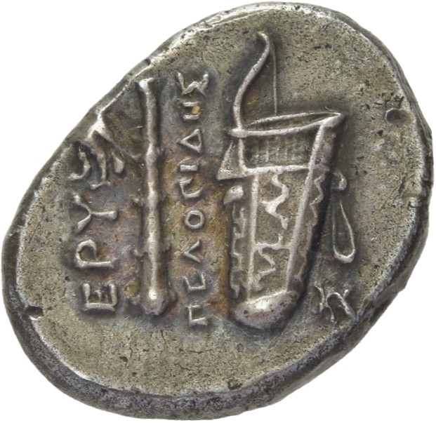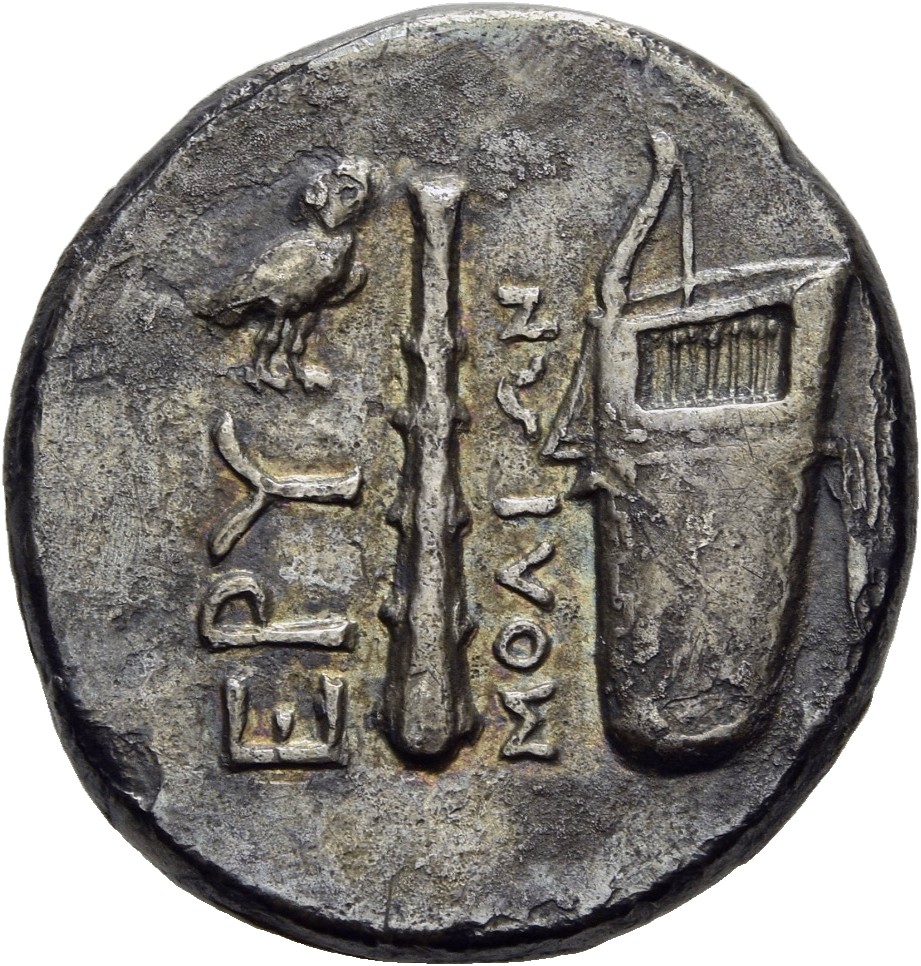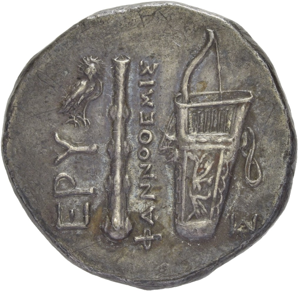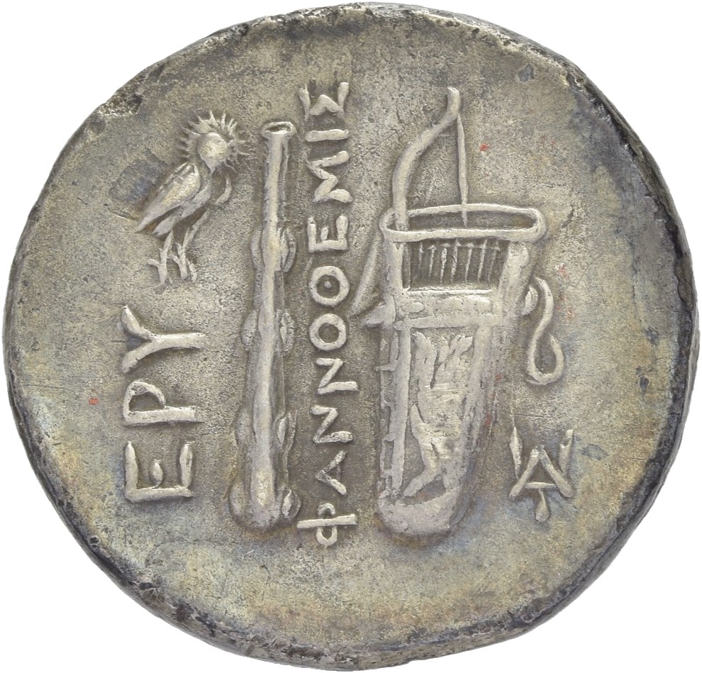 Bow in gorytos (bow case) and club; in left field owl -[en]
