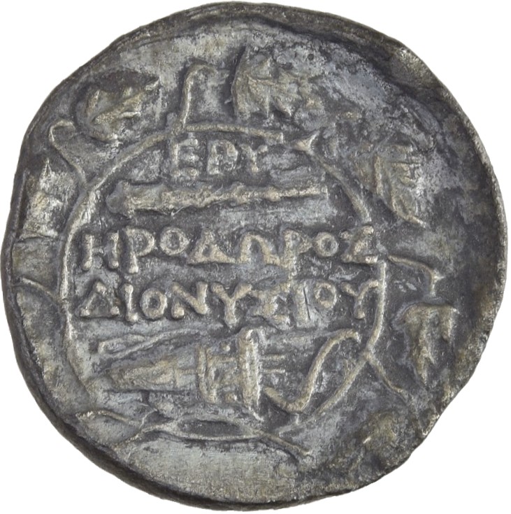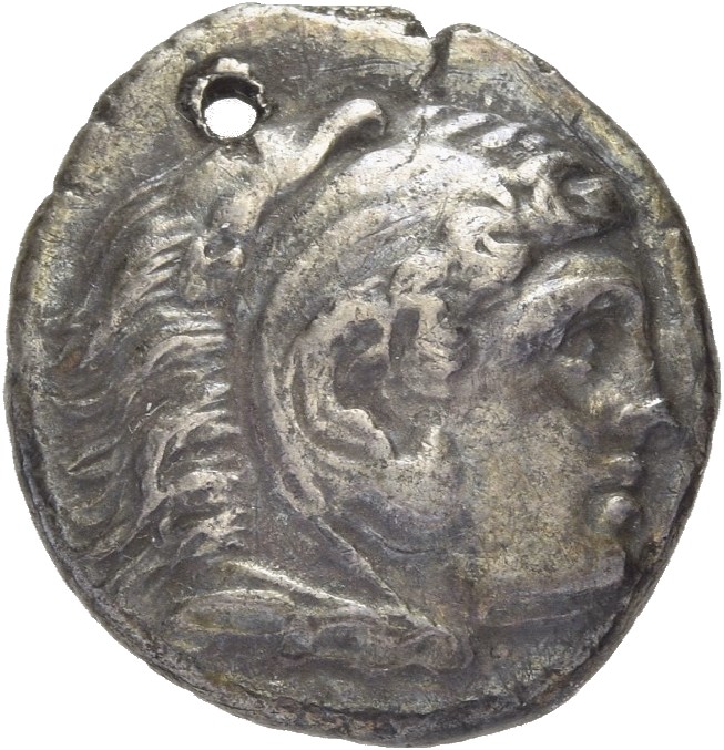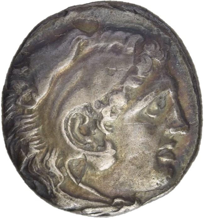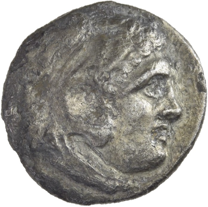 Sağda aslan postu giymiş sakalsız Herakles başı