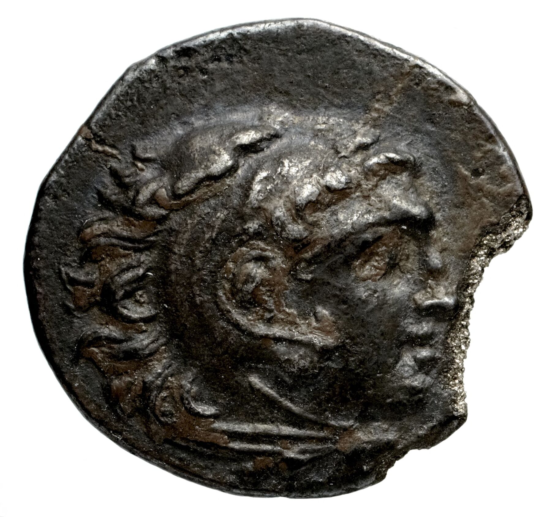 Sağda aslan postu giymiş sakalsız Herakles başı