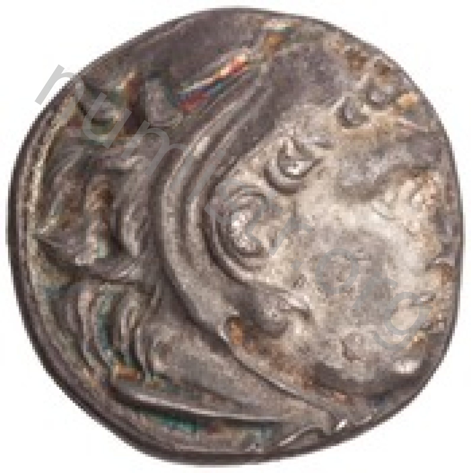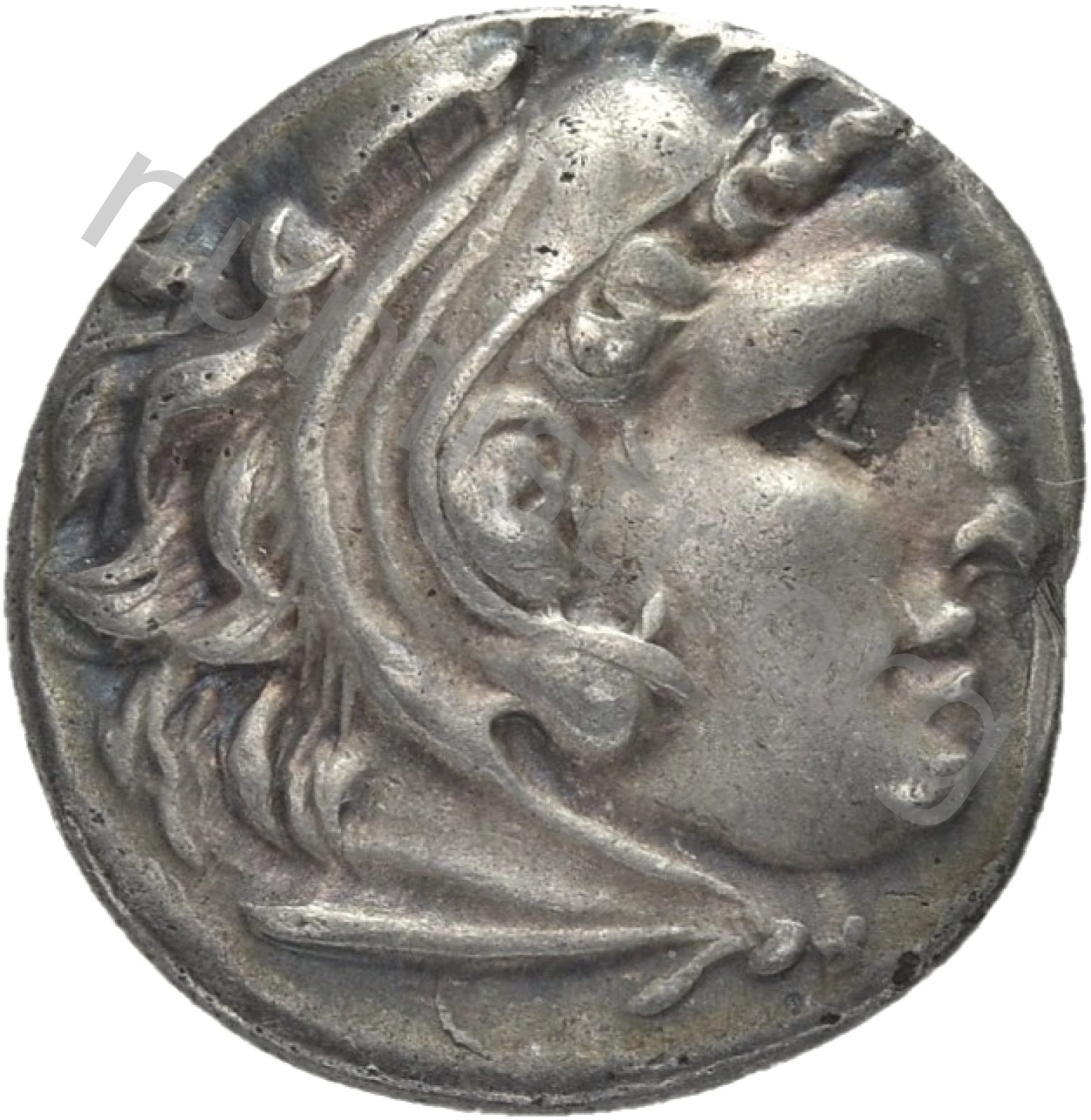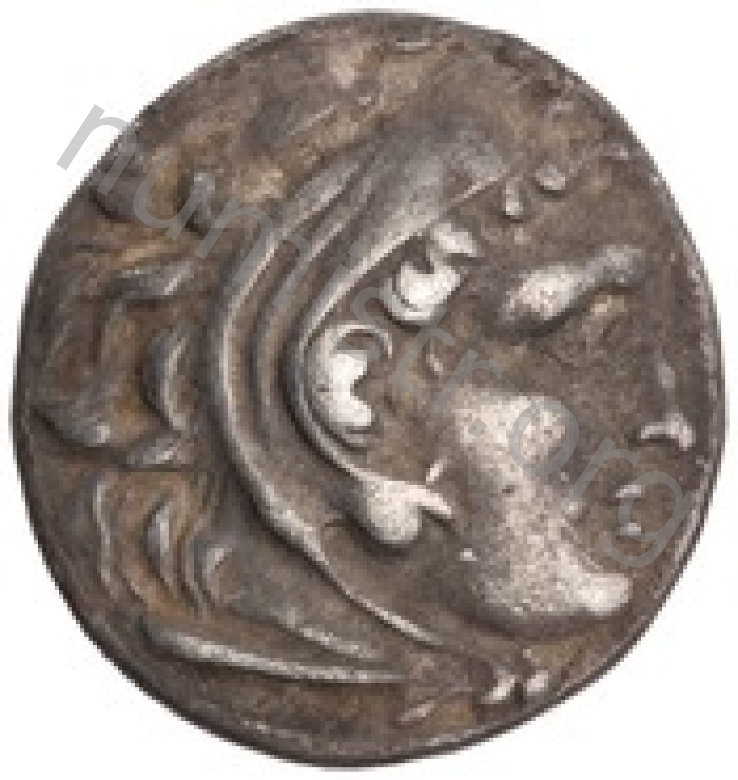 Head of beardless Heracles right wearing lion skin headdress -[en]