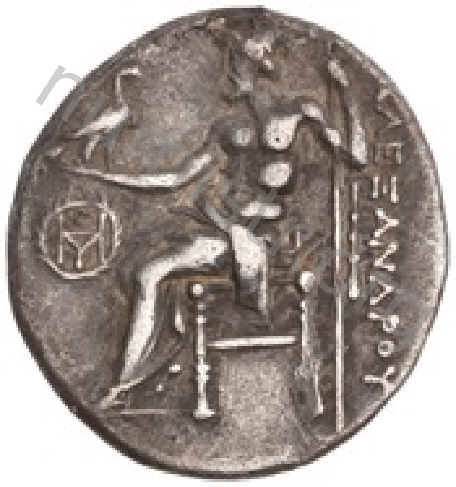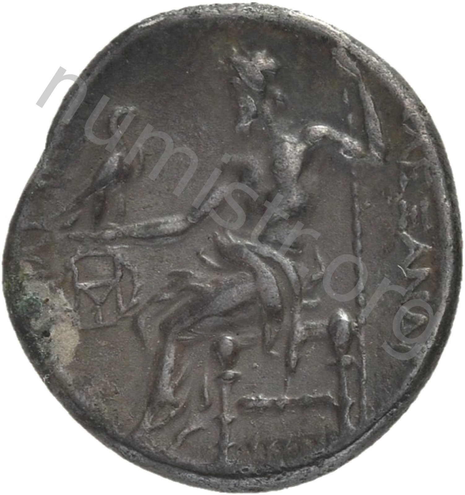 Zeus seated on stool-throne left eagle on outstretched right hand sceptre in left hand -[en]