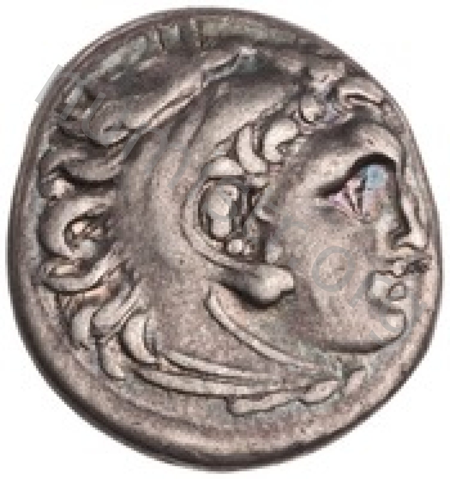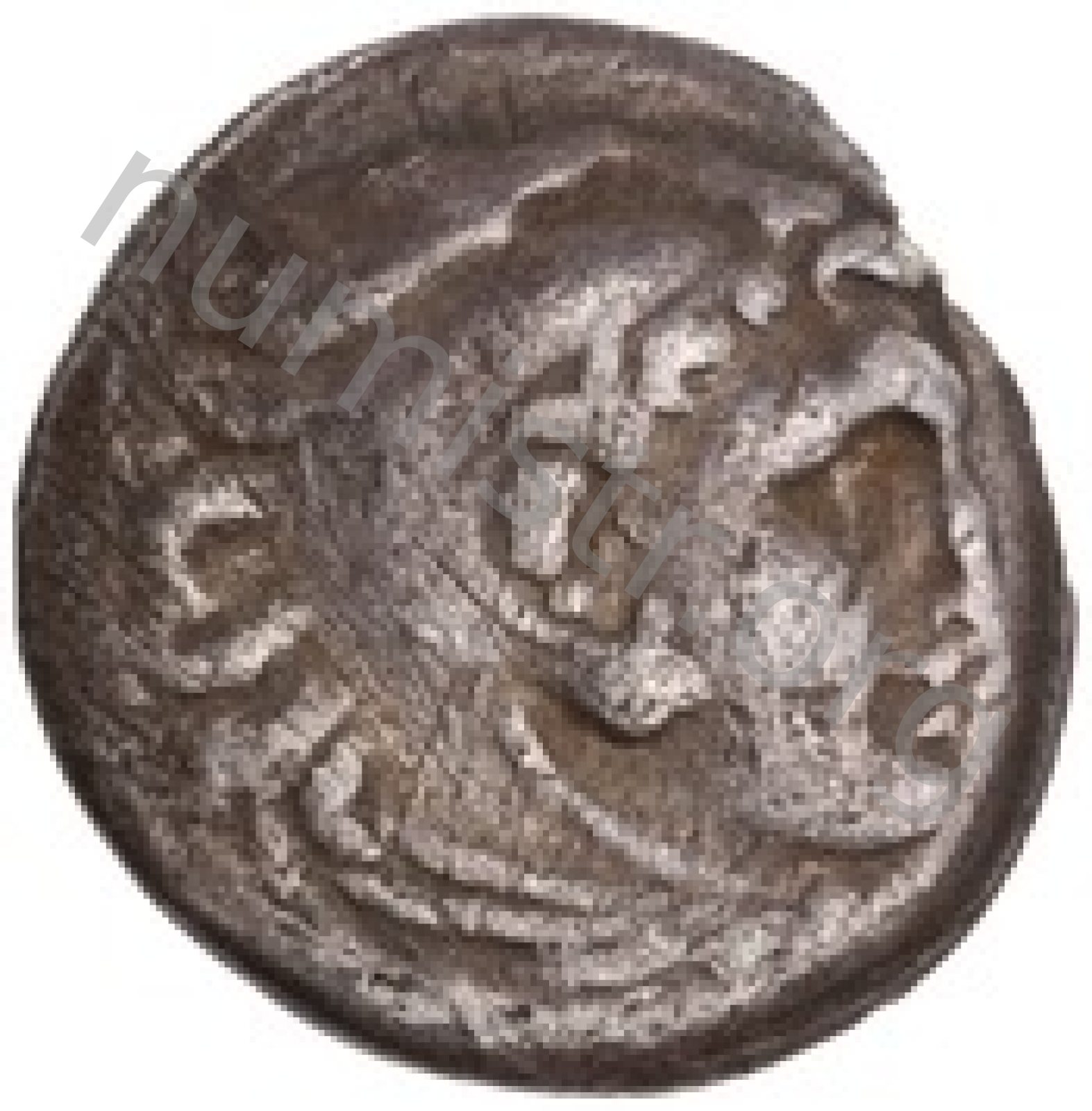 Head of beardless Heracles right wearing lion skin headdress -[en]