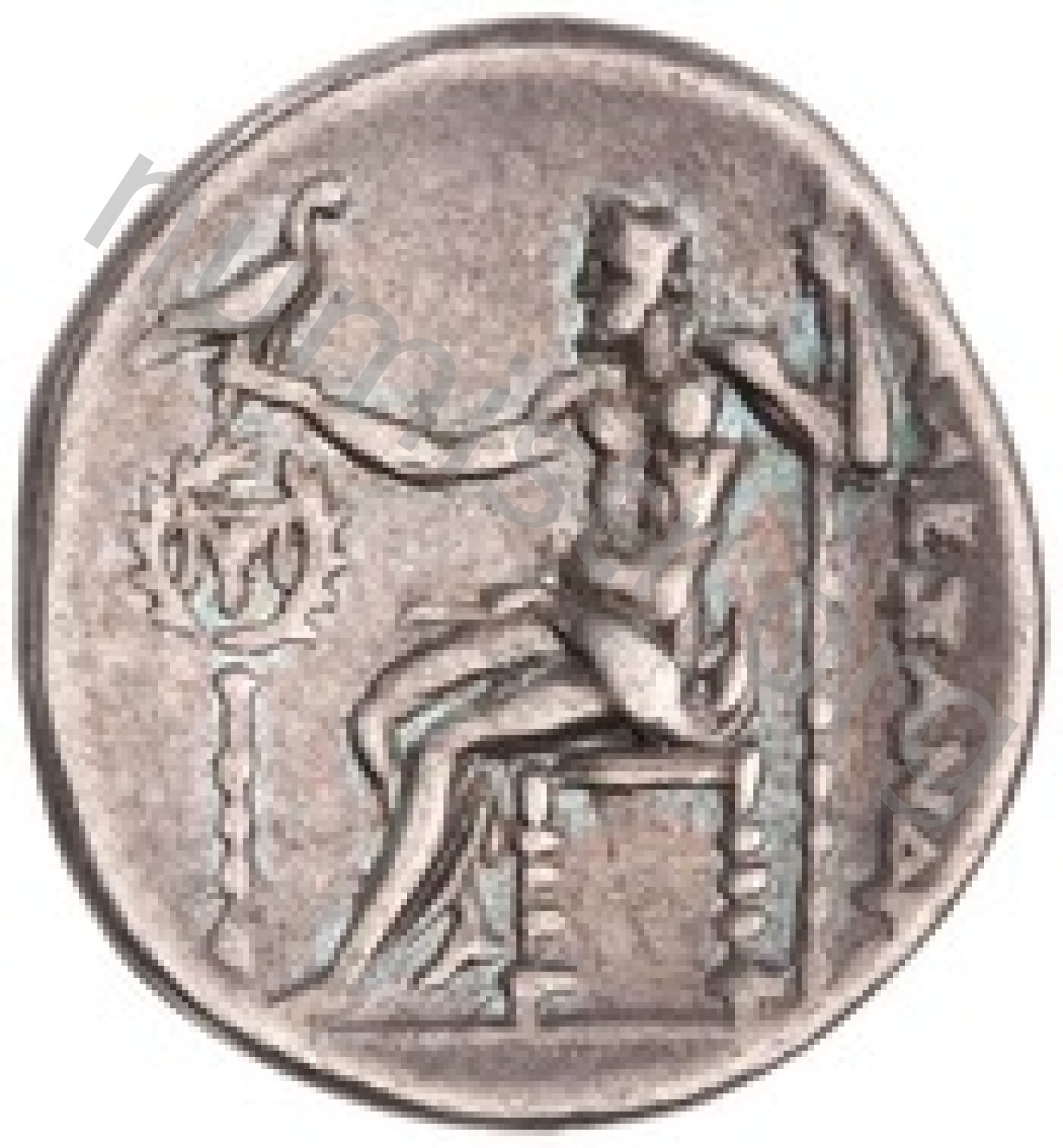 Zeus tabure-tahtta oturuyor sol elinde kartal sağ elinde asa var.
