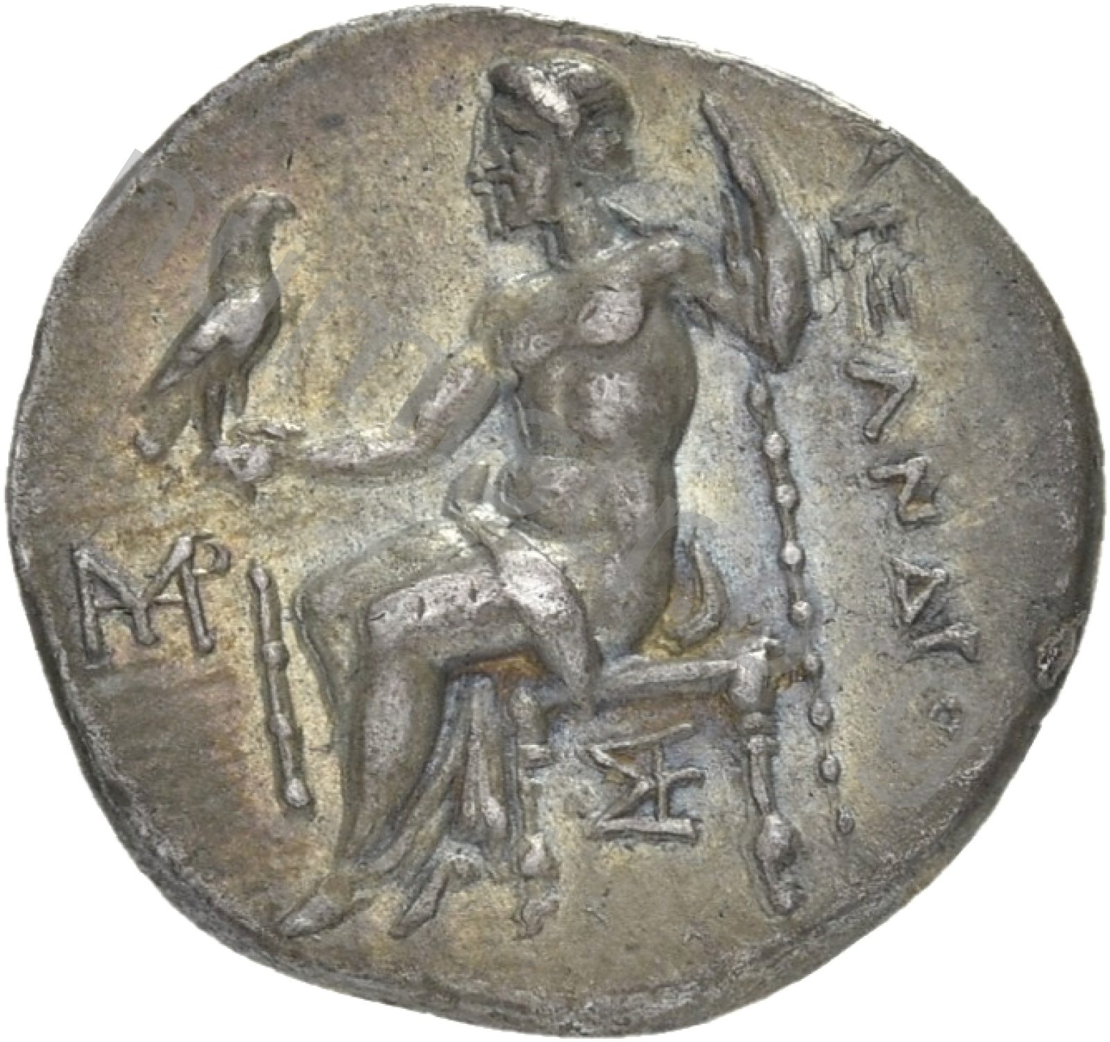 Zeus seated on stool-throne left eagle on outstretched right hand sceptre in left hand -[en]