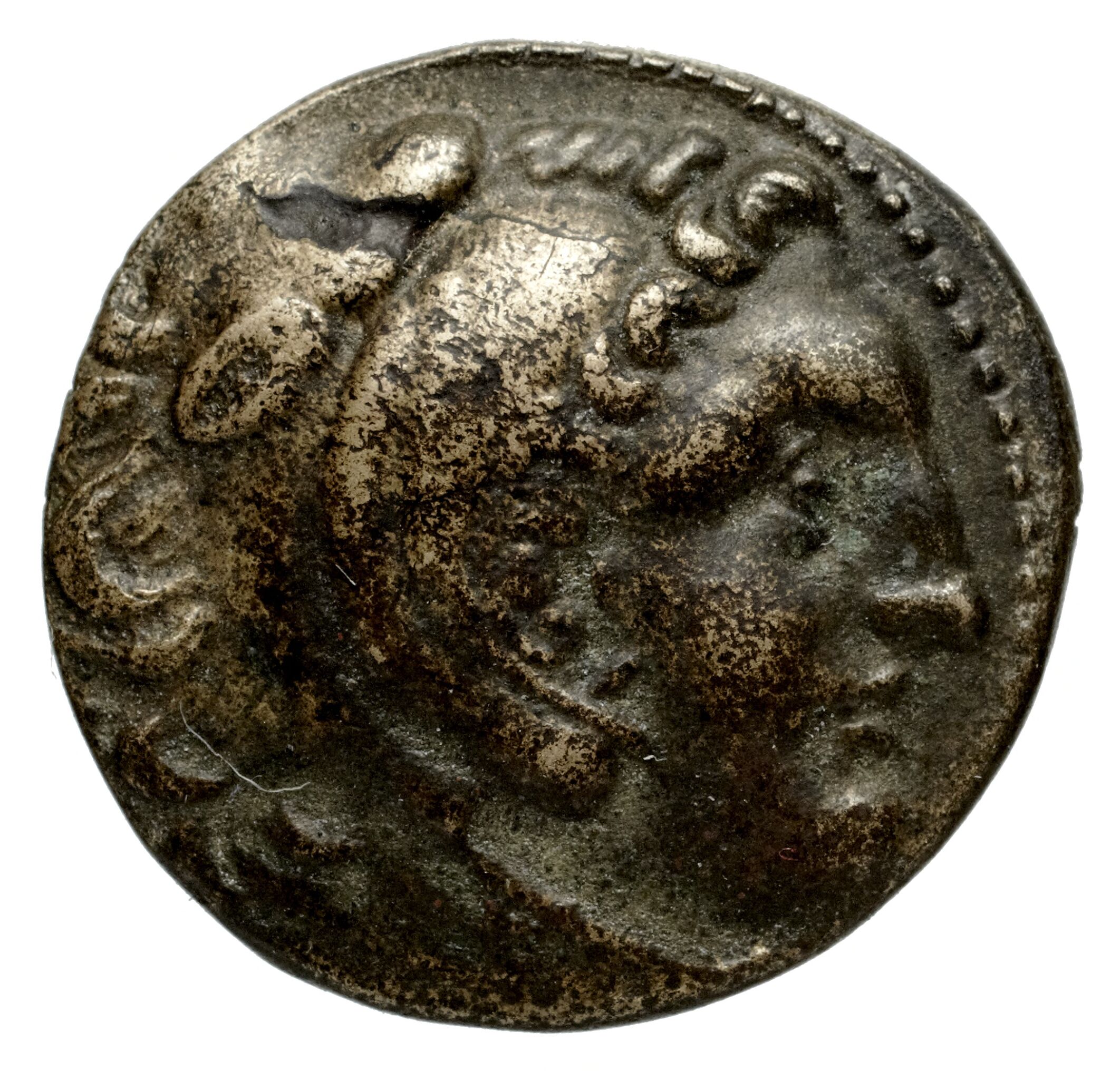 Sağda aslan postu giymiş sakalsız Herakles başı