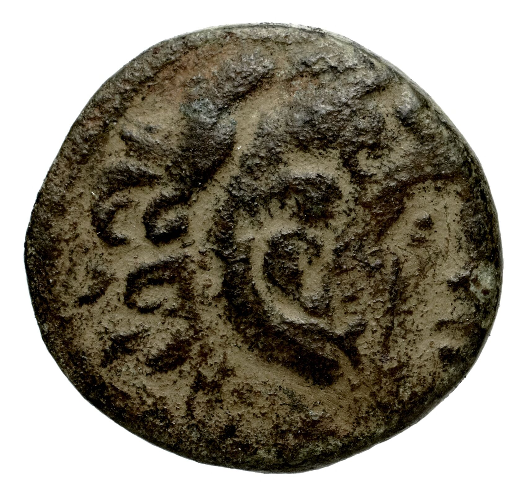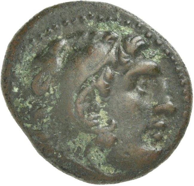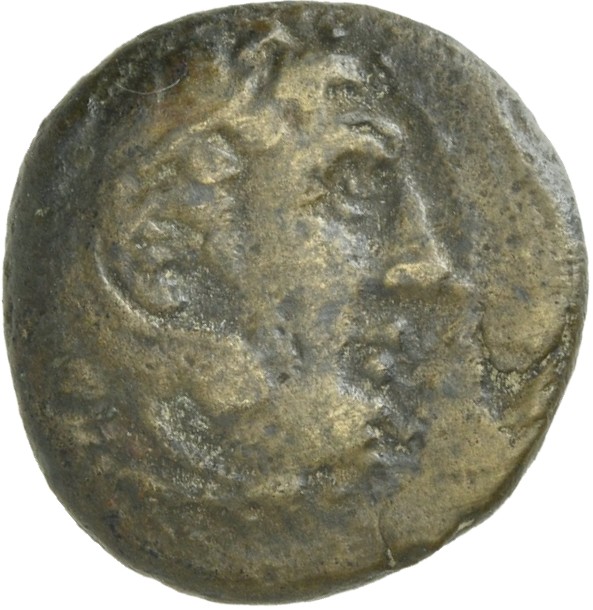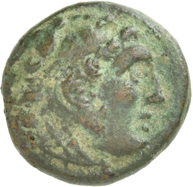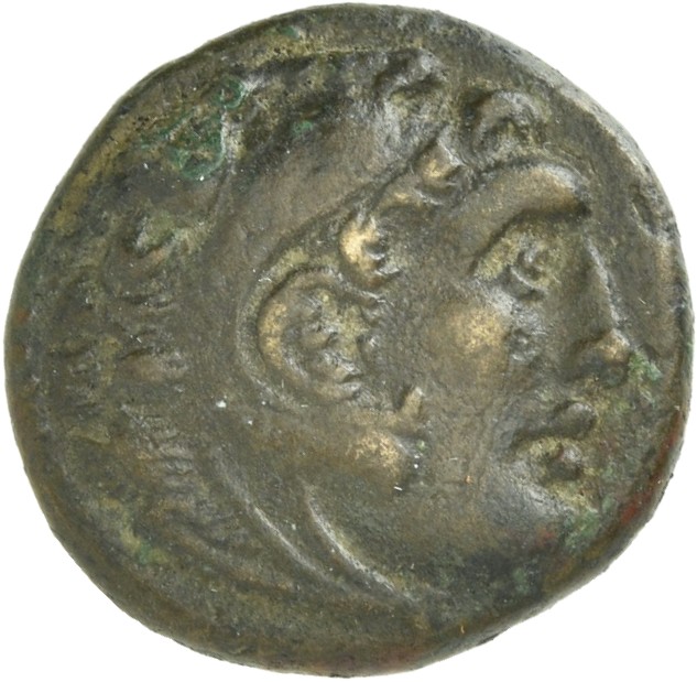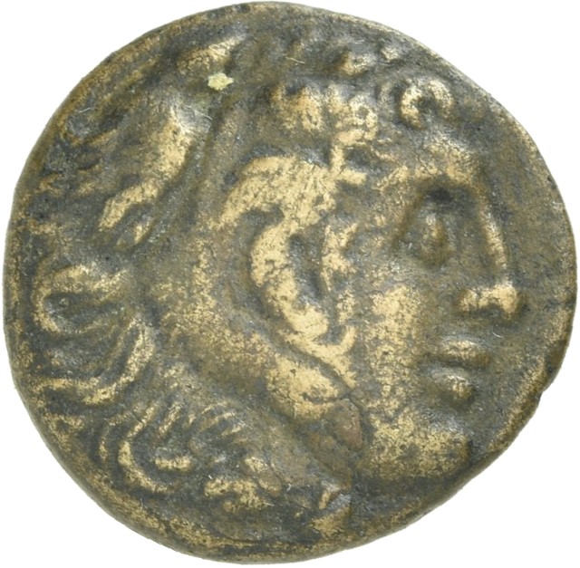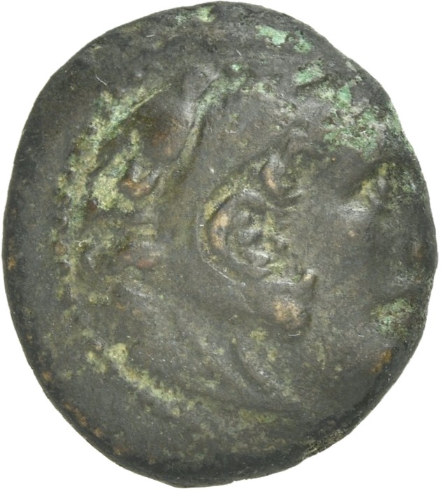 Sağda aslan postu giymiş sakalsız Herakles başı