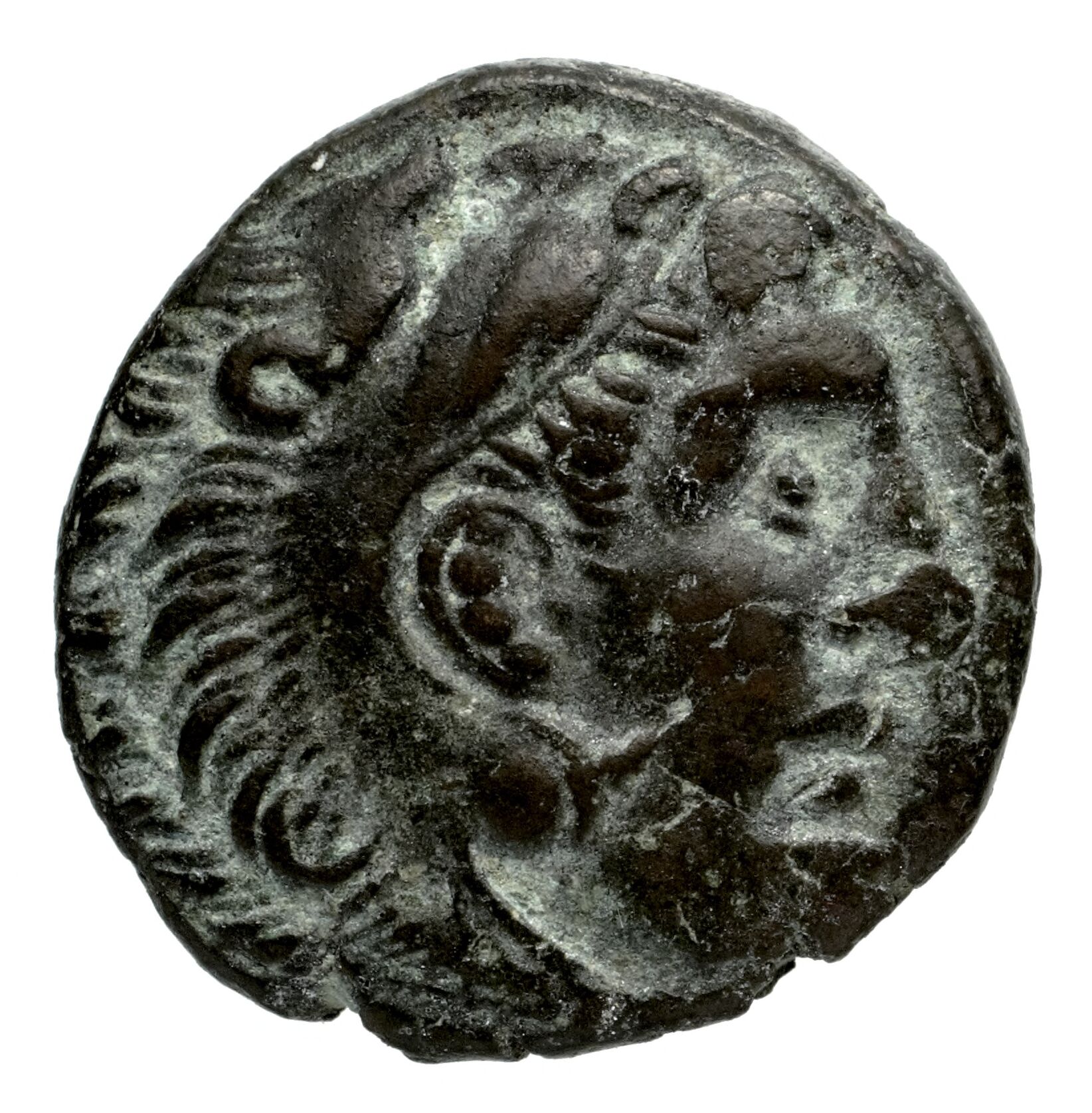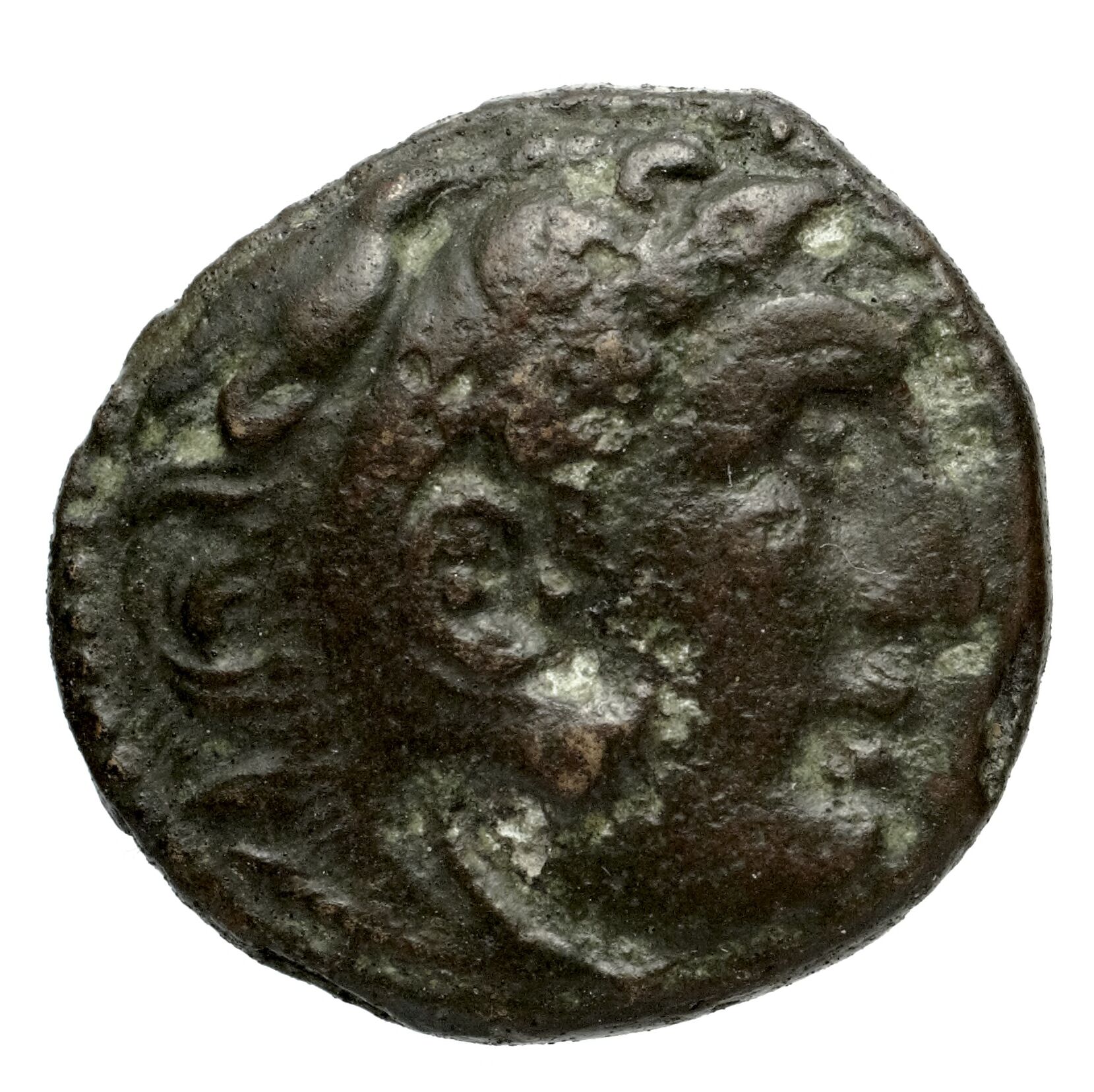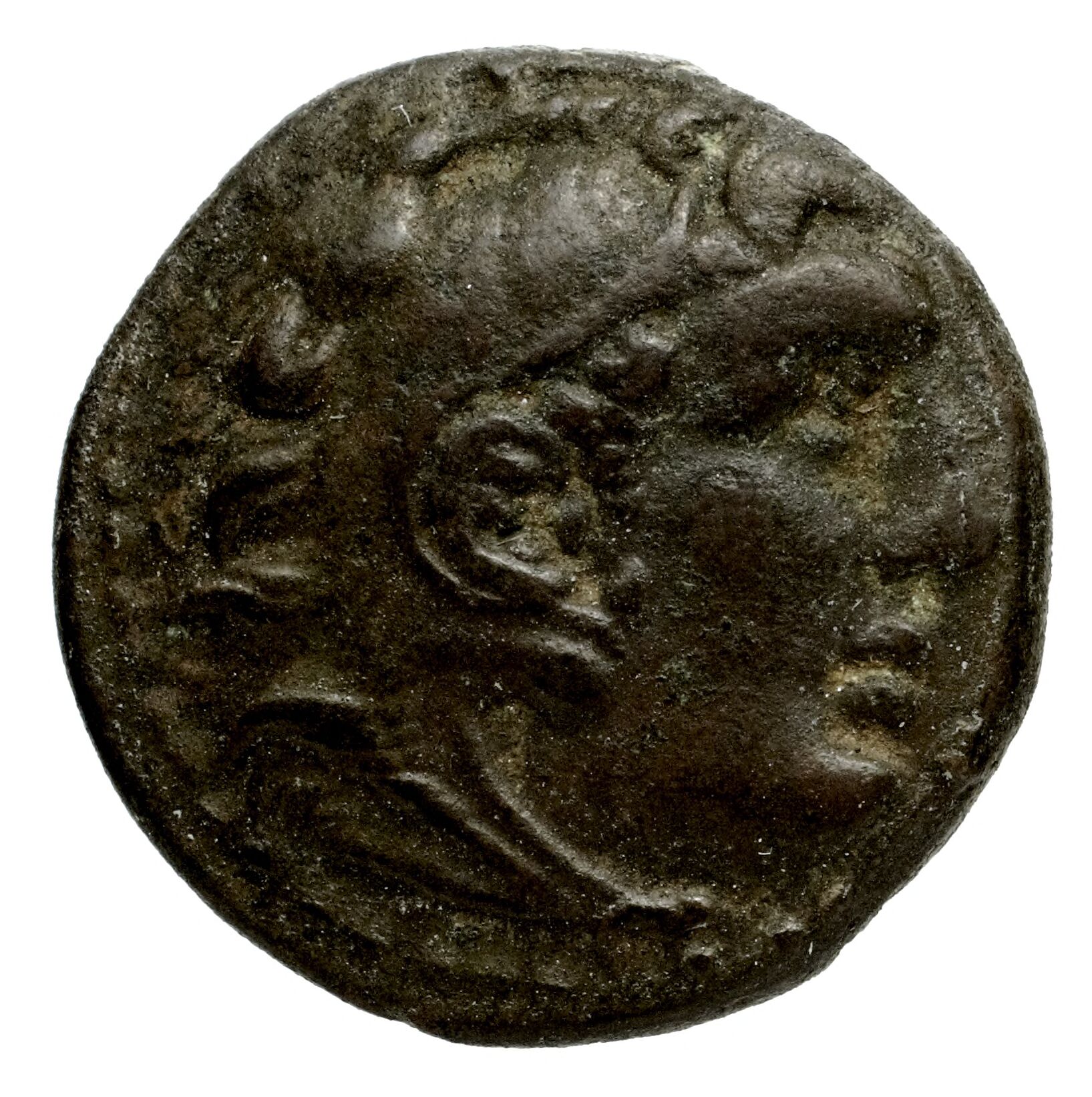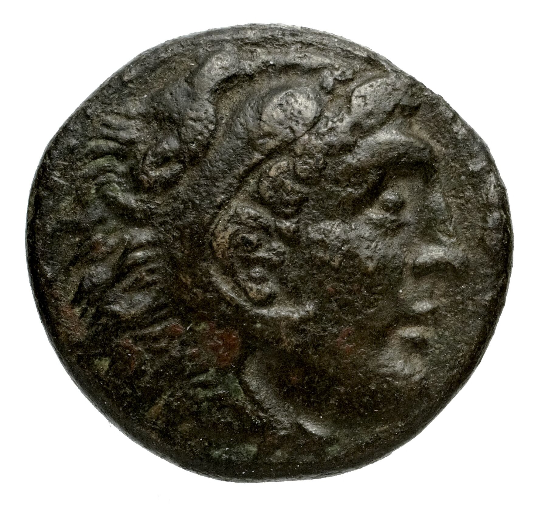 Sağda aslan postu giymiş sakalsız Herakles başı