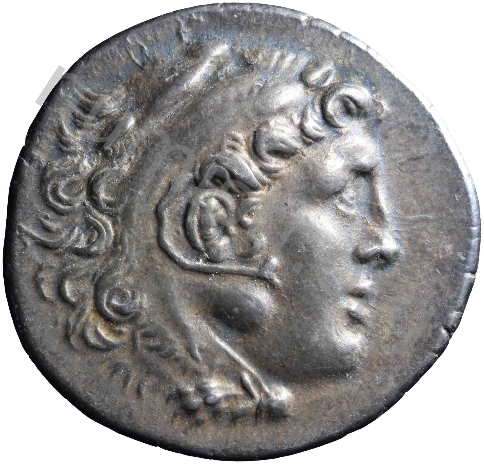 Head of beardless Heracles right wearing lion skin headdress -[en]