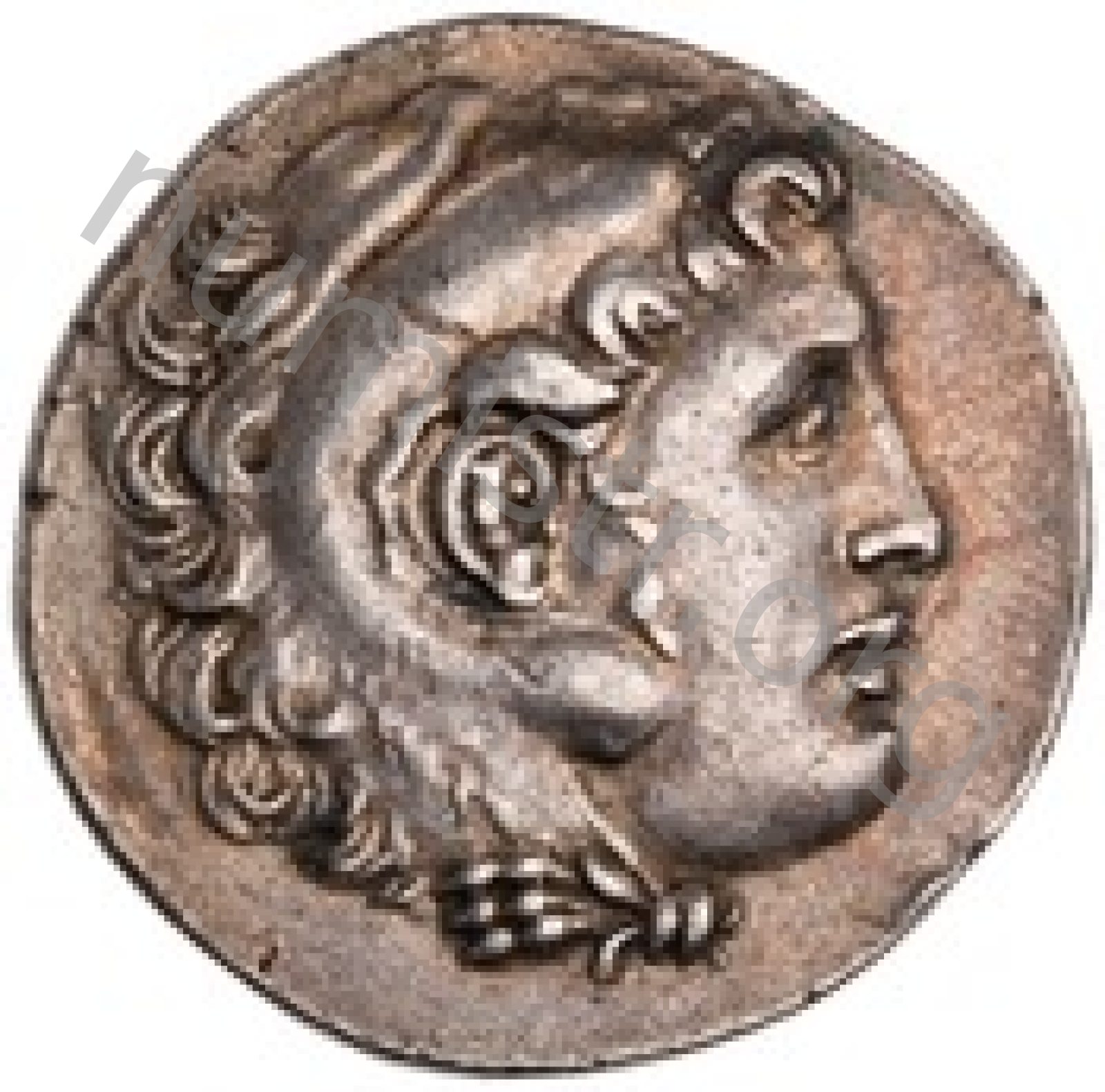 Head of beardless Heracles right wearing lion skin headdress -[en]