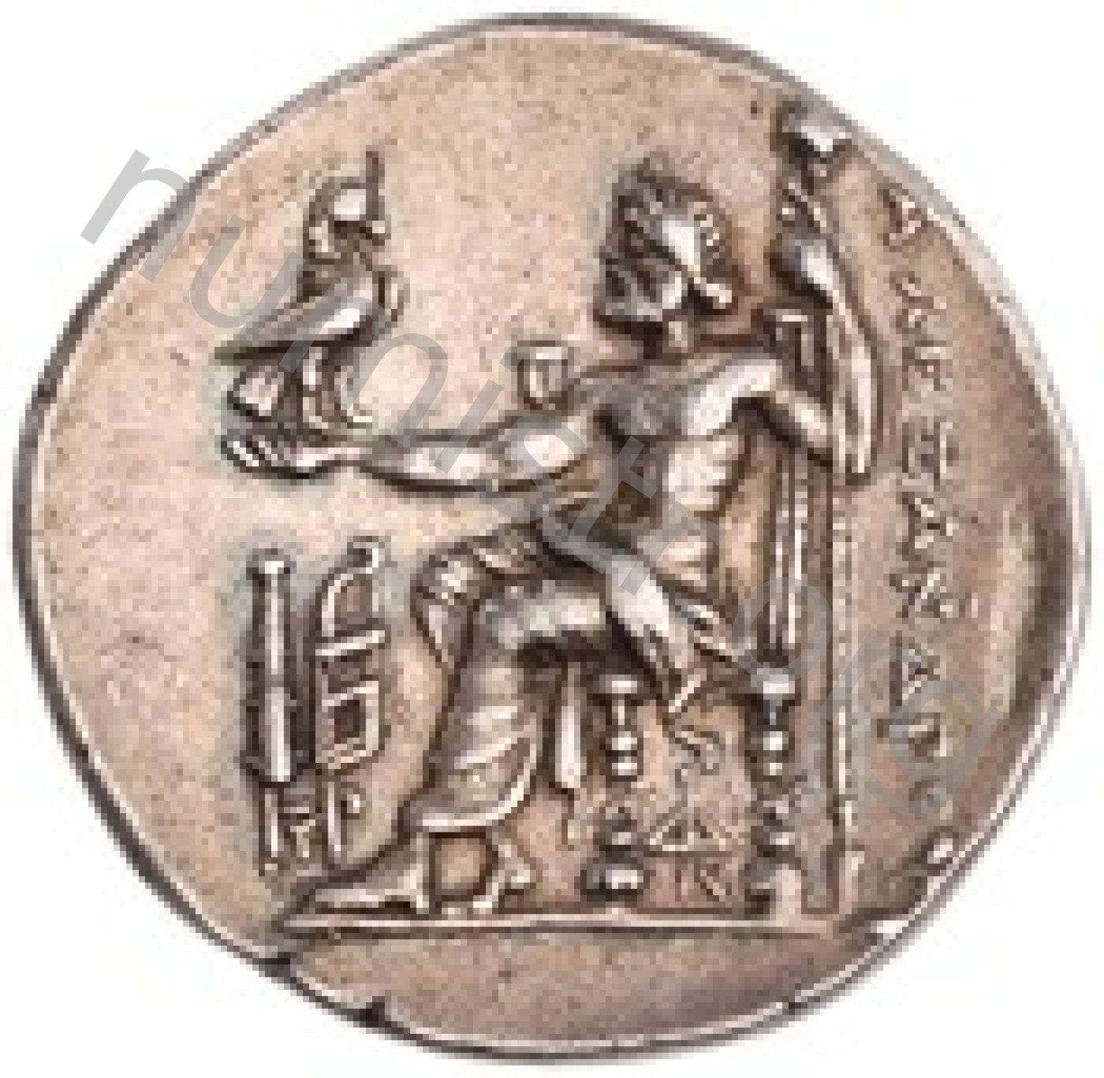 Zeus tabure-tahtta oturuyor sol elinde kartal sağ elinde asa var.