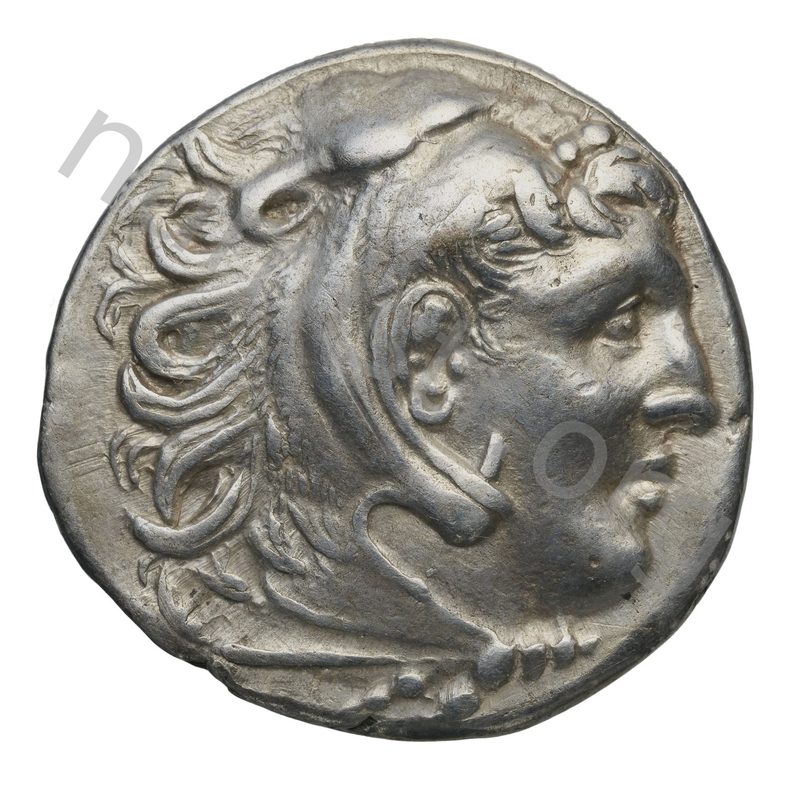 Head of beardless Heracles right wearing lion skin headdress -[en]