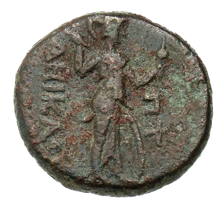 Mızrak ve iğ tutan ayaklarının dibinde yuvarlak bir kalkan tutan Athena llias'ın arkaik figürü