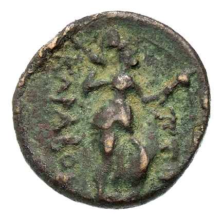 Archaic figure of Athena llias advancing holding spear and spindle; at her feet round shield -[en]
