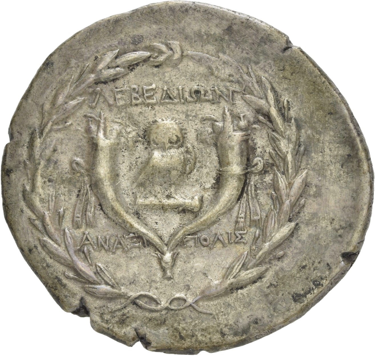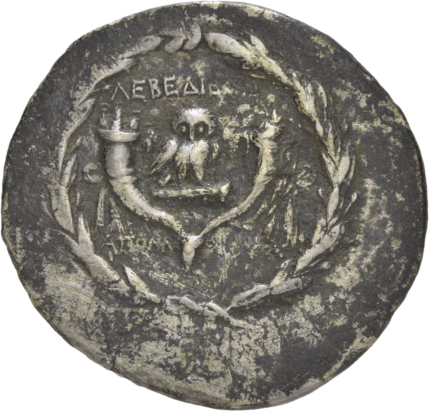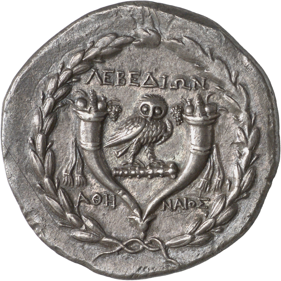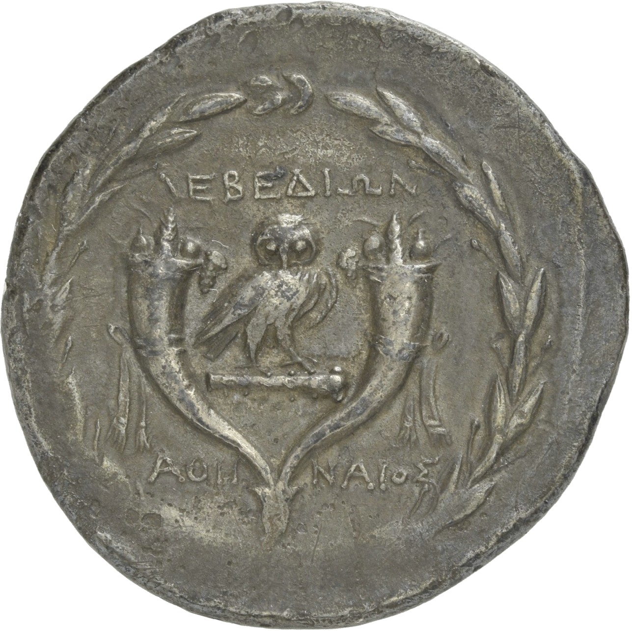 Owl on a club head facing in a double cornucopia decorated with ribbons; all in a laurel wreath -[en]